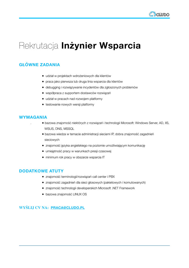 ! Rekrutacja Inżynier Wsparcia GŁÓWNE ZADANIA ● udział w projektach wdrożeniowych dla klientów ● praca jako pierwsza lub druga linia wsparcia dla klientów ● debugging i rozwiązywanie incydentów dla zgłoszonych problemów ● współpraca z supportem dostawców rozwiązań ● udział w pracach nad rozwojem platformy ● testowanie nowych wersji platformy WYMAGANIA . ● bazowa znajomość niektórych z rozwiązań i technologii Microsoft: Windows Server, AD, IIS, ● znajomość języka angielskiego na poziomie umożliwiającym komunikację ● umiejętność pracy w warunkach presji czasowej ● minimum rok pracy w obszarze wsparcia IT WSUS, DNS, MSSQL ● bazowa wiedza w temacie administracji sieciami IP, dobra znajomość zagadnień sieciowych DODATKOWE ATUTY ● znajomość terminologii/rozwiązań call center i PBX ● znajomość zagadnień dla sieci głosowych (pakietowych i komutowanych) ● znajomość technologii developerskich Microsoft .NET Framework ● bazowa znajomość LINUX OS WYŚLIJ CV NA: [email protected]