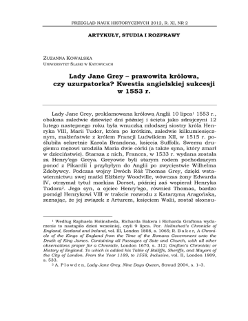 PRZEGLĄD NAUK HISTORYCZNYCH 2012, R. XI, NR 2 ARTYKUŁY, STUDIA I ROZPRAWY ZUZANNA KOWALSKA UNIWERSYTET ŚLĄSKI W KATOWICACH Lady Jane Grey – prawowita królowa, czy uzurpatorka? Kwestia angielskiej sukcesji w 1553 r. Lady Jane Grey, proklamowana królową Anglii 10 lipca1 1553 r., obalona zaledwie dziewięć dni później i ścięta jako zdrajczyni 12 lutego następnego roku była wnuczką młodszej siostry króla Henryka VIII, Marii Tudor, która po krótkim, zaledwie kilkumiesięcznym, małżeństwie z królem Francji Ludwikiem XII, w 1515 r. poślubiła sekretnie Karola Brandona, księcia Suffolk. Swemu drugiemu mężowi urodziła Maria dwie córki (a także syna, który zmarł w dzieciństwie). Starsza z nich, Frances, w 1533 r. wydana została za Henry’ego Greya. Greyowie byli starym rodem pochodzącym ponoć z Pikardii i przybyłym do Anglii po zwycięstwie Wilhelma Zdobywcy. Podczas wojny Dwóch Róż Thomas Grey, dzięki wstawiennictwu swej matki Elżbiety Woodville, wówczas żony Edwarda IV, otrzymał tytuł markiza Dorset, później zaś wspierał Henryka Tudora2. Jego syn, a ojciec Henry’ego, również Thomas, bardzo pomógł Henrykowi VIII w trakcie rozwodu z Katarzyną Aragońską, zeznając, że jej związek z Arturem, księciem Walii, został skonsu- Według Raphaela Holinsheda, Richarda Bakera i Richarda Graftona wydarzenie to nastąpiło dzień wcześniej, czyli 9 lipca. Por. Holinshed’s Chronicle of England, Scotland and Ireland, vol. III, London 1808, s. 1065; R. B a k e r, A Chronicle of the Kings of England from the Time of the Romans Government unto the Death of King James. Containing all Passages of Sate and Church, with all other observations proper for a Chronicle, London 1670, s. 312; Grafton’s Chronicle; or History of England. To which is added his Table of Bailiffs, Sheriffs, and Mayors of the City of London. From the Year 1189, to 1558, Inclusive, vol. II, London 1809, s. 533. 2 A. P l o w d e n, Lady Jane Grey. Nine Days Queen, Stroud 2004, s. 1–3. 1 6 ZUZANNA KOWALSKA mowany. Zaskarbił sobie tym wdzięczność króla3. Owocem związku Henry’ego Dorseta (tytuł markiza odziedziczył po ojcu w roku swego ślubu, a w 1551 r. otrzymał godność księcia Suffolk) i Frances Brandon były trzy córki – Jane, Katherine i Mary. Najstarsza z nich przeszła do historii jako dziewięciodniowa królowa Anglii. Powszechny jest pogląd, że wyniesienie jej na tron było efektem machinacji Johna Dudleya, księcia Northumberland, wszechwładnego doradcy Edwarda VI, który, w obawie przed utratą wpływów, postanowił doprowadzić do mariażu jednego ze swych synów, Guildforda, z lady Jane, a następnie skłonić konającego monarchę do uczynienia jej następczynią tronu. Warto jednak bliżej przyjrzeć się źródłom i spróbować odpowiedzieć na pytanie, czy w istocie tak było i, co równie ważne, czy proklamacja Jane Grey była legalna. Trzeci Akt Sukcesji wydany przez króla i zatwierdzony przez parlament w 1544 r. w sposób następujący rozwiązywał kwestię sukcesji po Henryku VIII: pierwszeństwo w dziedziczeniu korony przyznano królewskiemu synowi Edwardowi, a w wypadku jego bezpotomnej śmierci i braku potomstwa króla Henryka w małżeństwie z Katarzyną Parr, następstwo na angielskim tronie przypadało kolejno Marii, Elżbiecie oraz dzieciom najpierw starszej, a następnie młodszej z sióstr. Równocześnie obie córki króla wciąż miały status bastardów, co rodziło dość istotne konsekwencje (czy potomkowie z nieprawego łoża mają prawo dziedziczyć?). Dalszymi pretendentami byli potomkowie młodszej z sióstr Henryka VIII, Marii. Spadkobiercy Małgorzaty Tudor, niegdyś królowej Szkocji, zostali odsunięci od tronu, by nie dopuścić obcokrajowców do zawładnięcia angielską koroną. Od początku 1553 r. Edward VI chorował. Pomimo pewnej poprawy stanu zdrowia króla, która nastąpiła w marcu i pozwoliła mu otworzyć sesję parlamentu, niebawem stało się jasne, że młody monarcha nie przeżyje. W maju medycy przewidywali jego śmierć w ciągu trzech miesięcy4. Kwestia sukcesji angielskiego tronu stała się ponownie aktualna – szybciej niż można się było tego spodziewać. Sprawa była tym poważniejsza, że w grę wchodziły nie tylko sprawy czysto personalne, ale również religijna przyszłość państwa. Wiadomo było, że przewidziana w testamencie Henryka VIII 3 L. d e L i s l e, The Sisters Who Would Be Queen. The Tragedy of Mary, Katherine and Lady Jane Grey, London 2009, s. 4–5. 4 W.K. J o r d a n, Edward VI: The Threshold of Power. The Dominance of the Duke of Northumberland, London 1970, s. 514. Lady Jane Grey – prawowita królowa, czy uzurpatorka?... 7 sukcesja jego najstarszej córki Marii doprowadzi do rekatolizacji Anglii po kilkuletnim okresie rządów proreformatorsko nastawionego Edwarda i jego opiekunów. W takich okolicznościach powstał dokument zatytułowany My Device for the Succession. Pierwotna wersja spisana została własnoręcznie przez Edwarda, być może, jak sugeruje Alison Plowden, już na początku 1553 r. lub nawet wcześniej5. Eric Ives zwraca uwagę, że dukt pisma nie wskazuje na bardzo zły stan zdrowia autora, a treść na świadomość zbliżającej się śmierci6, co także przemawia za początkiem roku jako datą stworzenia dokumentu. Niejasne pozostają okoliczności powstania Device. Derek Wilson twierdzi, że jest mało prawdopodobne, by król korzystał z czyjejś rady czy nawet konsultował swój projekt7. Przekonany o przysługujących mu prerogatywach dał wyraz własnej woli. Wielu badaczy przychyla się jednak ku tezie, że książę Northumberland nakłonił monarchę do dokonania zmian w kolejności dziedziczenia tronu8. To z kolei świadczyć ma o późniejszym sporządzeniu dokumentu, które towarzyszyłoby przygotowaniom do ślubu lady Jane Grey z Guildfordem Dudleyem9. Tymczasem według Erica Ivesa początkowo był to jedynie często zmienian