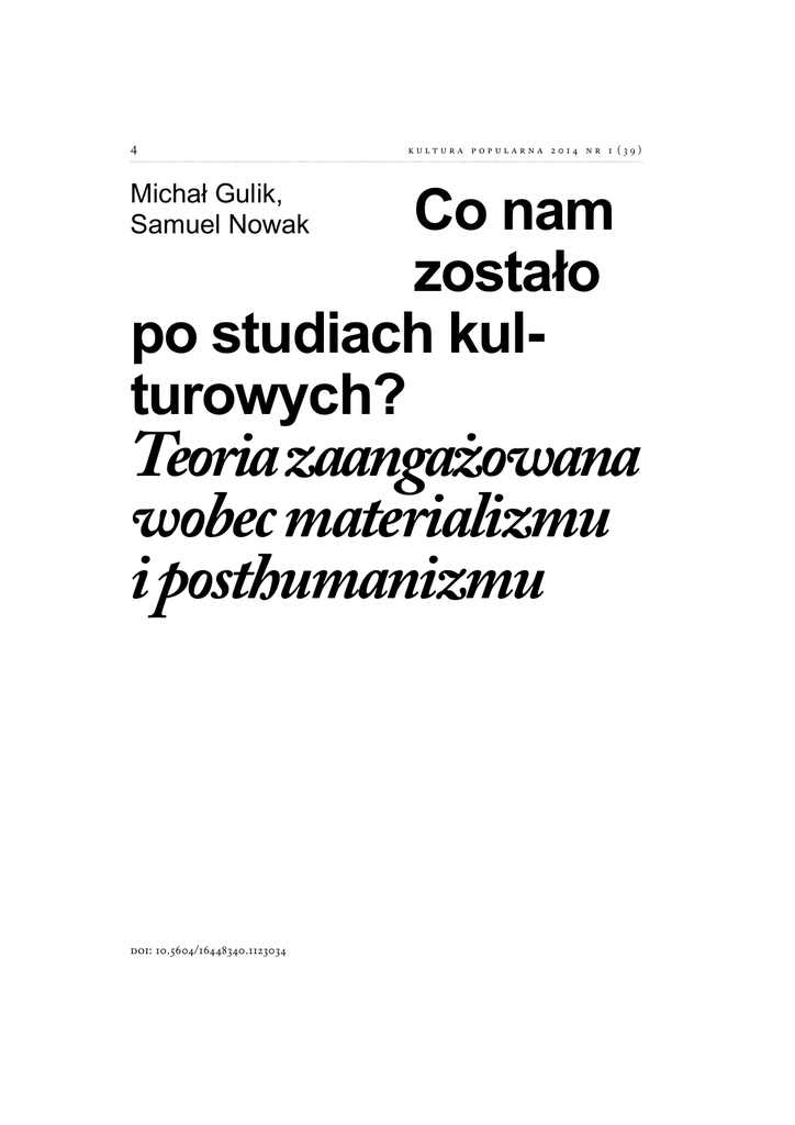 4 kultura popularna 2014 nr 1 (39) &RQDP ]RVWDáR SRVWXGLDFKNXO WXURZ\FK" 0LFKDá*XOLN 6DPXHO1RZDN Teoria zaangażowana wobec materializmu i posthumanizmu DOI: 10.5604/16448340.1123034 M i c h a ł G u l i k , S a m u e l N o wa k C o n a m z o s ta ł o p o s t u d i a c h k u lt u r o w y c h ? Studia kulturowe to współcześnie bardzo nieostry termin, którym zwykło się określać szeroki wachlarz perspektyw i teorii, sytuujących się na pograniczach bardziej ugruntowanych dyscyplin: literaturoznawstwa, socjologii krytycznej, medioznawstwa, niektórych nurtów filozofii (których jednak tradycyjna filozofia nie traktuje zbyt poważnie) oraz historii idei. Ten stan rzeczy jest w dużej mierze konsekwencją fuzji teoretycznej, do której doszło w obrębie amerykańskiej humanistyki w latach 80. ubiegłego wieku. Mamy tu na myśli wyłonienie się poststrukturalizmu, będącego amerykańskim rozwinięciem i przepracowaniem europejskiego strukturalizmu oraz dekonstrukcji. W tym samym czasie do USA dotarły także prace oraz badacze rozwijający macierzysty projekt studiów kulturowych związanych ze szkołą z Birmingham. Opracowania i koncepcje te funkcjonują obecnie pod zwięzłym szyldem „teorii” (theory), tyleż poręcznym, co mocno uogólniającym. W naszym artykule, będącym wprowadzeniem do specjalnego wydania „Kultury Popularnej”, chcielibyśmy przyjrzeć się właśnie brytyjskiej tradycji teorii kultury zainicjowanej w Birmingham. Szkoła ta, rozwijana w ramach Centre for Contemporary Cultural Studies, swój największy rozkwit przeżywała w latach 70. i 80., a jej dorobek uległ następnie dyseminacji w obrębie brytyjskich, australijskich i wreszcie amerykańskich uniwersytetów. Nie zamierzamy tutaj jednak rekonstruować historii British cultural studies. Chcielibyśmy raczej zastanowić się nad tym, czy nurt ten stanowi istotny rezerwuar badawczy w kontekście przemian współczesnej humanistyki czy też może przynależy już do historii nauk o kulturze. Warto pamiętać, że to właśnie studia kulturowe wygenerowały fundamenty dla akademickiego postmodernizmu i poststrukturalizmu; ich konsekwentny konstruktywizm społeczny połączony ze społeczną wrażliwością (Joanna Zylińska pisze przy tej okazji o etyce troski) okazał się wygodną platformą dla rozkwitu kolejnych wariacji tekstualizmu, analizy dyskursywnej i dekonstrukcji. Czy zatem w dobie wyczerpania się humanistyki postmodernistycznej studia kulturowe, genetycznie obciążone tekstualizmem, są w stanie wykonać jeszcze jakąkolwiek interesującą teoretycznie robotę? I jak należy rozumieć to pogmatwanie teorii, skoro cultural studies to coraz częściej hasło rozpoznawcze stanowisk pozbawionych intelektualnej dyscypliny oraz rygoru właściwego osiadłym i ustabilizowanym dziedzinom badań? Czy każdy może być kulturoznawcą? Nie zamierzamy tutaj atakować poststrukturalizmu, zdajemy sobie jednak sprawę zarówno z jego ograniczeń, jak i wielu niespełnionych obietnic. Proponujemy raczej, aby przyjrzeć się studiom kulturowym z perspektywy trzech wybranych zagadnień, które uznajemy za szczególnie interesujące w bieżących debatach teoretycznych. Następnie postaramy się wskazać na istniejące w kulturoznawstwie zasoby badawcze, których wykorzystanie, naszym zdaniem, może się okazać intelektualnie produktywne. Nie chcemy tutaj wskrzeszać niejednokrotnie wyśmiewanej triady rasa – klasa – płeć ani przeszczepiać poszczególnych ustaleń, rozumowań i metod do nowych sytuacji. Trzy interesujące nas kategorie to posthumanizm, materializm i społeczne zaangażowanie. Traktujemy je jako relewantne parametry najnowszych debat humanistycznych i staramy się wydobyć ich ekwiwalenty z dorobku brytyjskiego kulturoznawstwa. Musimy ponadto podkreślić, że nasza słabość do studiów kulturowych ma nieco wybiórczy charakter: kształceni byliśmy nie tyle na klasycznych opracowaniach powstałych w CCCS w gorączkowych latach 70. XX wieku, ale głównie na przewrotnych analizach kultury popularnej, będących akademicką specjalnością m.in. Johna Fiske’a, Henry’ego Jenkinsa oraz Joke Hermes 5 0LFKDá*XOLN± GRNWRUDQWZ,QVW\WXFLH 6]WXN$XGLRZL]XDOQ\FK 8QLZHUV\WHWX-DJLHOORĔ VNLHJR3U]\JRWRZXMH UR]SUDZĊGRNWRUVNą GRW\F]ąFą]DJDGQLHĔ QRZHJRPDWHULDOL]PX (PDLOPLFKDOJXOLN# JPDLOFRP 6DPXHO1RZDN± NXOWXUR]QDZFDLPHGLR ]QDZFD3UDFRZQLN QDXNRZ\,QVW\WXWX 6RFMRORJLL8QLZHUV\ WHWX-DJLHOORĔVNLHJR 1LHGDZQRXND]DáDVLĊ MHJRNVLąĪND6HNVXDOQ\ NDSLWDá8QLYHUVLWDV (PDLOVDPXHO QRZDN#XMHGXSO 6 kultura popularna 2014 nr 1 (39) i powstających od połowy lat 80. ubiegłego wieku. Stąd wyraźna obecność kategorii przyjemności, naszym zdaniem, współcześnie niedocenianej i zbyt łatwo utożsamianej z ideologiczną manipulacją konsumpcjonizmu. W tym sensie studia kulturowe są dla nas raczej pewną postawą badawczą – mającą jednak własną intelektualną biografię – niż korpusem akademickiej literatury. Ten szczególny rodowód (za ilustrację którego może posłużyć dorobek i życie Stuarta Halla) okazuje się więc point du caption skupiającym rozległe nieraz głosy i ustalenia w obrębie jednej ramy teoretycznej. Wpisana w projekt studiów kulturowych teoretyczna inkluzywność niesie ze sobą ryzyko rozmycia się w gąszczu teorii; stąd potrzeba umiejscowienia ich na szerszej mapie nowoczesnej humanistyki. 3RVWKXPDQL]P „Posthumanizm” to pojęcie równie problematyczne, jak „studia kulturowe”. Obejmuje ono wiele zjawisk, nurtów badawczych, a także praktyk artystycznych, które kwestionują antropocentryczny charakter kultury i poznania. Zalążki posthumanizmu można odnaleźć już w strukturalnej krytyce humanizmu (Foucault); projekcie etyki włączającej w swoją domenę zwierzęta (Singer) czy pracach z zakresu systemów społecznych inspirowanych odkryciami najnowszej biologii ewolucyjnej (Luhmann). O ile jednak krytykę humanizmu uprawianą pod auspic