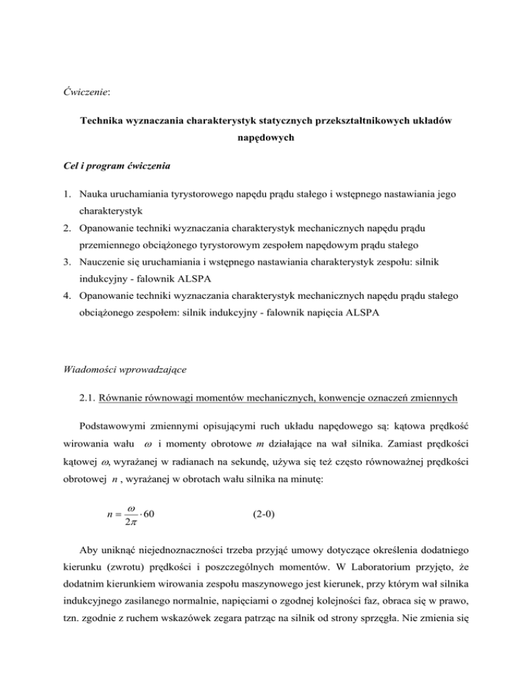 Ćwiczenie: Technika wyznaczania charakterystyk statycznych przekształtnikowych układów napędowych Cel i program ćwiczenia 1. Nauka uruchamiania tyrystorowego napędu prądu stałego i wstępnego nastawiania jego charakterystyk 2. Opanowanie techniki wyznaczania charakterystyk mechanicznych napędu prądu przemiennego obciążonego tyrystorowym zespołem napędowym prądu stałego 3. Nauczenie się uruchamiania i wstępnego nastawiania charakterystyk zespołu: silnik indukcyjny - falownik ALSPA 4. Opanowanie techniki wyznaczania charakterystyk mechanicznych napędu prądu stałego obciążonego zespołem: silnik indukcyjny - falownik napięcia ALSPA Wiadomości wprowadzające 2.1. Równanie równowagi momentów mechanicznych, konwencje oznaczeń zmiennych Podstawowymi zmiennymi opisującymi ruch układu napędowego są: kątowa prędkość wirowania wału ω i momenty obrotowe m działające na wał silnika. Zamiast prędkości kątowej ω, wyrażanej w radianach na sekundę, używa się też często równoważnej prędkości obrotowej n , wyrażanej w obrotach wału silnika na minutę: n= ω ⋅ 60 2π (2-0) Aby uniknąć niejednoznaczności trzeba przyjąć umowy dotyczące określenia dodatniego kierunku (zwrotu) prędkości i poszczególnych momentów. W Laboratorium przyjęto, że dodatnim kierunkiem wirowania zespołu maszynowego jest kierunek, przy którym wał silnika indukcyjnego zasilanego normalnie, napięciami o zgodnej kolejności faz, obraca się w prawo, tzn. zgodnie z ruchem wskazówek zegara patrząc na silnik od strony sprzęgła. Nie zmienia się tej umowy w przypadku ćwiczeń, w których zespół napędzany jest od strony maszyny prądu stałego. Określenia "w prawo", "prędkość dodatnia" mają wówczas to samo znaczenie jak w ćwiczeniach w których badany jest silnik indukcyjny. Równanie równowagi momentów obrotowych na wale silnika można zapisać w następującej postaci: me _ s − mstr _ s − mw = md _ s (2-1) dω dt (2-2) md _ s = J s ⋅ gdzie: me_s - moment elektromagnetyczny rozwijany przez silnik [Nm] mstr_s - moment strat mechanicznych w silniku [Nm] mw - moment obciążający wał silnika i sprzęgło [Nm] md_s - moment dynamiczny potrzebny do zmiany prędkości silnika [Nm] Js - moment bezwładności silnika [kgm2] ω - prędkość kątowa silnika [rad/s] Znaki minus w równaniu (2-1) są wyrazem umowy, że dodatni moment elektromagnetyczny me działa zgodnie z przyjętym za dodatni zwrotem prędkości silnika ω, a dodatnie wartości momentu strat mstr_s i momentu obciążenia mw oznaczają działanie w kierunku przeciwnym. W momencie obciążającym wał mw można wyróżnić kilka składowych: mw = mob + mstr _ ob + J ob dω ω dJ ob + ⋅ dt 2 dt (2-3) Pierwsza składowa, użyteczny moment obciążenia mob, wyraża tę część momentu, która w procesie technologicznym wykonuje użyteczną pracę. Drugi składnik uwzględnia straty w układzie przeniesienia mocy mechanicznej od wału silnika do miejsca gdzie jest wykorzystywana. Trzeci i czwarty składnik to momenty dynamiczne związane ze zmianą prędkości i zmianą momentu bezwładności układu napędzanego. Parametr Job wyraża sprowadzony do wału silnika zastępczy moment bezwładności wszystkich elementów ruchomych związanych z wałem silnika. Takie sprowadzenie jest możliwe przy założeniu idealnej sztywności wszystkich elementów przeniesienia napędu i tylko wtedy wzór (2-3) jest 2 słuszny. Przy założeniu sztywności połączeń momenty strat i momenty dynamiczne tak w silniku jak i w maszynie roboczej zależą od tej samej prędkości ω. Istnieje więc naturalna tendencja, aby łączyć je ze sobą i – rezygnując z określania momentu obciążenia wału silnika mw – zastąpić równanie (2-1) bardzo podobnie wyglądającym równaniem (2-4): me _ s − mstr − mob = md (2-4) gdzie: me_s - moment elektromagnetyczny rozwijany przez silnik mstr - łączny moment strat mechanicznych w silniku i układzie przeniesienia napędu mob - moment obciążenia użytecznego md - łączny moment dynamiczny potrzebny do zmiany prędkości silnika sztywno sprzęgniętego z obciążeniem Przy założeniu, że moment bezwładności obciążenia jest stały, można wyrazić łączny moment dynamiczny następującym wzorem : md = J ⋅ dω dt (2-5) gdzie: J = Js + Job - zastępczy łączny moment bezwładności silnika i maszyny napędzanej [kgm2] Na rysunku 2.1a pokazano schemat kinematyczny odpowiadający równaniom 2-1 do 2-3. Równaniom 2-4, 2-5 odpowiada schemat kinematyczny pokazany na rys.2.1b. Moment obciążenia użytecznego mob. powiększony o moment strat mstr nazywany jest momentem oporowym mop: mop = mob + mstr (2-6) W Laboratorium jedna z dwóch sprzęgniętych ze sobą maszyn elektrycznych pracuje jako silnik w badanym układzie napędowym, a druga stanowi obciążenie zastępując maszynę roboczą. Równanie (2-4) pozostaje ważne, przy odpowiedniej interpretacji poszczególnych składników: me_s: moment elektromagnetyczny rozwijany przez silnik w badanym układzie napędowym mstr: łączny moment strat mechanicznych zestawu maszynowego 3 mdyn: moment dynamiczny potrzebny do zmiany prędkości zestawu maszynowego mob : moment obciążenia równy obciążającej, po wartości momentu elektromagnetycznego maszyny zmianie znaku: mob = -me_ob Potrzeba zmiany znaku momentu elektromagnetycznego maszyny obciążającej wynika z przyjętej dla wszystkich maszyn w Laboratorium silnikowej konwencji zwrotów momentu względem prędkości. a 1 2 Js 4 ω me_s mstr_s md_s 3 1+2+3 b Job J ω me_s md mw= md_ob.+mstr_ob+mob mstr+mob=mop Rys.2.1. Schemat kinematyczny układu napędowego: a) wyjściowy, b) zredukowany (1- silnik, 2sprzęgło, 3- maszyna robocza, 4- strzałki kierunkowe) 2.2. Charakterystyki mechaniczne napędu w stanie ustalonym W ustalonym stanie równowagi układu napędowego wał silnika wiruje ze stałą prędkością, moment dynamiczny jest równy zeru, a mo
