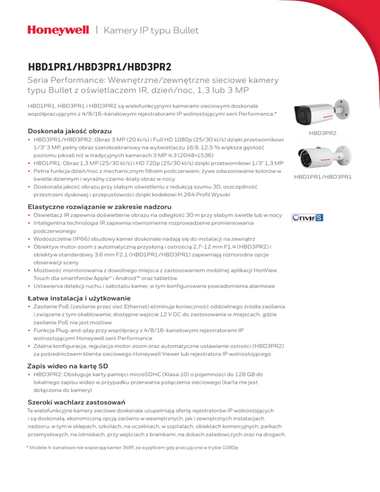 Kamery IP typu Bullet HBD1PR1/HBD3PR1/HBD3PR2 Seria Performance: Wewnętrzne/zewnętrzne sieciowe kamery typu Bullet z oświetlaczem IR, dzień/noc, 1,3 lub 3 MP HBD1PR1, HBD3PR1 i HBD3PR2 są wielofunkcyjnymi kamerami sieciowymi doskonale współpracującymi z 4/8/16-kanałowymi rejestratorami IP wolnostojącymi serii Performance.* Doskonała jakość obrazu • HBD3PR1/HBD3PR2: Obraz 3 MP (20 kl/s) i Full HD 1080p (25/30 kl/s) dzięki przetwornikowi 1/3" 3 MP, pełny obraz szerokoekranowy na wyświetlaczu 16:9, 12,5 % większa gęstość poziomu pikseli niż w tradycyjnych kamerach 3 MP 4:3 (2048×1536) • HBD1PR1: Obraz 1,3 MP (25/30 kl/s) i HD 720p (25/30 kl/s) dzięki przetwornikowi 1/3" 1,3 MP • Pełna funkcja dzień/noc z mechanicznym filtrem podczerwieni, żywe odwzorowanie kolorów w świetle dziennym i wyraźny czarno-biały obraz w nocy • Doskonała jakość obrazu przy słabym oświetleniu z redukcją szumu 3D, oszczędność przestrzeni dyskowej i przepustowości dzięki kodekowi H.264 Profil Wysoki Elastyczne rozwiązanie w zakresie nadzoru • Oświetlacz IR zapewnia doświetlenie obrazu na odległość 30 m przy słabym świetle lub w nocy • Inteligentna technologia IR zapewnia równomierne rozprowadzenie promieniowania podczerwonego • Wodoszczelne (IP66) obudowy kamer doskonale nadają się do instalacji na zewnątrz • Obiektyw motor-zoom z automatyczną przysłoną i ostrością 2,7–12 mm F1.4 (HBD3PR2) i obiektyw standardowy 3,6 mm F2.1 (HBD1PR1/HBD3PR1) zapewniają różnorodne opcje obserwacji sceny • Możliwość monitorowania z dowolnego miejsca z zastosowaniem mobilnej aplikacji HonView Touch dla smartfonów Apple® i Android™ oraz tabletów • Ustawienia detekcji ruchu i sabotażu kamer, w tym konfigurowane powiadomienia alarmowe Łatwa instalacja i użytkowanie • Zasilanie PoE (zasilanie przez sieć Ethernet) eliminuje konieczność oddzielnego źródła zasilania i związane z tym okablowanie; dostępne wejście 12 V DC do zastosowania w miejscach, gdzie zasilanie PoE nie jest możliwe • Funkcja Plug-and-play przy współpracy z 4/8/16-kanałowymi rejestratorami IP wolnostojącymi Honeywell serii Performance • Zdalna konfiguracja, regulacja motor-zoom oraz automatyczne ustawianie ostrości (HBD3PR2) za pośrednictwem klienta sieciowego Honeywell Viewer lub rejestratora IP wolnostojącego Zapis wideo na kartę SD • H BD3PR2: Obsługuje karty pamięci microSDHC (Klasa 10) o pojemności do 128 GB do lokalnego zapisu wideo w przypadku przerwania połączenia sieciowego (karta nie jest dołączona do kamery) Szeroki wachlarz zastosowań Te wielofunkcyjne kamery sieciowe doskonale uzupełniają ofertę rejestratorów IP wolnostojących i są doskonałą, ekonomiczną opcją zarówno w wewnętrznych, jak i zewnętrznych instalacjach nadzoru, w tym w sklepach, szkołach, na uczelniach, w szpitalach, obiektach komercyjnych, parkach przemysłowych, na lotniskach, przy wejściach z bramkami, na dokach załadowczych oraz na drogach. * Modele 4-kanałowe nie wspierają kamer 3MP, za wyjątkiem gdy pracują one w trybie 1080p HBD3PR2 HBD1PR1/HBD3PR1 HBD1PR1/HBD3PR1/HBD3PR2 Specyfikacje MODEL HBD1PR1 HBD3PR1 HBD3PR2 PRZETWORNIK OBRAZU Matryca CMOS 1/3" 1,3 MP ze skanowaniem progresywnym Matryca CMOS 1/3" 3 MP ze skanowaniem progresywnym LICZBA EFEKTYWNYCH PIKSELI 1280 (H) × 960 (V) 2304 (H) × 1296 (V) ELEKTRONICZNA MIGAWKA Automatyczna/Ręczna, 1/3–1/30000 s Automatyczna/Ręczna, 1–1/100000 s Automatyczna/Ręczna, 1/3(4)–1/100000 s CZUŁOŚĆ 0,08 lx, F2.1 (kolor); 0 lx (oświetlacz IR wł.) 0,045 lx, F2.1 (kolor); 0 lx (oświetlacz IR wł.) 0,1 lx, F1.4 (kolor); 0 lx (oświetlacz IR wł.) STOSUNEK SYGNAŁU DO SZUMU Ponad 50 dB PARAMETRY KAMERY FUNKCJE KAMERY ZASIĘG OŚWIETLACZA IR Do 30 m, w zależności od współczynnika odbicia sceny TRYB DZIEŃ/NOC Automatyczny (ICR)/Kolor/Czarno-biały KOMPENSACJA JASNEGO TŁA BLC/HLC/DWDR BALANS BIELI Automatyczny/Ręczny REGULACJA WZMOCNIENIA Automatyczna/Ręczna REDUKCJA SZUMU 3D STREFY PRYWATNOŚCI Do 4 obszarów OBIEKTYW OGNISKOWA 3,6 mm 2,7–12 mm MAKS. APERTURA F2.1 F1.4 REGULACJA OSTROŚCI Stała POZIOMY KĄT WIDZENIA 71° TYP OBIEKTYWU Standardowy Automatyczna 81° 86°–28° Motor-zoom z automatyczną przysłoną i ostrością WIDEO KOMPRESJA H.264 (Profil Główny/Wysoki/Podstawowy)/MJPEG ROZDZIELCZOŚĆ 1,3 MP (1280×960), 720p (1280×720), D1 (704×576/704×480), CIF (352×288/352×240) 3 MP (2304×1296), 1080p (1920×1080), 720p (1280×720), D1 (704×576/704×480), CIF (352×288/352×240) STRUMIEŃ GŁÓWNY 1,3 MP, 720p (1–25/30 kl/s) 3 MP (1–20 kl/s), 1080p (1–25/30 kl/s) STRUMIEŃ PODRZĘDNY D1, CIF (1–25/30 kl/s) PRĘDKOŚĆ PRZETWARZANIA PRZEPŁYW STRUMIENIA WIDEO H.264: 4–8192 kb/s TRYB KORYTARZA Tak SIEĆ ETHERNET RJ-45 (10/100Base-T) PROTOKOŁY IPv4/IPv6, HTTP, HTTPS, TCP/IP, UDP, UPnP, ICMP, IGMP, RTSP, RTP, SMTP, NTP, DHCP, DNS, PPPoE, DDNS, FTP, IP Filter, QoS, 802.1X (za wyjątkiem HBD1PR1). STANDARD ONVIF Profil S, Profil G (tylko HBD3PR2) MAKS. LICZBA UŻYTKOWNIKÓW 20 użytkowników APLIKACJE MOBILNE HonView Touch dla iPhone, iPad, telefonów i tabletów Android DODATKOWE INTERFEJSY GNIAZDO PAMIĘCI - microSD (128 GB) OGÓLNE ZASILANIE PoE (802.3af), 12 V DC POBÓR MOCY Maks. 4,8 W (oświetlacz IR wł.) ŚRODOWISKO PRACY Od –30°C do 60°C; wilgotność względna od 10% do 100%, z kondensacją STOPIEŃ OCHRONY IP IP66 WYMIARY 165,0 × 70,0 mm WAGA 0,38 kg CERTYFIKATY FCC, część 15B, klasa B Maks. 4,7 W (oświetlacz IR wł.) Maks. 8,5 W (oświetlacz IR wł.) 214,8 × 90,4 mm 0,38 kg 0,65 kg HBD1PR1/HBD3PR1/HBD3PR2 Dane do zamówień ZALECANE AKCESORIA UCHWYTY MONTAŻOWE HBS2-BB Skrzynka przyłączeniowa HEJB Skrzynka przyłączeniowa (tylko dla HBD1PR1 i HBD3PR1) HB34S2-CM Uchwyt narożnikowy (tylko dla HBS2-BB lub HEJB) HQA-PM Uchwyt słupowy (tylko dla HBS2-BB lub HEJB) KOMPATYBILNE REJESTRATORY SIECIOWE HEN041**X H.264 4-kanałowy, 1080p, rejestrator IP wo