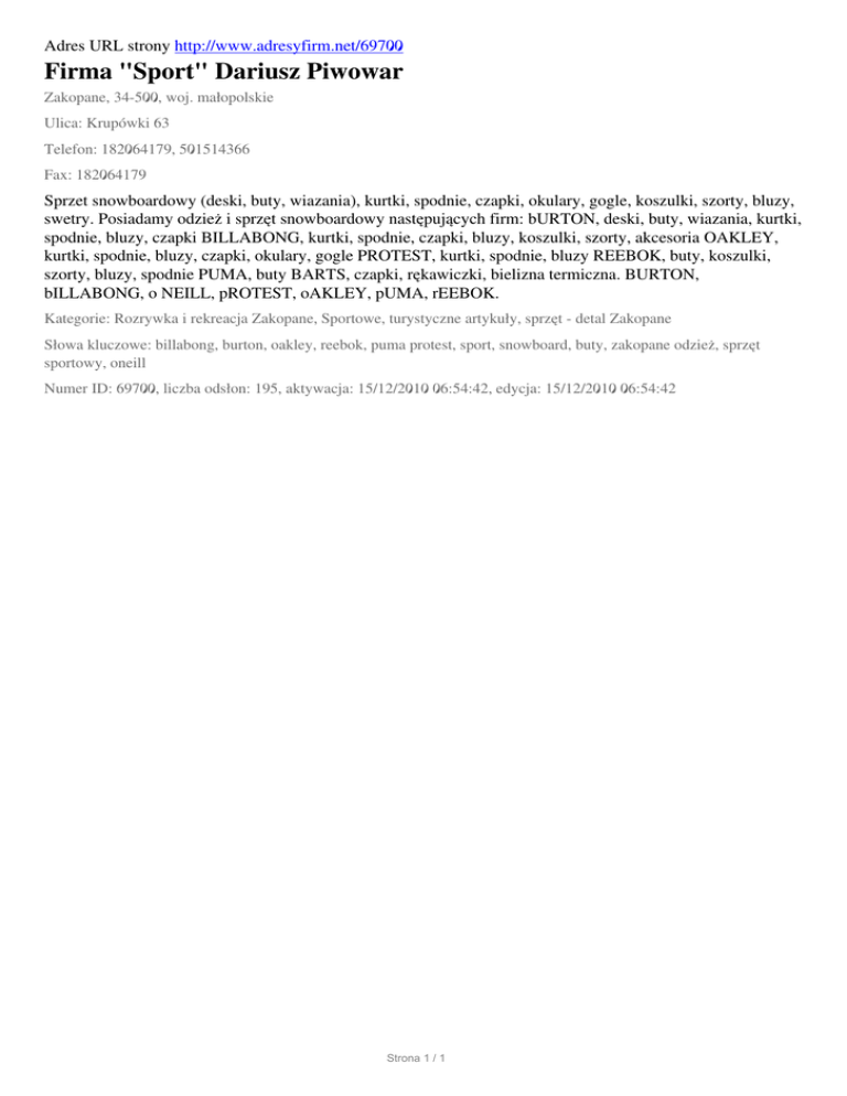 Firma "Sport" Dariusz Piwowar, Zakopane, Krupowki 63