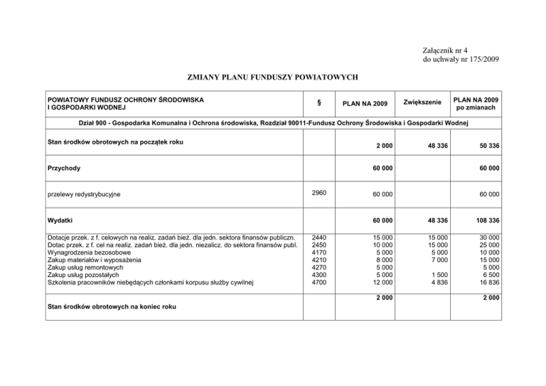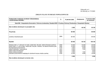 Załącznik nr 4 do uchwały nr 175/2009 ZMIANY PLANU FUNDUSZY POWIATOWYCH POWIATOWY FUNDUSZ OCHRONY ŚRODOWISKA I GOSPODARKI WODNEJ § PLAN NA 2009 Zwiększenie PLAN NA 2009 po zmianach Dział 900 - Gospodarka Komunalna i Ochrona środowiska, Rozdział 90011-Fundusz Ochrony Środowiska i Gospodarki Wodnej Stan środków obrotowych na początek roku 2 000 Przychody przelewy redystrybucyjne 2960 Wydatki Dotacje przek. z f. celowych na realiz. zadań bieŜ. dla jedn. sektora finansów publiczn. Dotac przek. z f. cel na realiz. zadań bieŜ. dla jedn. niezalicz. do sektora finansów publ. Wynagrodzenia bezosobowe Zakup materiałów i wyposaŜenia Zakup usług remontowych Zakup usług pozostałych Szkolenia pracowników niebędących członkami korpusu słuŜby cywilnej 2440 2450 4170 4210 4270 4300 4700 50 336 60 000 60 000 60 000 60 000 60 000 48 336 108 336 15 000 10 000 5 000 8 000 5 000 5 000 12 000 15 000 15 000 5 000 7 000 30 000 25 000 10 000 15 000 5 000 6 500 16 836 2 000 Stan środków obrotowych na koniec roku 48 336 1 500 4 836 2 000 2 POWIATOWY FUNDUSZ GOSPODARKI ZASOBEM GEODEZYJNYM I KARTOGRAFICZNYM § PLAN NA 2009 Zwiększenie PLAN NA 2009 po zmianach Dział 710 - działalność Usługowa, Rozdział 71030 - Fundusz Gospodarki Zasobem Geodezyjnym i Kartograficznym 30 000 Stan środków obrotowych na początek roku Przychody wpływy z usług 0830 Wydatki 561 013 330 000 330 000 330 000 330 000 330 000 Przelewy redystrybucyjne Wynagrodzenia bezosobowe Zakup materiałów i wyposaŜenia Zakup energii Zakup usług remontowych Zakup usług pozostałych Opłaty z tytułu zakupu usług telekomunikacyjnych telefonii komórkowej Opłaty z tytułu zakupu usług telekomunikacyjnych telefonii stacjonarnej RóŜne opłaty i składki Szkolenia pracowników niebędących członkami korpusu słuŜby cywilnej Zakup materiałów papierniczych do sprzętu drukarskiego Zakup akcesoriów komputerowych, w tym programów i licencji 2960 4170 4210 4260 4270 4300 4360 4370 4430 4700 4740 4750 66 000 1 000 4 000 14 000 Wydatki inwestycyjne funduszy celowych Wydatki na zakupy inwestycyjne funduszy celowych` 6110 6120 210 000 Stan środków obrotowych na koniec roku 531 013 15 000 1 500 531 013 3 000 25 500 66 000 1 000 30 000 14 000 5 000 450 513 1 500 6 000 2 000 5 000 10 000 30 000 30 000 210 000 30 000 26 000 5 000 435 513 6 000 2 000 5 000 7 000 4 500 30 000 861 013 30 000