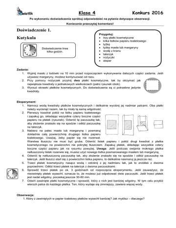Klasa 4 Konkurs 2016 Po wykonaniu doświadczenia spróbuj odpowiedzieć na pytania dotyczące obserwacji. Koniecznie przeczytaj komentarz! Doświadczenie 1. Kutykula Doświadczenie trwa kilka godzin. Przygotuj: trzy płatki kosmetyczne kilka listków papieru toaletowego łyżkę łyżkę masła lub margaryny wodę z kranu talerzyk nożyczki stoper Zadanie: 1. Wyjmij masło z lodówki na 10 min przed rozpoczęciem wykonywania dalszych części zadania. Jeśli używasz margaryny, możesz kontynuować od razu. 2. Przy pomocy nożyczek przytnij dwa płatki kosmetyczne, tak by otrzymać jak największe kwadraty o jednakowych wielkościach (patrz rysunek obok). 3. Wyrzuć skrawki płatków kosmetycznych. Do doświadczenia są ci potrzebne jedynie kwadraty. Eksperyment: 1. Namocz wodą kwadraty płatków kosmetycznych i delikatnie wyciśnij jej nadmiar palcami. Oba płatki należy wycisnąć razem, tak by miały tą samą wilgotność. 2. Pierwszy kwadrat połóż na listku papieru toaletowego i zapakuj go, składając wszystkie cztery boczne części papieru na płatek (rysunek). Odwróć tę paczuszkę tak, aby złożenie znalazło się na spodzie i odłóż paczuszkę na talerzyk. 3. Nabierz na palec masło lub margarynę i posmaruj dokładnie całą powierzchnię drugiego listka papieru toaletowego. Uważaj, żeby papier się nie rozerwał. Warstwa tłuszczu nie musi być gruba. Odwróć listek papieru i połóż drugi kwadrat z płatka kosmetycznego na powierzchni nie pokrytej tłuszczem. Zapakuj płatek, składając wszystkie cztery boczne części papieru jak na rysunku powyżej. Uwaga: Jeśli podczas owijania mokrego płatka natłuszczony listek rozerwie się, musisz użyć nowego listka posmarowanego masłem lub margaryną. 4. Odwróć tę natłuszczoną paczuszkę tak, aby złożenie znalazło się na spodzie i odłóż paczuszkę na talerzyk. Jeśli tłuszcz starł się z powierzchni listka papieru, to delikatnie nasmaruj ją jeszcze raz. 5. Trzeci płatek kosmetyczny nasącz wodą i odciśnij z jej nadmiaru tak, jak to zrobiłeś z dwoma poprzednimi. Odłóż trzeci płatek na talerzyk z dwoma paczuszkami. 6. Sprawdź trzeci płatek po ok. 3 godzinach od rozpoczęcia eksperymentu. Jeśli zauważysz, że nieowinięty płatek wysechł, oznacza to, że możesz już odpakować dwie paczuszki. Jeśli trzeci płatek jest nadal wilgotny, poczekaj jeszcze 30-60 min. 7. Odwiń zawinięte płatki kosmetyczne i sprawdź, który z nich jest bardziej wilgotny. W tym celu przyłóż wierzch palca do każdego płatka. Ten, który wydaje się zimniejszy, zawiera więcej wody. Obserwacja: 1. Który z zawiniętych w papier toaletowy płatków wysechł bardziej? Jak myślisz – dlaczego? Klasa 4 Konkurs 2016 Komentarz: Tłuszcze są, obok białek i cukrów, głównymi składnikami pokarmowymi. Tłuszcze zbudowane są z tzw. kwasów tłuszczowych. Żywe organizmy gromadzą nadmiar energii w postaci tłuszczów. Są one „paliwem” potrzebnym do sprawnego funkcjonowania każdej komórki, ale pełnią też inne bardzo ważne funkcje. Tłuszcze nie rozpuszczają się w wodzie. Margaryna i masło składają się prawie wyłącznie z tłuszczów. Podczas doświadczenia można było zauważyć różnicę w szybkości wysychania płatka zawiniętego w papier toaletowy bez i z warstwą tłuszczu na powierzchni. Papier toaletowy, który nie został pokryty masłem lub margaryną stał się wilgotny od razu po zapakowaniu do niego płatka kosmetycznego. Proces wysychania rozpoczął się w tym przypadku bardzo szybko. Inaczej było w przypadku listka papieru toaletowego pokrytego warstwą tłuszczu. Nawet po kilku godzinach płatek znajdujący się w środku był nadal wilgotny. Stało się tak dlatego, że woda parująca z płatka kosmetycznego napotkała na swojej drodze warstwę tłuszczu, która była dla niej nieprzepuszczalna. Podobna sytuacja zachodzi w liściach roślin. Każdy liść jest pokryty warstwą zwaną kutykulą. Jest ona zbudowana z różnych substancji chemicznych, ale przede wszystkim z wosków, substancji bardzo podobnych do tłuszczów. Rośliny mimo to potrafią prowadzić wymianę gazową. Każdy liść posiada bowiem przerwy w kutykuli, zwane aparatami szparkowymi. Dzięki nim roślina oddycha. W przeprowadzonym doświadczeniu otworki papieru toaletowego zostały pokryte tłuszczem. W przypadku roślin zatkanie aparatów szparkowych prowadziłoby do braku kontroli poziomu wody i dwutlenku węgla, który jest potrzebny roślinom do życia. Kutykula pokrywająca liście i łodygi, ma za zadanie chronić roślinę przed zbyt dużą utratą wody, ale także przed pochłanianiem przez roślinę różnych szkodliwych substancji. Dzięki temu, że najbardziej zewnętrzną warstwę kutykuli tworzą woski, możliwe jest np. obserwowanie kropelek wody (m.in. rosy), zbierających się na powierzchniach liści. Klasa 4 Konkurs 2016 Po wykonaniu doświadczenia spróbuj odpowiedzieć na pytania dotyczące obserwacji. Koniecznie przeczytaj komentarz! Doświadczenie 2. Cola i mleko To doświadczenie może trwać nawet dwie godziny. Przygotuj: 5 łyżek mleka półlitrową (pełną) butelkę coli dowolnego rodzaju łyżkę szklankę Eksperyment: 1. Odlej pół szklanki coli z butelki. 2. Oderwij z butelki etykietę. 3. Do butelki z colą wlej powoli pięć łyżek mleka i obserwuj, co się dzieje. 4. Pozostaw butelkę w bezpiecznym miejscu na przynajmniej dwie godziny. Obserwacja: 1. Co się stało, gdy mleko i cola zmieszały się ze sobą? 2. Mleko i cola są cieczami. Czy pozostały nimi po zmieszaniu? 3. Czy cola zmieniła kolor? UWAGA: nigdy nie jedz ani nie pij substancji, które otrzymujesz w doświadczeniach! Komentarz: Białka to substancje bez których człowiek nie może żyć. Białka występują np. w białym serze, jogurcie oraz jajkach. Można je także dostarczyć do organizmu, jedząc mięso, ryby oraz rośliny strączkowe, takie jak fasola lub groch. Białka pełnią bardzo wiele f