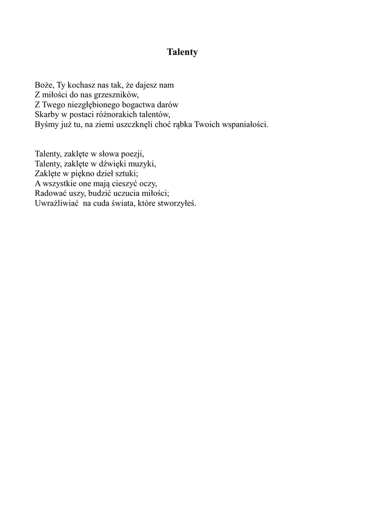 Talenty Boże, Ty kochasz nas tak, że dajesz nam Z miłości do nas grzeszników, Z Twego niezgłębionego bogactwa darów Skarby w postaci różnorakich talentów, Byśmy już tu, na ziemi uszczknęli choć rąbka Twoich wspaniałości. Talenty, zaklęte w słowa poezji, Talenty, zaklęte w dźwięki muzyki, Zaklęte w piękno dzieł sztuki; A wszystkie one mają cieszyć oczy, Radować uszy, budzić uczucia miłości; Uwrażliwiać na cuda świata, które stworzyłeś.