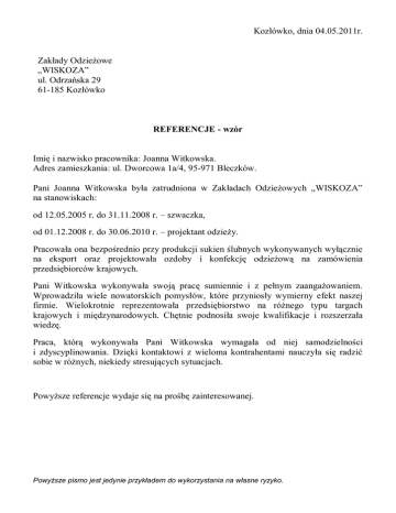 Kozłówko, dnia 04.05.2011r. Zakłady Odzieżowe „WISKOZA” ul. Odrzańska 29 61-185 Kozłówko REFERENCJE - wzór Imię i nazwisko pracownika: Joanna Witkowska. Adres zamieszkania: ul. Dworcowa 1a/4, 95-971 Bleczków. Pani Joanna Witkowska była zatrudniona w Zakładach Odzieżowych „WISKOZA” na stanowiskach: od 12.05.2005 r. do 31.11.2008 r. – szwaczka, od 01.12.2008 r. do 30.06.2010 r. – projektant odzieży. Pracowała ona bezpośrednio przy produkcji sukien ślubnych wykonywanych wyłącznie na eksport oraz projektowała ozdoby i konfekcję odzieżową na zamówienia przedsiębiorców krajowych. Pani Witkowska wykonywała swoją pracę sumiennie i z pełnym zaangażowaniem. Wprowadziła wiele nowatorskich pomysłów, które przyniosły wymierny efekt naszej firmie. Wielokrotnie reprezentowała przedsiębiorstwo na różnego typu targach krajowych i międzynarodowych. Chętnie podnosiła swoje kwalifikacje i rozszerzała wiedzę. Praca, którą wykonywała Pani Witkowska wymagała od niej samodzielności i zdyscyplinowania. Dzięki kontaktowi z wieloma kontrahentami nauczyła się radzić sobie w różnych, niekiedy stresujących sytuacjach. Powyższe referencje wydaje się na prośbę zainteresowanej. Powyższe pismo jest jedynie przykładem do wykorzystania na własne ryzyko.