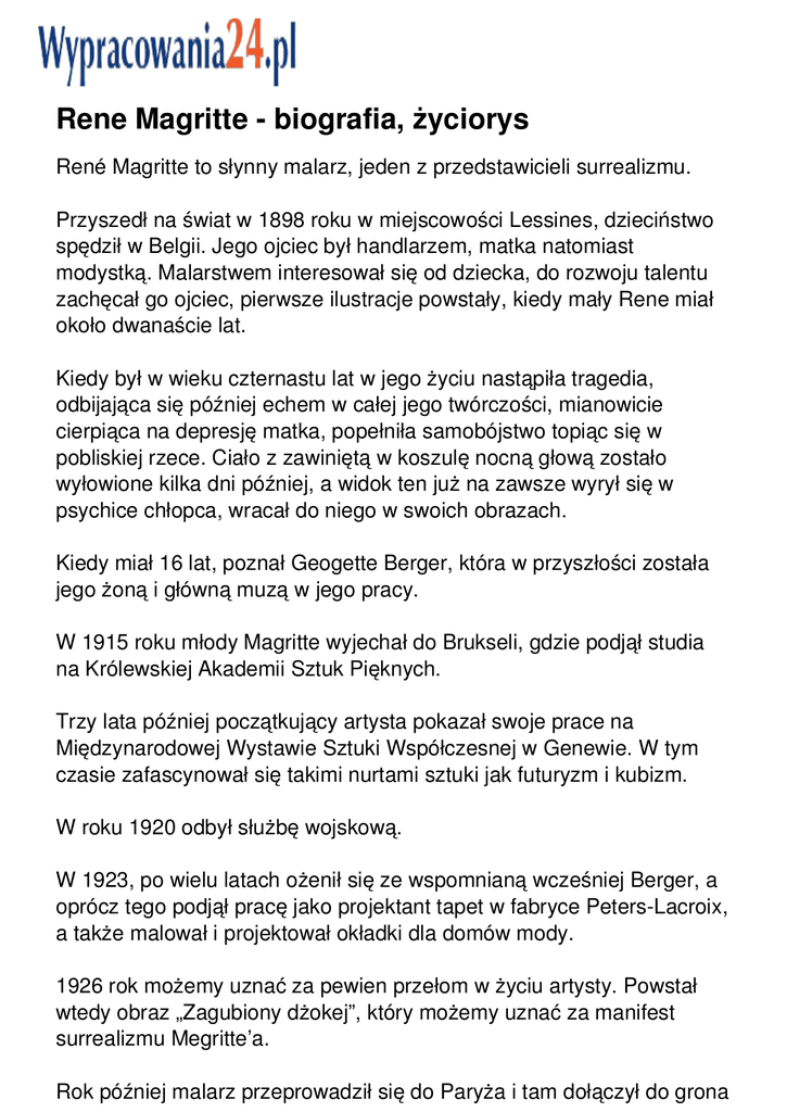 Rene Magritte - biografia, życiorys René Magritte to słynny malarz, jeden z przedstawicieli surrealizmu. Przyszedł na świat w 1898 roku w miejscowości Lessines, dzieciństwo spędził w Belgii. Jego ojciec był handlarzem, matka natomiast modystką. Malarstwem interesował się od dziecka, do rozwoju talentu zachęcał go ojciec, pierwsze ilustracje powstały, kiedy mały Rene miał około dwanaście lat. Kiedy był w wieku czternastu lat w jego życiu nastąpiła tragedia, odbijająca się później echem w całej jego twórczości, mianowicie cierpiąca na depresję matka, popełniła samobójstwo topiąc się w pobliskiej rzece. Ciało z zawiniętą w koszulę nocną głową zostało wyłowione kilka dni później, a widok ten już na zawsze wyrył się w psychice chłopca, wracał do niego w swoich obrazach. Kiedy miał 16 lat, poznał Geogette Berger, która w przyszłości została jego żoną i główną muzą w jego pracy. W 1915 roku młody Magritte wyjechał do Brukseli, gdzie podjął studia na Królewskiej Akademii Sztuk Pięknych. Trzy lata później początkujący artysta pokazał swoje prace na Międzynarodowej Wystawie Sztuki Współczesnej w Genewie. W tym czasie zafascynował się takimi nurtami sztuki jak futuryzm i kubizm. W roku 1920 odbył służbę wojskową. W 1923, po wielu latach ożenił się ze wspomnianą wcześniej Berger, a oprócz tego podjął pracę jako projektant tapet w fabryce Peters-Lacroix, a także malował i projektował okładki dla domów mody. 1926 rok możemy uznać za pewien przełom w życiu artysty. Powstał wtedy obraz „Zagubiony dżokej”, który możemy uznać za manifest surrealizmu Megritte’a. Rok później malarz przeprowadził się do Paryża i tam dołączył do grona innych surrealistów, między innymi Salvadora Dali. W tym roku także miała miejsce jego pierwsza autorska wystawa w Brukseli. W roku 1929 Magritte spędził jakiś czas w posiadłości Dalego razem z poetą Paulem Eluardem, gdzie wszyscy trzej wymieniali poglądy i spostrzeżenia dotyczące sztuki i życia. Magritte zmarł w Brukseli w 1967 roku.