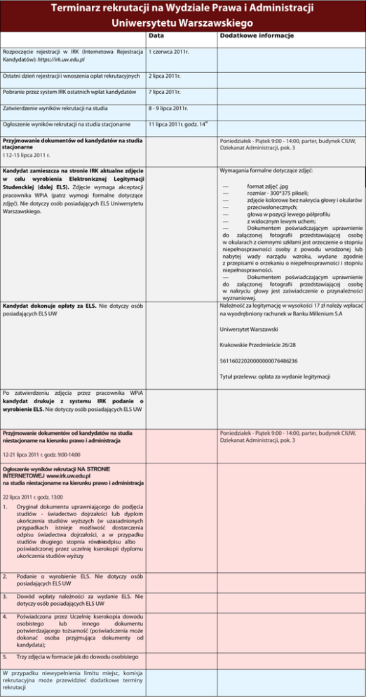 Terminarz rekrutacji na Wydziale Prawa i Administracji Uniwersytetu Warszawskiego Data Dodatkowe informacje Rozpoczêcie rejestracji w IRK (Internetowa Rejestracja 1 czerwca 2011r. Kandydatów): https://irk.uw.edu.pl Ostatni dzieñ rejestracji i wnoszenia op³at rekrutacyjnych 2 lipca 2011r. Pobranie przez system IRK ostatnich wp³at kandydatów 7 lipca 2011r. Zatwierdzenie wyników rekrutacji na studia 8 - 9 lipca 2011r. Og³oszenie wyników rekrutacji na studia stacjonarne 11 lipca 2011r. godz. 1400 Przyjmowanie dokumentów od kandydatów na studia stacjonarne I 12-15 lipca 2011 r. Poniedzia³ek - Pi¹tek 9:00 - 14:00, parter, budynek CIUW, Dziekanat Administracji, pok. 3 Kandydat zamieszcza na stronie IRK aktualne zdjêcie w celu wyrobienia Elektronicznej Legitymacji Studenckiej (dalej ELS). Zdjêcie wymaga akceptacji pracownika WPiA (patrz wymogi formalne dotycz¹ce zdjêæ). Nie dotyczy osób posiadaj¹cych ELS Uniwersytetu Warszawskiego. Wymagania formalne dotycz¹ce zdjêæ: Kandydat dokonuje op³aty za ELS. Nie dotyczy osób posiadaj¹cych ELS UW — format zdjêæ .jpg — rozmiar - 300*375 pikseli; — zdjêcie kolorowe bez nakrycia g³owy i okularów — przeciws³onecznych; — g³owa w pozycji lewego pó³profilu — z widocznym lewym uchem; — Dokumentem poœwiadczaj¹cym uprawnienie do za³¹czonej fotografii przedstawiaj¹cej osobê w okularach z ciemnymi szk³ami jest orzeczenie o stopniu niepe³nosprawnoœci osoby z powodu wrodzonej lub nabytej wady narz¹du wzroku, wydane zgodnie z przepisami o orzekaniu o niepe³nosprawnoœci i stopniu niepe³nosprawnoœci. — Dokumentem poœwiadczaj¹cym uprawnienie do za³¹czonej fotografii przedstawiaj¹cej osobê w nakryciu g³owy jest zaœwiadczenie o przynale¿noœci wyznaniowej. Nale¿noœæ za legitymacjê w wysokoœci 17 z³ nale¿y wp³acaæ na wyodrêbniony rachunek w Banku Millenium S.A Uniwersytet Warszawski Krakowskie Przedmieœcie 26/28 56116022020000000076486236 Tytu³ przelewu: op³ata za wydanie legitymacji Po zatwierdzeniu zdjêcia przez pracownika WPiA kandydat drukuje z systemu IRK podanie o wyrobienie ELS. Nie dotyczy osób posiadaj¹cych ELS UW Przyjmowanie dokumentów od kandydatów na studia niestacjonarne na kierunku prawo i administracja 12-21 lipca 2011 r. godz. 9:00-14:00 Og³oszenie wyników rekrutacji NA STRONIE INTERNETOWEJ www.irk.uw.edu.pl na studia niestacjonarne na kierunku prawo i administracja 22 lipca 2011 r. godz. 13:00 1. Orygina³ dokumentu uprawniaj¹cego do podjêcia studiów - œwiadectwo dojrza³oœci lub dyplom ukoñczenia studiów wy¿szych (w uzasadnionych przypadkach istnieje mo¿liwoœæ dostarczenia odpisu œwiadectwa dojrza³oœci, a w przypadku studiów drugiego stopnia równie ¿ odpisu albo poœwiadczonej przez uczelniê kserokopii dyplomu ukoñczenia studiów wy¿szy 2. Podanie o wyrobienie ELS. Nie dotyczy osób posiadaj¹cych ELS UW 3. Dowód wp³aty nale¿noœci za wydanie ELS. Nie dotyczy osób posiadaj¹cych ELS UW 4. Poœwiadczona przez Uczelniê kserokopia dowodu osobistego lub innego dokumentu potwierdzaj¹cego to¿samoœæ (poœwiadczenia mo¿e dokonaæ osoba przyjmuj¹ca dokumenty od kandydata); 5. Trzy zdjêcia w formacie jak do dowodu osobistego W przypadku niewype³nienia limitu miejsc, komisja rekrutacyjna mo¿e przewidzieæ dodatkowe terminy rekrutacji Poniedzia³ek - Pi¹tek 9:00 - 14:00, parter, budynek CIUW, Dziekanat Administracji, pok. 3