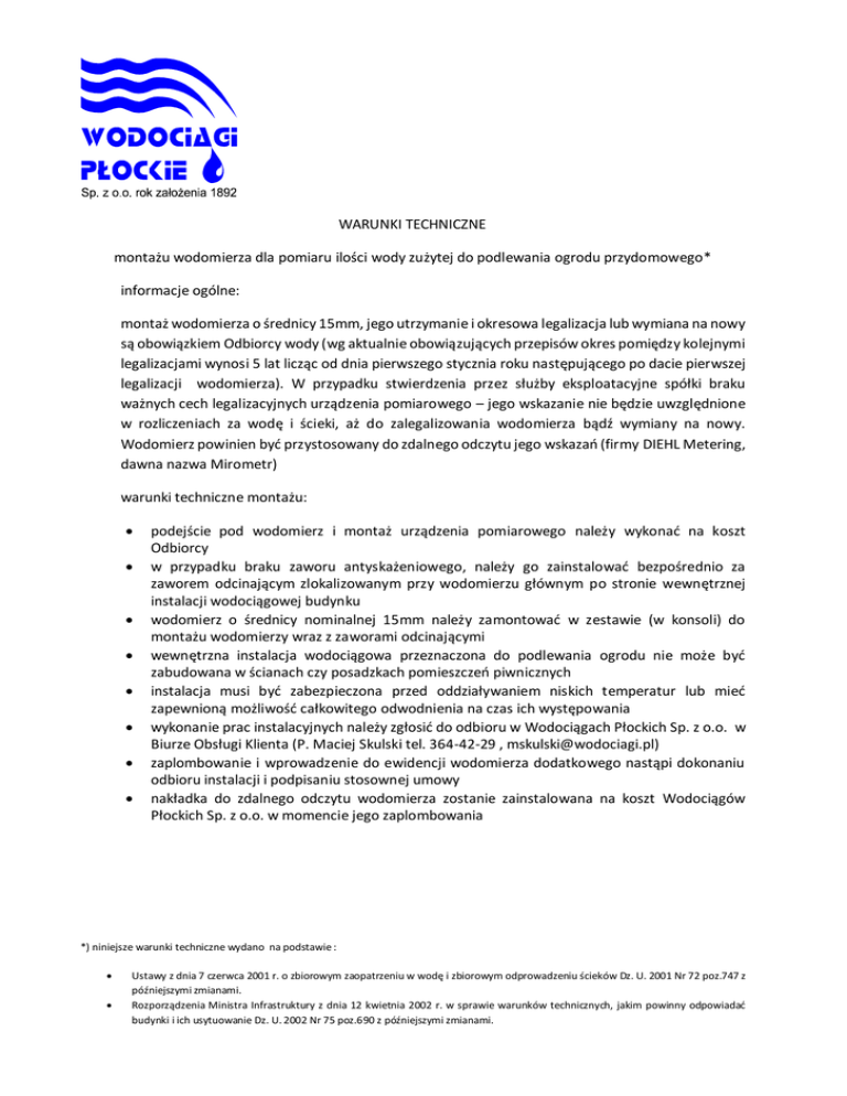 WARUNKI TECHNICZNE montażu wodomierza dla pomiaru ilości wody zużytej do podlewania ogrodu przydomowego* informacje ogólne: montaż wodomierza o średnicy 15mm, jego utrzymanie i okresowa legalizacja lub wymiana na nowy są obowiązkiem Odbiorcy wody (wg aktualnie obowiązujących przepisów okres pomiędzy kolejnymi legalizacjami wynosi 5 lat licząc od dnia pierwszego stycznia roku następującego po dacie pierwszej legalizacji wodomierza). W przypadku stwierdzenia przez służby eksploatacyjne spółki braku ważnych cech legalizacyjnych urządzenia pomiarowego – jego wskazanie nie będzie uwzględnione w rozliczeniach za wodę i ścieki, aż do zalegalizowania wodomierza bądź wymiany na nowy. Wodomierz powinien być przystosowany do zdalnego odczytu jego wskazań (firmy DIEHL Metering, dawna nazwa Mirometr) warunki techniczne montażu: podejście pod wodomierz i montaż urządzenia pomiarowego należy wykonać na koszt Odbiorcy w przypadku braku zaworu antyskażeniowego, należy go zainstalować bezpośrednio za zaworem odcinającym zlokalizowanym przy wodomierzu głównym po stronie wewnętrznej instalacji wodociągowej budynku wodomierz o średnicy nominalnej 15mm należy zamontować w zestawie (w konsoli) do montażu wodomierzy wraz z zaworami odcinającymi wewnętrzna instalacja wodociągowa przeznaczona do podlewania ogrodu nie może być zabudowana w ścianach czy posadzkach pomieszczeń piwnicznych instalacja musi być zabezpieczona przed oddziaływaniem niskich temperatur lub mieć zapewnioną możliwość całkowitego odwodnienia na czas ich występowania wykonanie prac instalacyjnych należy zgłosić do odbioru w Wodociągach Płockich Sp. z o.o. w Biurze Obsługi Klienta (P. Maciej Skulski tel. 364-42-29 , [email protected]) zaplombowanie i wprowadzenie do ewidencji wodomierza dodatkowego nastąpi dokonaniu odbioru instalacji i podpisaniu stosownej umowy nakładka do zdalnego odczytu wodomierza zostanie zainstalowana na koszt Wodociągów Płockich Sp. z o.o. w momencie jego zaplombowania *) niniejsze warunki techniczne wydano na podstawie : Ustawy z dnia 7 czerwca 2001 r. o zbiorowym zaopatrzeniu w wodę i zbiorowym odprowadzeniu ścieków Dz. U. 2001 Nr 72 poz.747 z późniejszymi zmianami. Rozporządzenia Ministra Infrastruktury z dnia 12 kwietnia 2002 r. w sprawie warunków technicznych, jakim powinny odpowiadać budynki i ich usytuowanie Dz. U. 2002 Nr 75 poz.690 z późniejszymi zmianami.