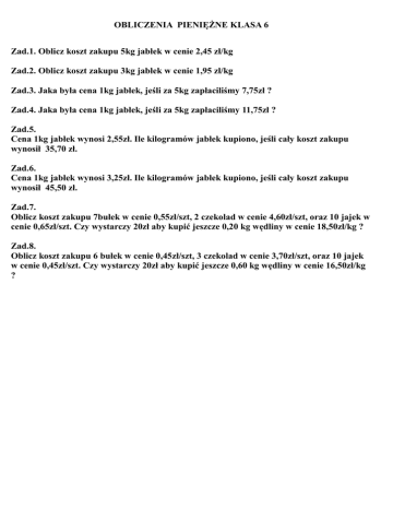 OBLICZENIA PIENIĘŻNE KLASA 6 Zad.1. Oblicz koszt zakupu 5kg