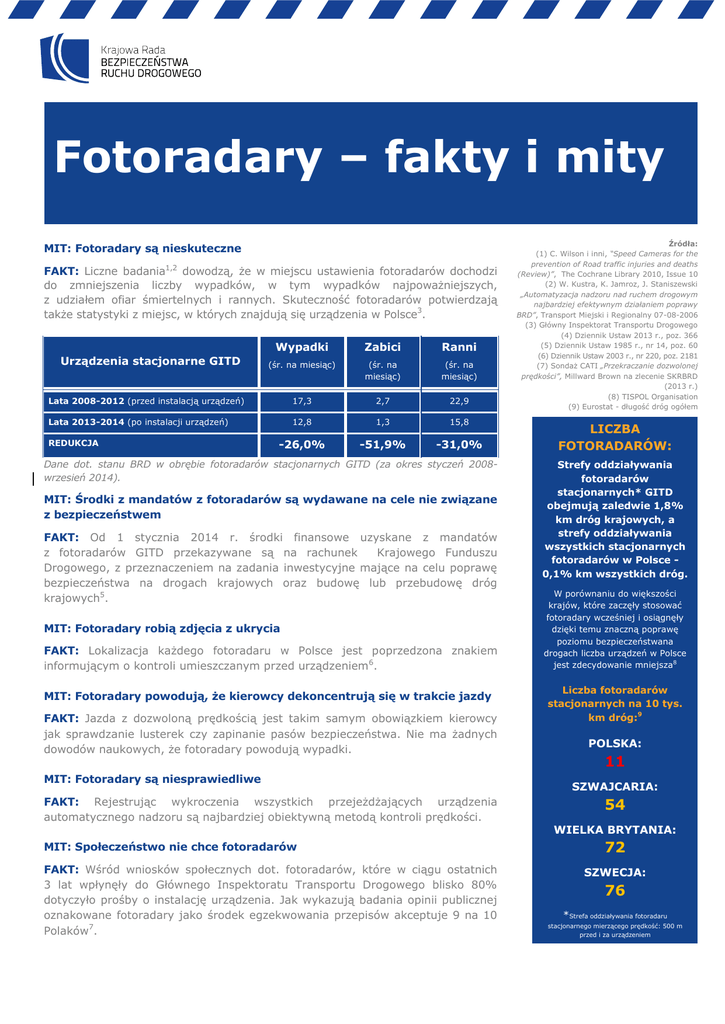 Fotoradary – fakty i mity MIT: Fotoradary są nieskuteczne FAKT: Liczne badania1,2 dowodzą, że w miejscu ustawienia fotoradarów dochodzi do zmniejszenia liczby wypadków, w tym wypadków najpoważniejszych, z udziałem ofiar śmiertelnych i rannych. Skuteczność fotoradarów potwierdzają także statystyki z miejsc, w których znajdują się urządzenia w Polsce3. Wypadki Zabici Ranni (śr. na miesiąc) (śr. na miesiąc) (śr. na miesiąc) Lata 2008-2012 (przed instalacją urządzeń) 17,3 2,7 22,9 Lata 2013-2014 (po instalacji urządzeń) 12,8 1,3 15,8 -26,0% -51,9% -31,0% Urządzenia stacjonarne GITD REDUKCJA Dane dot. stanu BRD w obrębie fotoradarów stacjonarnych GITD (za okres styczeń 2008wrzesień 2014). MIT: Środki z mandatów z fotoradarów są wydawane na cele nie związane z bezpieczeństwem FAKT: Od 1 stycznia 2014 r. środki finansowe uzyskane z mandatów z fotoradarów GITD przekazywane są na rachunek Krajowego Funduszu Drogowego, z przeznaczeniem na zadania inwestycyjne mające na celu poprawę bezpieczeństwa na drogach krajowych oraz budowę lub przebudowę dróg krajowych5. MIT: Fotoradary robią zdjęcia z ukrycia FAKT: Lokalizacja każdego fotoradaru w Polsce jest poprzedzona znakiem informującym o kontroli umieszczanym przed urządzeniem6. MIT: Fotoradary powodują, że kierowcy dekoncentrują się w trakcie jazdy FAKT: Jazda z dozwoloną prędkością jest takim samym obowiązkiem kierowcy jak sprawdzanie lusterek czy zapinanie pasów bezpieczeństwa. Nie ma żadnych dowodów naukowych, że fotoradary powodują wypadki. MIT: Fotoradary są niesprawiedliwe FAKT: Rejestrując wykroczenia wszystkich przejeżdżających urządzenia automatycznego nadzoru są najbardziej obiektywną metodą kontroli prędkości. MIT: Społeczeństwo nie chce fotoradarów FAKT: Wśród wniosków społecznych dot. fotoradarów, które w ciągu ostatnich 3 lat wpłynęły do Głównego Inspektoratu Transportu Drogowego blisko 80% dotyczyło prośby o instalację urządzenia. Jak wykazują badania opinii publicznej oznakowane fotoradary jako środek egzekwowania przepisów akceptuje 9 na 10 Polaków7. Źródła: (1) C. Wilson i inni, “Speed Cameras for the prevention of Road traffic injuries and deaths (Review)”, The Cochrane Library 2010, Issue 10 (2) W. Kustra, K. Jamroz, J. Staniszewski „Automatyzacja nadzoru nad ruchem drogowym najbardziej efektywnym działaniem poprawy BRD”, Transport Miejski i Regionalny 07-08-2006 (3) Główny Inspektorat Transportu Drogowego (4) Dziennik Ustaw 2013 r., poz. 366 (5) Dziennik Ustaw 1985 r., nr 14, poz. 60 (6) Dziennik Ustaw 2003 r., nr 220, poz. 2181 (7) Sondaż CATI „Przekraczanie dozwolonej prędkości”, Millward Brown na zlecenie SKRBRD (2013 r.) (8) TISPOL Organisation (9) Eurostat - długość dróg ogółem LICZBA FOTORADARÓW: Strefy oddziaływania fotoradarów stacjonarnych* GITD obejmują zaledwie 1,8% km dróg krajowych, a strefy oddziaływania wszystkich stacjonarnych fotoradarów w Polsce 0,1% km wszystkich dróg. W porównaniu do większości krajów, które zaczęły stosować fotoradary wcześniej i osiągnęły dzięki temu znaczną poprawę poziomu bezpieczeństwana drogach liczba urządzeń w Polsce jest zdecydowanie mniejsza8 Liczba fotoradarów stacjonarnych na 10 tys. km dróg:9 POLSKA: 11 SZWAJCARIA: 54 WIELKA BRYTANIA: 72 SZWECJA: 76 *Strefa oddziaływania fotoradaru stacjonarnego mierzącego prędkość: 500 m przed i za urządzeniem