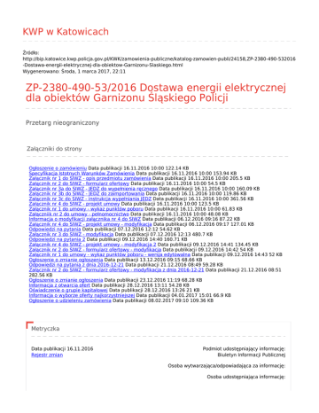 KWP w Katowicach Źródło: http://bip.katowice.kwp.policja.gov.pl/KWK/zamowienia-publiczne/katalog-zamowien-publi/24158,ZP-2380-490-532016 -Dostawa-energii-elektrycznej-dla-obiektow-Garnizonu-Slaskiego.html Wygenerowano: Środa, 1 marca 2017, 22:11 ZP-2380-490-53/2016 Dostawa energii elektrycznej dla obiektów Garnizonu Śląskiego Policji Przetarg nieograniczony Załączniki do strony Ogłoszenie o zamówieniu Data publikacji 16.11.2016 10:00 122.14 KB Specyfikacja Istotnych Warunków Zamówienia Data publikacji 16.11.2016 10:00 153.94 KB Załącznik nr 1 do SIWZ - opis przedmiotu zamówienia Data publikacji 16.11.2016 10:00 205.5 KB Załącznik nr 2 do SIWZ - formularz ofertowy Data publikacji 16.11.2016 10:00 54.5 KB Załącznik nr 3a do SIWZ - JEDZ do wypełnienia ręcznego Data publikacji 16.11.2016 10:00 160.09 KB Załącznik nr 3b do SIWZ - JEDZ do zaimportowania Data publikacji 16.11.2016 10:00 119.86 KB Załącznik nr 3c do SIWZ - instrukcja wypełniania JEDZ Data publikacji 16.11.2016 10:00 361.56 KB Załącznik nr 4 do SIWZ - projekt umowy Data publikacji 16.11.2016 10:00 123.5 KB Załącznik nr 1 do umowy - wykaz punktów poboru Data publikacji 16.11.2016 10:00 61.83 KB Załączniik nr 2 do umowy - pełnomocnictwo Data publikacji 16.11.2016 10:00 48.08 KB Informacja o modyfikacji załącznika nr 4 do SIWZ Data publikacji 06.12.2016 09:16 87.22 KB Załącznik nr 4 do SIWZ - projekt umowy - modyfikacja Data publikacji 06.12.2016 09:17 127.01 KB Odpowiedzi na pytania Data publikacji 07.12.2016 12:12 54.62 KB Załącznik nr 3 do SIWZ - modyfikacja Data publikacji 07.12.2016 12:13 480.7 KB Odpowiedzi na pytania 2 Data publikacji 09.12.2016 14:40 160.71 KB Załącznik nr 4 do SIWZ - projekt umowy - modyfikacja 2 Data publikacji 09.12.2016 14:41 134.45 KB Załącznik nr 2 do SIWZ - formularz ofertowy - modyfikacja Data publikacji 09.12.2016 14:42 54 KB Załącznik nr 1 do umowy - wykaz punktów poboru - wersja edytowalna Data publikacji 09.12.2016 14:43 52 KB Ogłoszenie o zmianie ogłoszenia Data publikacji 13.12.2016 09:15 68.66 KB Odpowiedzi na pytania z dnia 2016-12-21 Data publikacji 21.12.2016 08:49 59.28 KB Załącznik nr 2 do SIWZ - formularz ofertowy - modyfikacja z dnia 2016-12-21 Data publikacji 21.12.2016 08:51 282.56 KB Ogłoszenie o zmianie ogłoszenia Data publikacji 23.12.2016 11:19 68.28 KB Informacja z otwarcia ofert Data publikacji 28.12.2016 13:11 54.28 KB Oświadczenie o grupie kapitałowej Data publikacji 28.12.2016 13:26 21 KB Informacja o wyborze oferty najkorzystniejszej Data publikacji 04.01.2017 15:01 66.9 KB Ogłoszenie o udzieleniu zamówienia Data publikacji 08.02.2017 09:10 109.36 KB Metryczka Data publikacji 16.11.2016 Rejestr zmian Podmiot udostępniający informację: Biuletyn Informacji Publicznej Osoba wytwarzająca/odpowiadająca za informację: Osoba udostępniająca informację: Michał Kociołkowski Zespół Zamówień Publicznych Osoba modyfikująca informację: