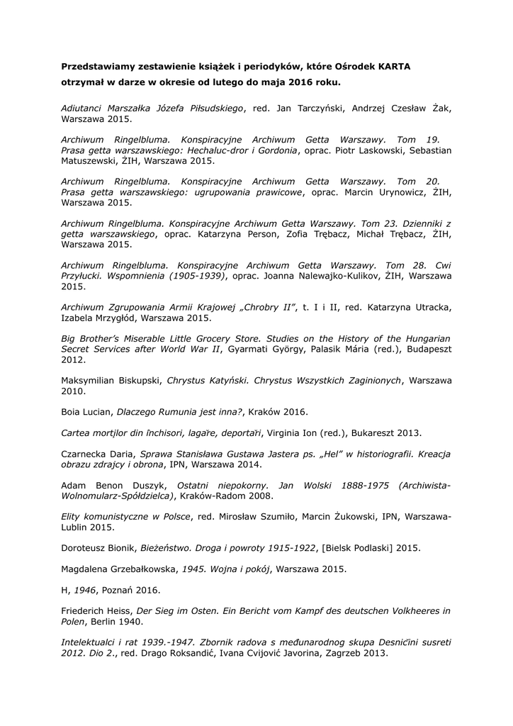 Przedstawiamy zestawienie książek i periodyków, które Ośrodek KARTA otrzymał w darze w okresie od lutego do maja 2016 roku. Adiutanci Marszałka Józefa Piłsudskiego, red. Jan Tarczyński, Andrzej Czesław Żak, Warszawa 2015. Archiwum Ringelbluma. Konspiracyjne Archiwum Getta Warszawy. Tom 19. Prasa getta warszawskiego: Hechaluc-dror i Gordonia, oprac. Piotr Laskowski, Sebastian Matuszewski, ŻIH, Warszawa 2015. Archiwum Ringelbluma. Konspiracyjne Archiwum Getta Warszawy. Tom 20. Prasa getta warszawskiego: ugrupowania prawicowe, oprac. Marcin Urynowicz, ŻIH, Warszawa 2015. Archiwum Ringelbluma. Konspiracyjne Archiwum Getta Warszawy. Tom 23. Dzienniki z getta warszawskiego, oprac. Katarzyna Person, Zofia Trębacz, Michał Trębacz, ŻIH, Warszawa 2015. Archiwum Ringelbluma. Konspiracyjne Archiwum Getta Warszawy. Tom 28. Cwi Przyłucki. Wspomnienia (1905-1939), oprac. Joanna Nalewajko-Kulikov, ŻIH, Warszawa 2015. Archiwum Zgrupowania Armii Krajowej „Chrobry II”, t. I i II, red. Katarzyna Utracka, Izabela Mrzygłód, Warszawa 2015. Big Brother’s Miserable Little Grocery Store. Studies on the History of the Hungarian Secret Services after World War II, Gyarmati György, Palasik Mária (red.), Budapeszt 2012. Maksymilian Biskupski, Chrystus Katyński. Chrystus Wszystkich Zaginionych, Warszawa 2010. Boia Lucian, Dlaczego Rumunia jest inna?, Kraków 2016. Cartea morţilor din închisori, lagăre, deportări, Virginia Ion (red.), Bukareszt 2013. Czarnecka Daria, Sprawa Stanisława Gustawa Jastera ps. „Hel” w historiografii. Kreacja obrazu zdrajcy i obrona, IPN, Warszawa 2014. Adam Benon Duszyk, Ostatni niepokorny. Jan Wolnomularz-Spółdzielca), Kraków-Radom 2008. Wolski 1888-1975 (Archiwista- Elity komunistyczne w Polsce, red. Mirosław Szumiło, Marcin Żukowski, IPN, WarszawaLublin 2015. Doroteusz Bionik, Bieżeństwo. Droga i powroty 1915-1922, [Bielsk Podlaski] 2015. Magdalena Grzebałkowska, 1945. Wojna i pokój, Warszawa 2015. H, 1946, Poznań 2016. Friederich Heiss, Der Sieg im Osten. Ein Bericht vom Kampf des deutschen Volkheeres in Polen, Berlin 1940. Intelektualci i rat 1939.-1947. Zbornik radova s međunarodnog skupa Desničini susreti 2012. Dio 2., red. Drago Roksandić, Ivana Cvijović Javorina, Zagrzeb 2013. Krzysztof Jasiewicz, Oni. Okupacyjny aparat sowiecki na Kresach Północno-Wschodnich w latach 1939-1941, Warszawa 2015. Sławomir Kalbarczyk, Kazimierz Bartel (1882-1941). Uczony w świecie polityki, IPN, Warszawa 2015. Marian Kaleta, Emigrancka spółka „szmugiel”. Wspomnienia dostawcy sprzętu poligraficznego przemycanego do Polski dla opozycji antykomunistycznej w latach 19781989, IPN, Warszawa 2015. Antoni Kochański, 526 lat dziejów miasta Tykocina na tle historii Polski, [Białystok] 2013. Tadeusz Kraszewski, Opowiadanie niedokończone, Bydgoszcz 2001. Major Hieronim Dekutowski „Zapora” (1918-1949), red. Izabela Szufa, IPN, Warszawa 2016. Stanisław Maliszewski, „Emma”. Wywiad rzeka z Marią Straszewską, Warszawa 2011. Permskie Poliaki, Perm 2001. Plakat wojskowy w Zbiorach Specjalnych Centralnej Biblioteki Wojskowej, Warszawa 2015. Polityka bezpieczeństwa. Polska. Ukraina, red. Tomasz Horbowski, Piotr Kosiewski, Warszawa 2015. Polska Agencja Rozwoju Przedsiębiorczości 2000-2015, red. Łukasz Bertram, Warszawa 2015. Prelude to Demolishing the Iron Curtain. Pan-European Picnic, Sopron 19 August 1989, red. György Gyarmati, Sopron-Budapeszt 2012. Pro memoria – dla pamięci …o Janie Kraszewskim, red. Tadeusz Kraszewski, Paprotnia 2015. Marcin Przegiętka, Komunikacja i polityka. Transport kolejowy i drogowy w stosunkach polsko-niemieckich w latach 1918-1939, IPN, Warszawa 2015. Rosyjski łącznik. Rzecz o Jerzym Pomianowskim, red. Iwona Hofman, Lublin 2016. Hanna Rudniańska, Korczak, Tokarzewski i my. Wspomnienia i rozmowa z Krystyną Shmeruk, Kraków 2005. Gerhard Schoenberner, The Yellow Star. The Persecution of the Jews in Europe 19331945, Londyn 1978. Siedem dekad polskiej przedsiębiorczości, red. Łukasz Bertram, Warszawa 2015. Janina Stobniak-Smogorzewska, Straty osobowe kresowego 1939-1945, Warszawa 2015. osadnictwa wojskowego Świadkowie historii. Represje niemieckie wobec obywateli polskich w okresie II wojny światowej, Warszawa 2010. To, co trwałe, fot. Tomasz Tomaszewski, tekst Grzegorz Kapla, Bukowina Tatrzańska 2015. Ubity v Katyni : kniga pamâti pol'skih voennoplennyh - uznikov kozel'skogo lagerâ NKVD, rasstrelânnyh po rešeniû politburo CK VKP(b) ot 5 marta 1940 goda, red. Daniel' Aleksandr Ulievič, Moskwa 2015. Henryk Walendowski, Wojna 1939-1945. Wypędzenia-poniewierka w oczach dziecka, Poznań-Warszawa 2015. Wina i kara. Społeczeństwa wobec rozliczeń zbrodni popełnionych przez reżimy totalitarne w latach 1939-1956. Studia i materiały pod redakcją naukową Patryka Pleskota, red. Patryk Pleskot, IPN, Warszawa 2015. Krzysztof Zając, Michał Woźny, Kozienice lat wojny i okupacji 1939-1945 na starej fotografii, Kozienice 2014. Zasada strukturalna jako podstawa opisu archiwaliów w zintegrowanych systemach informacji archiwalnej, red. Rafał Leśkiewicz, Anna Ceglińska, IPN, Warszawa 2015. Bolesław Żyliński, Wspomnienia z państwa antychrysta, Biały Dunajec-Ostróg 2016. Akcent. Literatura i sztuka. Kwartalnik, 2016: nr 1(143). Białoruskie Zeszyty Historyczne, Białystok 2015: nr 44. Biuletyn Archiwum Polskiej Akademii Nauk, Warszawa 2015: nr 56. Biuletyn IPN pamięć.pl, 2016: nr 1(46). Biuletyn Towarzystwa Regionalnego Hrubieszowskiego, wydanie specjalne, 2015. Jaworzniacy. Pismo młodocianych więźniów politycznych lat 1944-1956, 2014: nr 10(267). Jaworzniacy. Pismo młodocianych więźniów politycznych lat 1944-1956, 2014: nr 11(268). Kombatant. Biuletyn Urzędu do Spraw Kombatantów i Osób Represjonowanych, 2015: nr 6(294). Kombatant. Biuletyn Urzędu do Spraw Kombatantów i Osób Represjonowanych, 2016: nr 1(301). Kombatant. Biuletyn Urzędu do Spraw Kombatantów i Osób Represjonowa