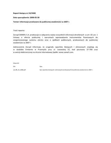 Raport bieżący nr 24/2008 Data sporządzenia: 2008-05-30 Temat: Informacje przekazane do publicznej wiadomości w 2007 r. Treść raportu: Zarząd SANWIL S.A. przekazuje w załączeniu wykaz wszystkich informacji określonych w art. 65 ust. 1 Ustawy o ofercie publicznej i warunkach wprowadzania instrumentów finansowych do zorganizowanego systemu obrotu oraz o spółkach publicznych, przekazanych do publicznej wiadomości w 2007 r. Jednocześnie Zarząd informuje, że oryginały raportów bieżących i okresowych znajdują się w siedzibie Emitenta w Przemyślu przy ul. Lwowskiej 52, kod pocztowy 37-700 oraz w wersji elektronicznej na stronie internetowej Spółki: www.sanwil.com. Załączniki Plik Opis zal_RB_24_2008.pdf Spis raportów bieżących i okresowych przekazanych do publicznej wiadomości w 2007 r.