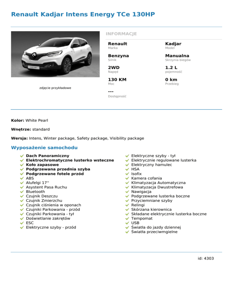 Renault Kadjar Intens Energy TCe 130HP INFORMACJE zdjęcie przykładowe Renault Kadjar Marka Model Benzyna Manualna Silnik Skrzynia biegów 2WD 1.2 L Napęd pojemność 130 KM 0 km Moc Przebieg --Dostępność Kolor: White Pearl Wnętrze: standard Wersja: Intens, Winter package, Safety package, Visibility package Wyposażenie samochodu Dach Panoramiczny Elektrochromatyczne lusterko wsteczne Koło zapasowe Podgrzewana przednia szyba Podgrzewane fotele przód ABS Alufelgi 17'' Asystent Pasa Ruchu Bluetooth Czujnik Deszczu Czujnik Zmierzchu Czujnik ciśnienia w oponach Czujniki Parkowania - przód Czujniki Parkowania - tył Doświetlanie zakrętów ESC Elektryczne szyby - przód Elektryczne szyby - tył Elektrycznie regulowane lusterka Elektryczny hamulec HSA Isofix Kamera cofania Klimatyzacja Automatyczna Klimatyzacja Dwustrefowa Nawigacja Podgrzewane lusterka boczne Przyciemniane szyby Relingi Skórzana kierownica Składane elektrycznie lusterka boczne Tempomat USB Światła do jazdy dziennej Światła przeciwmgielne id: 4303 Powered by TCPDF (www.tcpdf.org)