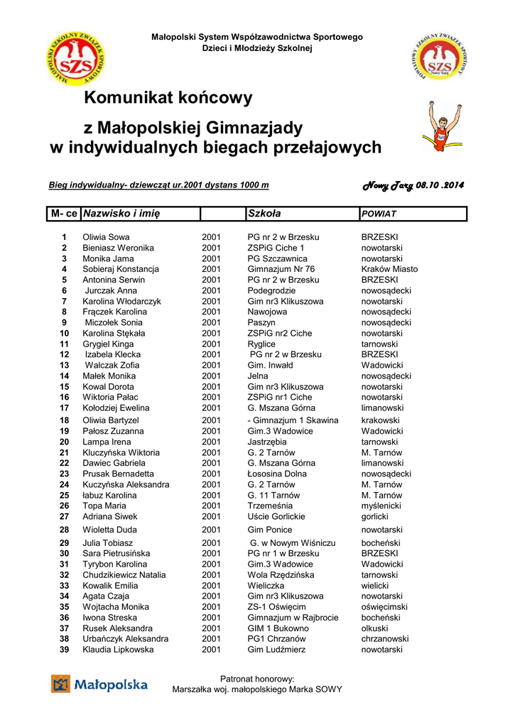 Małopolski System Współzawodnictwa Sportowego Dzieci i Młodzieży Szkolnej Komunikat końcowy z Małopolskiej Gimnazjady w indywidualnych biegach przełajowych Bieg indywidualny- dziewcząt ur.2001 dystans 1000 m Nowy Targ 08.10 .2014 M- ce Nazwisko i imię Szkoła POWIAT 1 2 3 4 5 6 7 8 9 10 11 12 13 14 15 16 17 18 19 20 21 22 23 24 25 26 27 Oliwia Sowa Bieniasz Weronika Monika Jama Sobieraj Konstancja Antonina Serwin Jurczak Anna Karolina Włodarczyk Frączek Karolina Miczołek Sonia Karolina Stękała Grygiel Kinga Izabela Klecka Walczak Zofia Małek Monika Kowal Dorota Wiktoria Pałac Kołodziej Ewelina Oliwia Bartyzel Pałosz Zuzanna Lampa Irena Kluczyńska Wiktoria Dawiec Gabriela Prusak Bernadetta Kuczyńska Aleksandra łabuz Karolina Topa Maria Adriana Siwek 2001 2001 2001 2001 2001 2001 2001 2001 2001 2001 2001 2001 2001 2001 2001 2001 2001 2001 2001 2001 2001 2001 2001 2001 2001 2001 2001 PG nr 2 w Brzesku ZSPiG Ciche 1 PG Szczawnica Gimnazjum Nr 76 PG nr 2 w Brzesku Podegrodzie Gim nr3 Klikuszowa Nawojowa Paszyn ZSPiG nr2 Ciche Ryglice PG nr 2 w Brzesku Gim. Inwałd Jelna Gim nr3 Klikuszowa ZSPiG nr1 Ciche G. Mszana Górna - Gimnazjum 1 Skawina Gim.3 Wadowice Jastrzębia G. 2 Tarnów G. Mszana Górna Łososina Dolna G. 2 Tarnów G. 11 Tarnów Trzemeśnia Uście Gorlickie BRZESKI nowotarski nowotarski Kraków Miasto BRZESKI nowosądecki nowotarski nowosądecki nowosądecki nowotarski tarnowski BRZESKI Wadowicki nowosądecki nowotarski nowotarski limanowski krakowski Wadowicki tarnowski M. Tarnów limanowski nowosądecki M. Tarnów M. Tarnów myślenicki gorlicki 28 Wioletta Duda 2001 Gim Ponice nowotarski 29 30 31 32 33 34 35 36 37 38 39 Julia Tobiasz Sara Pietrusińska Tyrybon Karolina Chudzikiewicz Natalia Kowalik Emilia Agata Czaja Wojtacha Monika Iwona Streska Rusek Aleksandra Urbańczyk Aleksandra Klaudia Lipkowska 2001 2001 2001 2001 2001 2001 2001 2001 2001 2001 2001 G. w Nowym Wiśniczu PG nr 1 w Brzesku Gim.3 Wadowice Wola Rzędzińska Wieliczka Gim nr3 Klikuszowa ZS-1 Oświęcim Gimnazjum w Rajbrocie GIM 1 Bukowno PG1 Chrzanów Gim Ludźmierz bocheński BRZESKI Wadowicki tarnowski wielicki nowotarski oświęcimski bocheński olkuski chrzanowski nowotarski Patronat honorowy: Marszałka woj. małopolskiego Marka SOWY Małopolski System Współzawodnictwa Sportowego Dzieci i Młodzieży Szkolnej 40 41 Drwal Sara Julia Stawiarska 2001 2001 Pleśna GIM 6 Nowy Sącz tarnowski M. Nowy Sącz 42 Patrycja Pernal 2001 Uście Gorlickie gorlicki 43 Iwaniec Małgorzata 2001 G - Kościelisko tatrzański 44 Julia Niedojadło 2001 PG nr 1 w Brzesku BRZESKI 45 Dudziak Weronika 2001 Niepołomice wielicki 46 Stachoń Natalia 2001 GMS Zakopane tatrzański 47 48 49 50 51 52 Pawowicz Paulina Gąszczak Julia Mrugała Urszula Cebula Alicja Kawa Marta Gil Agata 2001 2001 2001 2001 2001 2001 G2 Zawoja PG1 Chrzanów GMS Zakopane GIM 4 Olkusz G1 Stryszawa SUSKI chrzanowski tatrzański olkuski SUSKI wielicki 53 54 55 56 57 58 59 60 61 62 63 64 65 66 67 68 69 70 71 72 73 74 75 76 77 78 79 80 81 Liberda Magdalena Pyrtek Małgorzata Szpak Gabriela Dzierwa Hanna Lewińska Magda Kramarczyk Kamila Frączek Eliza Porębska Natalia Ceremuga Zuzanna Sordyl Weronika Kubasiak Patrycja Anna Zabagło Ewelina Kołtko Stawowczyk Karolina Stawowczyk Karolina Lis Barbara Wolak Klaudia Baran Nikola Ślazyk Monika Drabczyk Klaudia Kowalcze Katarzyna Sikora Kinga Prus Wiktoria Katarzyna Dutka Jagocka Maja Wrona Oliwia Mitka Angelika Patrycja Zym Urban Katarzyna 2001 2001 2001 2001 2001 2001 2001 2001 2001 2001 2001 2001 2001 2001 2001 2001 2001 2001 2001 2001 2001 2001 2001 2001 2001 2001 2001 2001 2001 G. Poręba Wielka Rudnik G Sidzina PG 2 Chrzanów Wieliczka ZSP-1 Osiek Nawojowa G Zembrzyce Gim 3 Trzebinia Gim.1 Andrzchw G1 Stryszawa - Gimnazjum 2 Skawina Uście Gorlickie Gim.1 Andrzchw G. 1 Andrychów G. Kasinka Mała G. 9 Tarnów Gimnazjum Nr 32 G. Słopnice ZSP-1 Osiek G Jordanów Gim 1 Myślenice Gim. Roczyny Ropa Gimnazjum Nr 72 Gdów G. Tenczynek G. w ZS w Królówce Gdów bocheński wielicki 82 83 84 85 86 87 88 89 90 Bogusława Bracz Jąkała Kamila Boduch Natalia Jańczyk Izabela Oliwia Kutermak Aleksandra Skoczeń Angelina Kasztulska Myślińska Małgorzata Sołtysik Izabela 2001 2001 2001 2001 2001 2001 2001 2001 2001 Uście Gorlickie Skomielna Biała G. Kasinka Mała Pałecznica G. nr 1 w Skawinie GIM 9 Nowy Sącz Gimnazjum w Trzcianie Gim 1 Trzebinia - Gimnazjum gorlicki myślenicki limanowski Proszowice krakowski M. Nowy Sącz bocheński chrzanowski krakowski Niepołomice Patronat honorowy: Marszałka woj. małopolskiego Marka SOWY limanowski myślenicki SUSKI chrzanowski wielicki oświęcimski nowosądecki SUSKI chrzanowski Wadowicki SUSKI krakowski gorlicki Wadowicki Wadowicki limanowski M. Tarnów Kraków Miasto limanowski oświęcimski SUSKI myślenicki Wadowicki gorlicki Kraków Miasto wielicki Małopolski System Współzawodnictwa Sportowego Dzieci i Młodzieży Szkolnej 91 Mazur Weronika 2001 GIM 2 Bukowno olkuski 92 93 94 95 96 97 98 99 100 Edyta Bielewicz Bielecicz Klaudia Laura Kowalczyk Sydor Olga Agnieszka Rówińska Głowacz Natalia Smutek Karina Piekarz Magdalena Gądek Wiktoria 2001 2001 2001 2001 2001 2001 2001 2001 2001 Brzana G. Brzana GIM Akademickie N. Sącz Gimnazjum Nr 1 Ropa Koszyce Koszyce Gimnazjum Nr 46 Szczucin gorlicki gorlicki M. Nowy Sącz Kraków Miasto gorlicki Proszowice Proszowice Kraków Miasto dąbrowski 101 102 103 Paulina Stawiarska Basoń Aleksandra Mielewska Angelika 2001 2001 2001 Brzana GIM 2 Wolbrom Pałecznica gorlicki olkuski Proszowice Sklasyfikowano Zgłoszono 103 135 Bieg indywidualny- dziewcząt ur.2000 dystans 1000 m M- ce Nazwisko i imię Szkoła POWIAT 1 2 3 4 5 6 7 8 9 10 11 12 13 14 15 16 17 18 19 20 21 22 23 24 25 26 27 28 29 Justyna Zając Kwapisz Karolina Olszowska Klaudia Śliwińska Klaudia Karciarz Patrycja Olchawa Joanna Kołpa Patrycja Jacewicz Patrycja Maciejczyk Wiktoria Kuraś Marta Hajduk Edyta Kozioł Natalia Sikora Marta Basiura