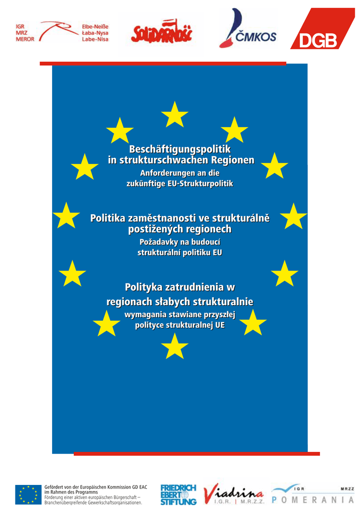 Beschäftigungspolitik in strukturschwachen Regionen Anforderungen an die zukünftige EU-Strukturpolitik Politika zaměstnanosti ve strukturálně postižených regionech Požadavky na budoucí strukturální politiku EU Polityka zatrudnienia w regionach słabych strukturalnie wymagania stawiane przyszłej polityce strukturalnej UE Gefördert von der Europäischen Kommission GD EAC im Rahmen des Programms Förderung einer aktiven europäischen Bürgerschaft – Branchenübergreifende Gewerkschaftsorganisationen. Impressum Herausgeber: DGB Bezirk Sachsen Schützenplatz 14, 01067 Dresden E-Mail: [email protected] Redaktion / V.i.S.d.P.: Anna Bernstorf Layout / Druck: 4 PEOPLE, Leipzig Download: www.dgb-sachsen.de, www.igr-elbe-neisse.org www.meror-labe-nisa.org, www.mrz-laba-nysa.org Inhaltsverzeichnis Begrüßung und Einführung Hanjo Lucassen, Vorsitzender des DGB Bezirk Sachsen Seite 3 Beschäftigungspolitik in strukturschwachen Regionen und Zukunft des ESF ab 2007 Klaus Müller, Generaldirektion Beschäftigung, Soziales und Chancengleichheit Seite 6 EU-Strukturförderung in Deutschland 2007 - 2013 Dr. Christel Degen, DGB-Bundesvorstand Seite 10 Vorbereitung des Operationellen Programms für den ESF in Sachsen Dr. Katrin Ihle, Sächsisches Staatsministerium für Wirtschaft und Arbeit Seite 13 Aktueller Stand der Planung der EU-Strukturfonds (2007 – 2013) in Tschechien Richard Falbr, Mitglied des Europäischen Parlaments Seite 16 Vlasitmil Altner, ČMKOS und OS PHGN Aktueller Stand der Planung der EU-Strukturfonds (2007-2013) in der Republik Polen Longin Komołowski, Arbeitsminister der Republik Polen a.D. Seite 20 Was hat die EU-Strukturförderung für Ostdeutschland gebracht? Dr. Astrid Ziegler, Wirtschafts- und Sozialwissenschaftliches Institut in der Hans-Böckler-Stiftung Seite 21 Potenzialberatung zum Beschäftigungsaufbau im Verarbeitenden Gewerbe in Berlin Rüdiger Lötzer, IG Metall Bezirk Berlin-Brandenburg-Sachsen Seite 26 Abschlussdiskussion Ausblick auf die EU-Strukturförderung 2007-2013. Betriebliche Sichtweisen und gewerkschaftliche Anforderungen Seite 28 1 2 Begrüßung und Einführung men wie beispielsweise die Europäische Verfassung und die EUDienstleistungsrichtlinie aufzugreifen und damit eine breite Öffentlichkeit zu erreichen. Hanjo Lucassen, Vorsitzender DGB Bezirk Sachsen Sehr geehrte Damen und Herren, liebe Kolleginnen und Kollegen, ich möchte Sie ganz herzlich zu unserer gemeinsamen trilateralen Konferenz hier in Dresden begrüßen. Ich habe auch die Grüße der DGB-Vorsitzenden von Berlin-Brandenburg, Dieter Scholz, und von Mecklenburg-Vorpommern, Peter Deutschland, auszurichten, die für die Interregionalen Gewerkschaftsräten nördlich von Sachsen zuständig sind. Mit der heutigen Veranstaltung haben wir wieder ein aktuelles Thema aufgegriffen. Denn nicht nur bei der Fußballweltmeisterschaft befinden wir uns in einer heißen Phase, sondern auch in der Vorbereitung der Strukturfondsperiode 2007 bis 2013. Die Einigung auf europäischer Ebene über die Finanzen für die europäische Strukturpolitik hat lange gedauert. Manche unkten sogar, dass die Europäische Union an dem Streit um die Finanzen zerbrechen könnte und das war angesichts der zeitgleichen Ablehnung der europäischen Verfassung durch einige Länder durchaus nicht abwegig. Ende vergangenen Jahres wurde dann endlich von den Staats- und Regierungschefs ein Kompromiss gefunden, der den Finanzrahmen für die Strukturfonds absteckte. In einer bemerkenswerten Aktion hat das Europäische Parlament erstmalig den Haushaltsentwurf der Kommission abgelehnt, weil aus Sicht der Abgeordneten eine stärkere Förderung der strukturschwachen Regionen nötig war. Immerhin 4 Mrd. Euro hat das Europäische Parlament so noch einmal für die strukturschwachen Regionen, also auch für unsere Grenzregion, herausgeholt. Herzlichen Dank. Ich denke auch an dich, Kollege Falbr. Ein besonderer Willkommensgruß gilt Richard Falbr, Europaabgeordneter der tschechischen Sozialdemokraten und ehemaliger Vorsitzender der Böhmisch-mährischen Konföderation der Gewerkschaftsverbände in Tschechien. Er war immer ein Förderer des Europagedankens und vor allen Dingen der Zusammenarbeit der Gewerkschaften hier im Grenzraum. Ich begrüße ganz herzlich Klaus Müller von der Generaldirektion Beschäftigung, Soziales und Chancengleichheit der Europäischen Kommission. Herzlich begrüßen möchte ich Longin Komołowski, den ehemaligen Arbeitsminister der Republik Polen und heute Vertreter des Interregionalen Gewerkschaftsrates Pomerania und der Gewerkschaft NSZZ „Solidarność“ Stettin. Ich begrüße ganz herzlich meinen Freund Bogusław Wojtas, stellvertretender Vorsitzender der Gewerkschaft „NSZZ“ Solidarność in der Region Jeliena Góra und genauso herzlich begrüße ich Mietek Jurek, Vorsitzender der NSZZ „Solidarność“ in Stettin. Von der Bergbaugewerkschaft der Tschechischen Republik ist Vlastimil Altner zu uns gekommen - herzlich willkommen. Kollegin Miroslava Palečková, Vorsitzende der tschechischen Textilgewerkschaft, ist allen ein vertrautes Gesicht, ich freue mich sehr, Miroslava, dass du heute bei uns bist. Herzlich begrüße ich Frau Dr. Katrin Ihle, Leiterin der Abteilung Beschäftigungsförderung, Europäische Sozialfonds im Sächsischen Staatsministerium für Wirtschaft und Arbeit und ich begrüße Miroslav Tlapák, den Präsidenten unseres Interregionalen Gewerkschaftsrates Elbe-Neiße, herzlich willkommen, Miro. Ich freue mich auch, dass Clemens Rode, der Chef der Friedrich-Ebert-Stiftung Warschau, zu uns gekommen ist. Die Vorstellung der Referenten und Podiumsteilnehmer wird Kollege Dr. Jürgen Riedel übernehmen, der uns durch die Veranstaltung führt. Nach diesen Grundsatzentscheidungen auf europäischer Ebene sind jetzt unsere Länder und Regionen aufgefordert, über die Mittelaufteilung zu entscheiden. Aus Sachsen ein paar Zahlen: die Sächsische Staatsregierung hat eine Aufteilung im Verhältnis