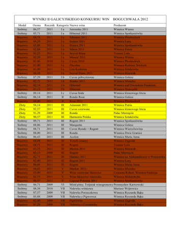WYNIKI II GALICYJSKIEGO KONKURSU WIN Medal Srebrny Srebrny Brązowy Brązowy Brązowy Brązowy Brązowy Brązowy Brązowy Brązowy Brązowy Brązowy Srebrny Brązowy Brązowy Brązowy Srebrny Srebrny Brązowy Złoty Złoty Złoty Złoty Srebrny Srebrny Srebrny Srebrny Srebrny Brązowy Brązowy Brązowy Brązowy Brązowy Brązowy Brązowy Brązowy Brązowy Brązowy Brązowy Srebrny Srebrny Srebrny Srebrny Brązowy Brązowy Ocena 86,57 85,71 84,74 84,29 83,88 82,86 82,25 82,20 81,86 81,00 81,00 80,38 87,29 82,75 82,14 81,13 89,14 86,14 84,00 94,14 92,57 91,29 90,57 89,71 88,86 88,71 88,00 86,43 84,88 84,71 83,75 83,13 82,71 82,00 80,88 84,43 83,00 82,75 80,57 86,71 88,38 87,57 85,88 82,00 81,29 BOGUCHWAŁA 2012 Rocznik Kategoria Nazwa wina Producent 2011 Ia Jutrzenka 2011 Winnica Wiarus 2011 Ia Hibernal 2011 Winnica Spotkaniówka 2011 Ia Sibemus 2011 Winnica Płochockich 2011 Ia Solaris 2011 Winnica Łany 2011 Ia Bianca 2011 Winnica Spotkaniówka 2011 Ia Sibera 2011 Winnica Patria 2011 Ia Seyval Blanc Tomasz Lula 2011 Ia Muscat 2011 Winnica Wiarus 2010 Ia Cuvee 2010 Winnica Płochockich 2011 Ia Placidus Winnica Rodziny Steckich 2011 Ia Lira Korbowa Winnica Sztukówka 2011 Ia Seyval Blanc 2011 Winnica Mazurak 2011 Ib Cuvee półwytrawne Winnica Golesz 2011 Ib Bianka 2011 Winnica Mieszko 2011 Ib Hibernal Winnica nad Dworskim Potokiem 2011 Ib Hibernal Winnica Straszydle 2011 Ic Cuvee białe Winnica klonowego liścia 2011 II Rondo Rose Winnica Golesz 2011 II Rose 2011 Winnica Płochockich 2011 III Adamant 2011 Winnica Patria 2011 III Cuvee czerwone Winnica klonowego liścia 2009 III Rondo Pałac Mierzęcin 2011 III Harmonia Polska Winnica Sztukówka 2011 III Regent 2011 Winnica Spotkaniówka 2011 III Marquette Winnica Golesz 2011 III Cuvee Rondo + Regent Winnica Wierzchowina 2011 III Rondo Winnica Dwie Granice 2011 III Acolon Winnica Maria Anna 2011 III Trzech cesarzy Winnica Zagroda 2011 III Regent Tomasz Lula 2011 III Marlon 2011 Winnica Mazurak 2009 III Regent Pałac Mierzęcin 2011 III Dariusz 2011 Winnica na Aleksandrowie w Przeworsku 2011 III Regent 2011 Winnica Łany 2011 III Regent Winnica Maria Anna 2011 V Muskat 2011 Winnica Mieszko 2011 V Wino czerwone likierowe Czarnota Robert, Winnica Nadzieja 2011 V Wino likierowe Jutrzenka Winnica Melancholia 2011 V Liqueur Polomia 2011 Winnica Spotkaniówka 2009 VI Miód pitny, Trójniak winogronowy Przemysław Karwowski 2010 VII Nalewka wiśniowa Mariusz Wójtowicz 2009 VII Nalewka Porzeczkowa Winnica Ryszarda Bąka 2009 VII Nalewka z Pigwowca Winnica Ryszarda Bąka 2009 VII Pigwówka Winnica Zagroda 2009 VII Nalewka z Czeremchy Winnica Ryszarda Bąka