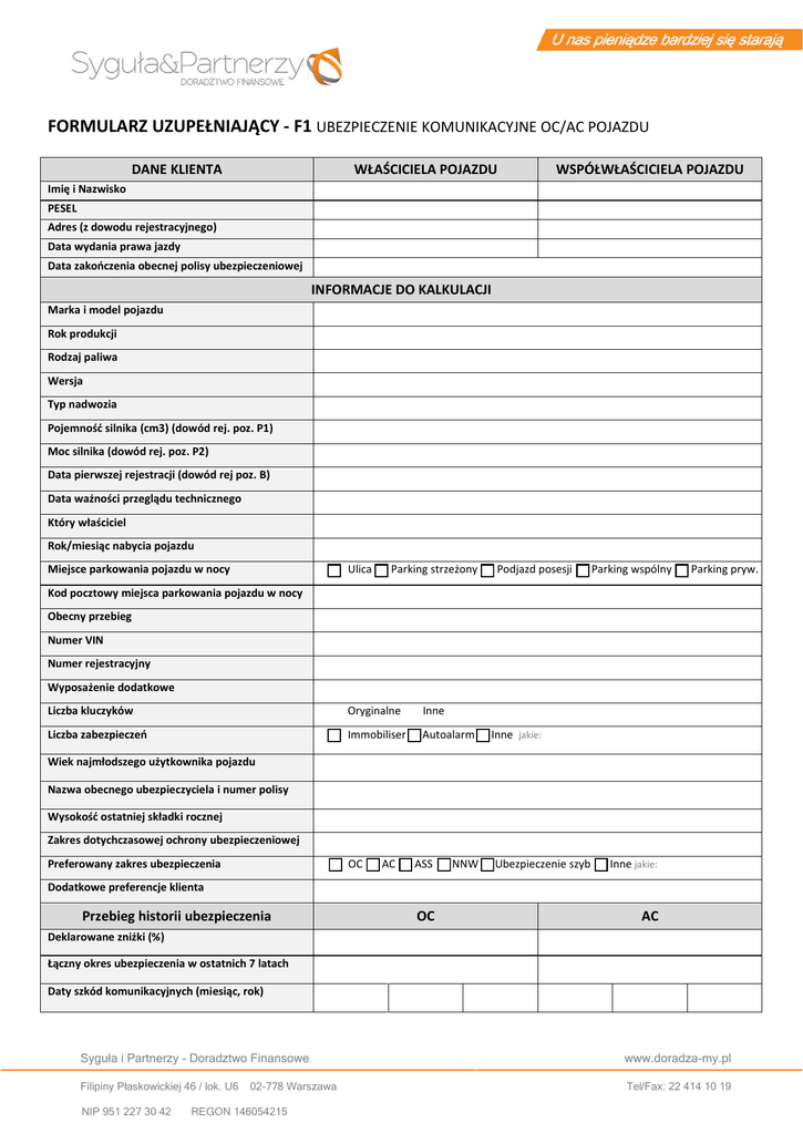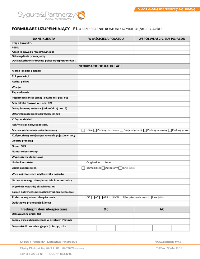 FORMULARZ UZUPEŁNIAJĄCY - F1 UBEZPIECZENIE KOMUNIKACYJNE OC/AC POJAZDU DANE KLIENTA WŁAŚCICIELA POJAZDU WSPÓŁWŁAŚCICIELA POJAZDU Imię i Nazwisko PESEL Adres (z dowodu rejestracyjnego) Data wydania prawa jazdy Data zakończenia obecnej polisy ubezpieczeniowej INFORMACJE DO KALKULACJI Marka i model pojazdu Rok produkcji Rodzaj paliwa Wersja Typ nadwozia Pojemność silnika (cm3) (dowód rej. poz. P1) Moc silnika (dowód rej. poz. P2) Data pierwszej rejestracji (dowód rej poz. B) Data ważności przeglądu technicznego Który właściciel Rok/miesiąc nabycia pojazdu Miejsce parkowania pojazdu w nocy Ulica Parking strzeżony Podjazd posesji Parking wspólny Parking pryw. Kod pocztowy miejsca parkowania pojazdu w nocy Obecny przebieg Numer VIN Numer rejestracyjny Wyposażenie dodatkowe Liczba kluczyków Oryginalne Inne Liczba zabezpieczeń Immobiliser Autoalarm Inne jakie: Wiek najmłodszego użytkownika pojazdu Nazwa obecnego ubezpieczyciela i numer polisy Wysokość ostatniej składki rocznej Zakres dotychczasowej ochrony ubezpieczeniowej Preferowany zakres ubezpieczenia OC AC ASS NNW Ubezpieczenie szyb Inne jakie: Dodatkowe preferencje klienta Przebieg historii ubezpieczenia OC AC Deklarowane zniżki (%) Łączny okres ubezpieczenia w ostatnich 7 latach Daty szkód komunikacyjnych (miesiąc, rok) Syguła i Partnerzy - Doradztwo Finansowe www.doradza-my.pl Filipiny Płaskowickiej 46 / lok. U6 Tel/Fax: 22 414 10 19 NIP 951 227 30 42 02-778 Warszawa REGON 146054215 ZGODA NA PRZETWARZANIE DANYCH OSOBOWYCH PRZEZ PIOTR SYGUŁA I PARTNERZY – DORADZTWO FINANSOWE Niniejszym udzielam zgody, w rozumieniu art. 23 ust. 1 pkt. 1 Ustawy z dnia 29 sierpnia 1997r. o ochronie danych osobowych (Dz. U. 2002, nr 101, poz. 926 ze zm.), na przetwarzanie przez firmę Piotr Syguła i Partnerzy - Doradztwo Finansowe moich danych osobowych na określonych poniżej warunkach. I. Administrator danych osobowych. Piotr Syguła i Partnerzy - Doradztwo Finansowe 02-778 Warszawa, Filipiny Płaskowickiej 46 / lok. U6 Telefon: 0 22 414 10 19 Fax: E-Mail: [email protected] Internet: www.doradza-my.pl II. Zakres przetwarzania danych osobowych. 1. Dane osobowe: Zakres przetwarzania danych Dane klienta A. Imię i nazwisko C. Data i miejsce urodzenia D. Numer PESEL E. Adres zameldowania F. Adres korespondencyjny G. Numer telefonu komórkowego H. Adres e-mail 2. B. Płeć Dane majątkowe – zawarte w formularzach uzupełniających sporządzonych i przekazanych przeze mnie przedstawicielowi firmy Piotr Syguła i Partnerzy – Doradztwo Finansowe, w szczególności dane dotyczące: A. Aktualnego stanu majątkowego, B. Zawartych umów ubezpieczeń majątkowych i osobowych. III. Cele przetwarzania danych osobowych. 1. Przedstawienie klientowi indywidualnej, optymalnej dla jego potrzeb, oferty produktów i usług finansowych, 2. Bieżąca weryfikacja adekwatności i efektywności produktów i usług finansowych, zaoferowanych i/lub realizowanych w stosunku do Klienta, 3. Podejmowanie w stosunku do Klienta działań marketingowych i promocyjnych, dotyczących oferowanych produktów i usług finansowych. 4. Możliwość uczestnictwa w programie promocyjnym polecash.pl organizowanym w formie konkursu niepublicznego. IV. Okres przetwarzania danych osobowych. 1. Niniejsza zgoda ma charakter bezterminowy i obejmuje również przetwarzanie przez firmę Piotr Syguła i Partnerzy - Doradztwo Finansowe danych osobowych Klienta w przyszłości, pod warunkiem, że nie ulegną zmianie cele przetwarzania określone w pkt. III. V. Przekazywanie danych osobowych osobom trzecim. 1. Dane osobowe Klienta będą traktowanie jako ściśle poufne i nie będą udostępniane osobom trzecim bez zgody Klienta, chyba, że przepisy prawa powszechnie obowiązującego będą stanowić inaczej. Firma zobowiązuje się do zabezpieczenia danych osobowych Klienta poprzez zastosowanie odpowiednich środków technicznych i organizacyjnych, przewidzianych w Ustawie z dnia 29 sierpnia 1997 r. o ochronie danych osobowych (Dz. U. 2002, nr 101, poz. 926 ze zm.). Prawa Klienta związane z przetwarzaniem jego danych osobowych. Klientowi przysługuje prawo kontroli przetwarzania danych osobowych, które jego dotyczą, a zwłaszcza prawo do: 1. Uzyskania wyczerpującej informacji, czy jego dane są włączone do zbioru danych i jaka jest nazwa tego zbioru oraz do ustalenia administratora danych, adresu jego siedziby i pełnej nazwy, 2. Uzyskania informacji o celu, zakresie i sposobie przetwarzania danych zawartych w zbiorze, 3. Uzyskania informacji, od kiedy przetwarza się w zbiorze dane jego dotyczące oraz podania w powszechnie zrozumiałej formie treści tych danych, 4. Uzyskania informacji o źródle, z którego pochodzą dane jego dotyczące, 5. Uzyskania informacji o sposobie udostępniania danych, a w szczególności informacji o odbiorcach lub kategoriach odbiorców, którym te dane są udostępniane, 6. Żądania niezwłocznego uzupełnienia, uaktualnienia, sprostowania danych osobowych, czasowego lub stałego wstrzymania ich przetwarzania lub ich usunięcia, jeżeli są one niekompletne, nieaktualne, nieprawdziwe lub zostały zebrane z naruszeniem prawa, albo są już zbędne do realizacji celu, dla którego zostały zebrane, 7. Żądania niezwłocznego zaprzestania przetwarzania jego danych osobowych w określonym celu, 8. Żądania niezwłocznego usunięcia jego danych osobowych ze zbioru prowadzonego przez firmę. Klient może skorzystać z prawa do informacji, o których mowa w powyższych pkt. 1-5, nie częściej niż raz na 6 miesięcy. Firma zastrzega sobie termin 30 dni na spełnienie obowiązków informacyjnych, określonych w powyższych pkt. 1-5. Na wniosek Klienta firma udzieli informacji na piśmie. VI. _________________________________________________ data oraz podpis Klienta _____________________________________________________ podpis przedstawiciela Syguła i Partnerzy - Doradztwo Finansowe www.doradza-my.pl Filipiny Płaskowickiej 46 / lo