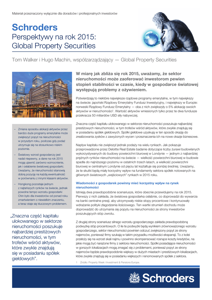 Materiał przeznaczony wyłącznie dla doradców i profesjonalnych inwestorów Schroders Perspektywy na rok 2015: – Global Property Securities Tom Walker i Hugo Machin, współzarządzający — Global Property Securities W miarę jak zbliża się rok 2015, uważamy, że sektor nieruchomości może zaoferować inwestorom pewien stopień stabilności w czasie, kiedy w gospodarce światowej występują problemy z ożywieniem. Potwierdzają to niektóre największe rządowe programy emerytalne, w tym największy na świecie: japoński Rządowy Emerytalny Fundusz Inwestycyjny, i największy w Europie: norweski Rządowy Fundusz Emerytalny — oba z nich zwiększyły o 5% alokację swoich aktywów w nieruchomości1. Wartość aktywów wniesionych tylko przez te dwa fundusze przekracza 50 miliardów USD siły nabywczej. –– Zmiana sposobu alokacji aktywów przez bardzo duże programy emerytalne może zwiększyć popyt na nieruchomości w przyszłym roku, podczas gdy podaż utrzymuje się na stosunkowo niskim poziomie. –– Światowy wzrost gospodarczy jest nadal niepewny, a dane na rok 2015 mogą ujawnić zarówno wzmocnienie, jak i osłabienie światowej gospodarki. Uważamy, że nieruchomości stanowią dobrą pozycję na każdą ewentualność w porównaniu z innymi klasami aktywów. –– Hongkong pozostaje jednym z najtańszych rynków na świecie, jednak powolne tempo wzrostu gospodarki Chin było dla inwestorów od ponad roku zmartwieniem o niewielkim znaczeniu, a teraz staje się kluczowym problemem. „Znaczna część kapitału ulokowanego w sektorze nieruchomości poszukuje najbardziej prestiżowych nieruchomości, w tym trofeów wśród aktywów, które zwykle znajdują się w posiadaniu spółek giełdowych”. Znaczna część kapitału ulokowanego w sektorze nieruchomości poszukuje najbardziej prestiżowych nieruchomości, w tym trofeów wśród aktywów, które zwykle znajdują się w posiadaniu spółek giełdowych. Spółki giełdowe uzyskują w ten sposób okazję do zrealizowania zysków z zawyżonych wycen i przeznaczenia ich na nowe okazje biznesowe. Napływ kapitału nie zwiększył jednak podaży na wielu rynkach. Jak pokazuje przeprowadzone przez Deloitte Real Estate badanie dotyczące liczby żurawi budowlanych wykorzystywanych do budowy powierzchni biurowej w Londynie — jednym z najbardziej prężnych rynków nieruchomości na świecie — wielkość powierzchni biurowej w budowie spadła do najniższego poziomu w ostatnich trzech latach, a wielkość powierzchni biurowej w centralnym Londynie od pięciu lat kształtuje się poniżej średniej. Uważamy, że te skutki będą miały korzystny wpływ na fundamenty sektora spółek notowanych na głównych światowych „wejściowych” rynkach w 2015 roku. Wiadomości z gospodarek powinny mieć korzystny wpływ na rynek nieruchomości Istnieją dwa prawdopodobne scenariusze, które obecnie przewidujemy na rok 2015. Pierwszy z nich zakłada, że światowa gospodarka osłabnie, co doprowadzi do wywarcia na banki centralne presji, aby utrzymywały niskie stopy procentowe i kontynuowały wdrażanie polityki złagodzenia ilościowego. Ten wartki strumień dochodu może doprowadzić do utrzymania się popytu na nieruchomości ze strony inwestorów poszukujących stóp zwrotu. Z drugiej strony scenariusz silnego wzrostu gospodarczego zakłada prawdopodobną podwyżkę stóp procentowych. O ile te podwyżki będą wynikiem zrównoważonego wzrostu gospodarczego, sektor nieruchomości powinien odczuć zwiększony popyt ze strony najemców, ponieważ firmy szukają w takim przypadku możliwości ekspansji. To z kolei przełoży się na wzrost skali najmu i powinno skompensować rosnące koszty kredytów, na jakie mogą być narażone firmy z sektora nieruchomości. Spółki posiadające nieruchomości w gorszych lokalizacjach mogą zmagać się z problemami, ponieważ popyt ze strony najemców będzie prawdopodobnie większy w dużych miastach i prestiżowych lokalizacjach, które zwykle znajdują się w posiadaniu większych i renomowanych spółek z sektora. 1 Źródło: Property Week i Investment & Pensions Europe. Perspektywy na rok 2015: Global Property Securities Tom Walker współzarządzający — Global Property Securities Tom dołączył do zespołu spółki Schroders w lipcu 2014 roku jako zarządzający funduszem Global Property Securities, mając w swoim dorobku zawodowym ponad piętnastoletnie doświadczenie w branży nieruchomości. Przed podjęciem pracy w spółce Schroders w latach 2005–2014 Tom był zastępcą dyrektora ds. spółek giełdowych z sektora nieruchomości w domu inwestycyjnym AMP Capital, a wcześniej przez 6 lat pracował w spółce Jones Lang LaSalle. Tom zdobył tytuł licencjata nauk politycznych na Uniwersytecie w Newcastleupon-Tyne oraz dyplom ukończenia studiów na kierunku nieruchomości prowadzonym przez London South Bank University. Jest również członkiem Królewskiego Instytutu Rzeczoznawców Majątkowych (RICS). Hugo Machin współzarządzający — Global Property Securities Hugo dołączył do zespołu spółki Schroders w lipcu 2014 r. jako zarządzający funduszem Global Property Securities, mając w swoim dorobku zawodowym ponad piętnastoletnie doświadczenie w branży nieruchomości. Przed podjęciem pracy w spółce Schroders Hugo był dyrektorem ds. europejskich spółek giełdowych z sektora nieruchomości w domu inwestycyjnym AMP Capital od 2006 roku. Pracował również w spółce ING Investment Management w Sydney oraz w fundacji Welcome Trust. Hugo uzyskał tytuł magistra finansów i inwestycji w sektorze nieruchomości na Uniwersytecie w Reading, a także dyplom w zakresie wycen w obrocie międzynarodowym. Czy Stany Zjednoczone mogą kontynuować swoją dobrą passę? W 2014 roku amerykański sektor spółek giełdowych z branży nieruchomości przyniósł do chwili obecnej ponad 20-procentowe zwroty, ale najważniejszym pytaniem, które należy teraz z