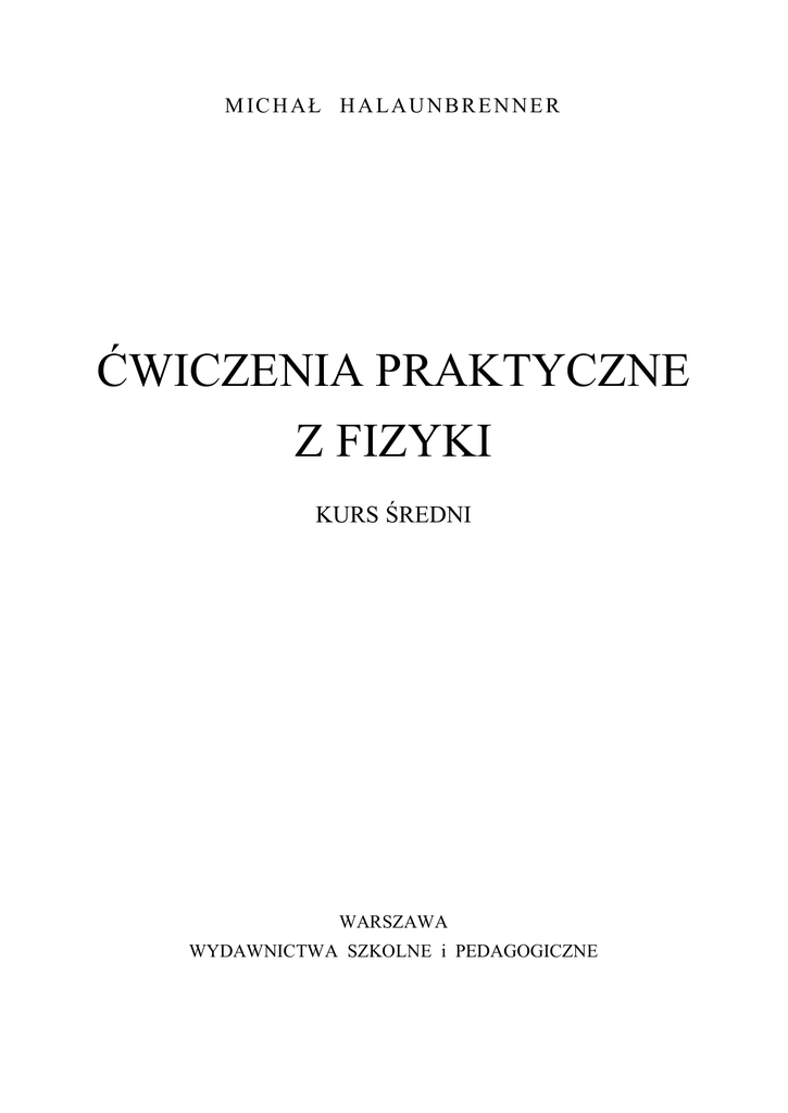 M IC H A Ł H A L A U N B R E N N E R ĆWICZENIA PRAKTYCZNE Z FIZYKI KURS ŚREDNI WARSZAWA WYDAWNICTWA SZKOLNE i PEDAGOGICZNE Okładka Stanisław Szczuka Redaktorzy Maria Boniecka, Halina Unatowska Redaktor techniczny Stefania Rzęcka Korektorzy Bogusława Biernacka, Witold Darmetko Przystosował do układu SI i uzupełnił ćwiczeniami Juliusz Domański (54, 59, 66, 124, 131, 132, 138, 140, 141, 152, 153, 154, 157, 158, 161, 178, 179, 180, 181, 192, 193, 194, 195, 196, 197, 198, 204, 205, 206, 207, 208, 209, 210, 211, 212, 213, 214, 215, 248, 249, 250, 252, 253, 254, 258, 259, 260, 261, 262, 263, 267, 269, 274, 275, 276, 277, 278, 279, 280, 281, 285) Copyright by Wydawnictwo Szkolne i Pedagogiczne Warszawa 1952 Książka zatwierdzona do użytku szkolnego Wydawnictwo Szkolne i Pedagogiczne, Warszawa 1982 Wydanie siódme zmienione i poprawione Nakład 5000+210 egz. Ark druk. 48,75; wyd. 56,72 Oddano do składania 7.V.1979 r. Podpisano do druku 11.XII.1981 r. Druk ukończono we wrześniu 1982 r. Papier druk 70x100 cm, 71 g, kl. V Zakłady Graficzne WSiP w Bydgoszczy SPIS TREŚCI Przedmowa ......................................................................................................................... 3 Podstawowe wiadomości o pomiarach fizycznych .............................................................. 5 Rozdział I. Pomiary podstawowe 11 1. Mierzenie długości z dokładnością do 1 mm za pomocą przydziału metrowego ............ 2. Ważniejsze błędy popełniane przy mierzeniu długości ................................................ 3. Mierzenie długości z dokładnością do 0,1 mm za pomocą suwmiarki ........................ 4. Mierzenie długości z dokładnością do 0,01 mm za pomocą mikrometru ..................... 5. Mierzenie długości z dokładnością do 0,001 mm za pomocą sferometru ..................... 6. Mierzenie długości linii krzywych .............................................................................. 7. Mierzenie kątów. Wyznaczanie kierunku pionowego i poziomego .............................. 8. Wyznaczanie pól i objętości brył o foremnych kształtach geometrycznych ................. 9. Mierzenie objętości za pomocą naczyń miarowych ..................................................... 10. Mierzenie masy za pomocą wagi ................................................................................ 11. Mierzenie czasu .......................................................................................................... 12. Pomiar częstotliwości szybkich periodycznych procesów mechanicznych za pomocą stroboskopu ................................................................................................................ Układy jednostek podstawowych ................................................................................ 11 14 16 19 21 23 25 27 30 33 39 42 44 Rozdział II. Mechanika cz. I ..................................................................................... 47 § 1. Statyka ciała sztywnego 13. Statystyczny pomiar siły. Cechowanie wagi sprężynowej. Metody graficzne przedstawiania wyników pomiarów ............................................................................ 49 14. Siła jako wielkość wektorowa. Warunki równowagi sił działających na ciało sztywne. Zasada równoległoboku sił .......................................................................................... 54 15. Wypadkowa sił działających na ciało sztywne wzdłuż prostych wzajemnie równoległych 57 16. Wyznaczanie środka ciężkości ciał stałych .................................................................. 60 17. Moment siły. Prawo momentów .................................................................................. 63 18. Dźwignia .................................................................................................................... 65 19. Wyznaczanie gęstości ciał stałych ............................................................................... 68 20. Wyznaczanie gęstości wody ........................................................................................ 69 21. Wyznaczanie gęstości ciał ciekłych i sypkich za pomocą piknometru ......................... 70 § 2. Statyka cieczy (hydrostatyka) 22. Wyznaczanie gęstości względnych cieczy za pomocą naczyń połączonych ................. 23. Wyznaczanie gęstości względnych cieczy mieszających się ze sobą ........................... 24. Prawo Archimedesa .................................................................................................... 25. Wyznaczanie gęstości względnych ciał stałych na podstawie prawa Archimedesa ...... 26. Wyznaczanie gęstości względnych ciał ciekłych na podstawie prawa Archimedesa .... 27. Wyznaczanie gęstości względnych ciał stałych za pomocą ważki Jolly’ego ................ 28. Pływanie ciał. Sporządzanie areometru ....................................................................... 72 74 75 77 79 79 81 § 3. Statyka gazów (aerostatyka) 29. Barometr, odczytywanie jego stanu i uwzględnianie poprawek ................................... 84 30. Sprawdzanie prawa Boyle’a-Mariotte’a za pomocą rurki Meldego .............................. 88 31. Sprawdzanie prawa Boyle’a-Mariotte’a za pomocą rurki kształtu litery J. ................... 90 32. Sprawdzanie prawa Boyle’a-Mariotte’a za pomocą naczyń połączonych .................... 91 § 4. Kinematyka. 33. Ruch prostoliniowy jednostajny. Składanie prędkości ................................................. 93 34. Wyznaczanie prędkości pocisku .................................................................................. 97 35. Ruch prostoliniowy jednostajnie przyspieszony. Pojęcie przyspieszenia ..................... 99 36. Droga w ruchu prostoliniowym jednostajnie przyspieszonym ................................... 102 37. Badanie ruchu prostoliniowego