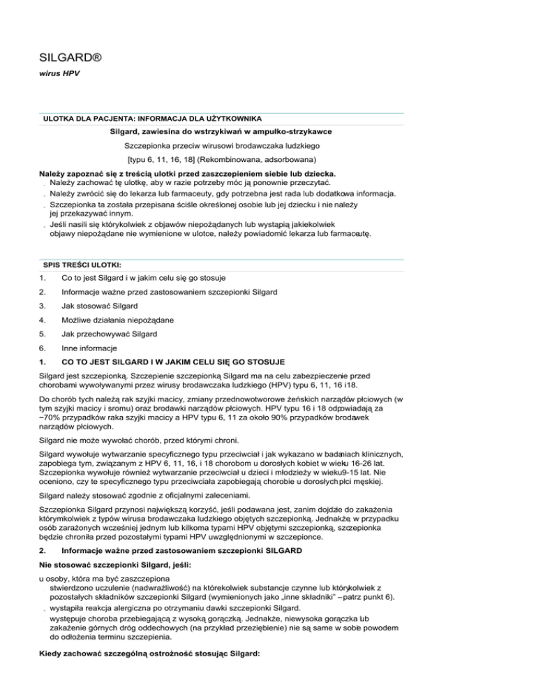 SILGARD® wirus HPV ULOTKA DLA PACJENTA: INFORMACJA DLA UŻYTKOWNIKA Silgard, zawiesina do wstrzykiwań w ampułko-strzykawce Szczepionka przeciw wirusowi brodawczaka ludzkiego [typu 6, 11, 16, 18] (Rekombinowana, adsorbowana) Należy zapoznać się z treścią ulotki przed zaszczepieniem siebie lub dziecka. Należy zachować tę ulotkę, aby w razie potrzeby móc ją ponownie przeczytać. Należy zwrócić się do lekarza lub farmaceuty, gdy potrzebna jest rada lub dodatkowa informacja. Szczepionka ta została przepisana ściśle określonej osobie lub jej dziecku i nie należy jej przekazywać innym. Jeśli nasili się którykolwiek z objawów niepożądanych lub wystąpią jakiekolwiek objawy niepożądane nie wymienione w ulotce, należy powiadomić lekarza lub farmaceutę. SPIS TREŚCI ULOTKI: 1. Co to jest Silgard i w jakim celu się go stosuje 2. Informacje ważne przed zastosowaniem szczepionki Silgard 3. Jak stosować Silgard 4. Możliwe działania niepożądane 5. Jak przechowywać Silgard 6. Inne informacje 1. CO TO JEST SILGARD I W JAKIM CELU SIĘ GO STOSUJE Silgard jest szczepionką. Szczepienie szczepionką Silgard ma na celu zabezpieczenie przed chorobami wywoływanymi przez wirusy brodawczaka ludzkiego (HPV) typu 6, 11, 16 i 18. Do chorób tych należą rak szyjki macicy, zmiany przednowotworowe żeńskich narządów płciowych (w tym szyjki macicy i sromu) oraz brodawki narządów płciowych. HPV typu 16 i 18 odpowiadają za ~70% przypadków raka szyjki macicy a HPV typu 6, 11 za około 90% przypadków brodawek narządów płciowych. Silgard nie może wywołać chorób, przed którymi chroni. Silgard wywołuje wytwarzanie specyficznego typu przeciwciał i jak wykazano w badaniach klinicznych, zapobiega tym, związanym z HPV 6, 11, 16, i 18 chorobom u dorosłych kobiet w wieku 16-26 lat. Szczepionka wywołuje również wytwarzanie przeciwciał u dzieci i młodzieży w wieku9-15 lat. Nie oceniono, czy te specyficznego typu przeciwciała zapobiegają chorobie u dorosłych płci męskiej. Silgard należy stosować zgodnie z oficjalnymi zaleceniami. Szczepionka Silgard przynosi największą korzyść, jeśli podawana jest, zanim dojdzie do zakażenia którymkolwiek z typów wirusa brodawczaka ludzkiego objętych szczepionką. Jednakże, w przypadku osób zarażonych wcześniej jednym lub kilkoma typami HPV objętymi szczepionką, szczepionka będzie chroniła przed pozostałymi typami HPV uwzględnionymi w szczepionce. 2. Informacje ważne przed zastosowaniem szczepionki SILGARD Nie stosować szczepionki Silgard, jeśli: u osoby, która ma być zaszczepiona stwierdzono uczulenie (nadwrażliwość) na którekolwiek substancje czynne lub którykolwiek z pozostałych składników szczepionki Silgard (wymienionych jako „inne składniki” – patrz punkt 6). wystąpiła reakcja alergiczna po otrzymaniu dawki szczepionki Silgard. występuje choroba przebiegającą z wysoką gorączką. Jednakże, niewysoka gorączka lub zakażenie górnych dróg oddechowych (na przykład przeziębienie) nie są same w sobie powodem do odłożenia terminu szczepienia. Kiedy zachować szczególną ostrożność stosując Silgard: Należy poinformować lekarza, jeśli osoba, która ma być zaszczepiona: ma zaburzenia krwawienia (chorobę, która sprawia, że krwawi bardziej, niż zazwyczaj), na przykład hemofilię ma osłabiony układ immunologiczny, na przykład z powodu defektu genetycznego lub zakażenia HIV Podobnie jak w przypadku jakiejkolwiek szczepionki, Silgard może nie w pełni chronić 100% osób, które zostały zaszczepione. Silgard nie będzie chronił przed wszystkimi typami wirusa brodawczaka ludzkiego. Z tego względu należy w dalszym ciągu stosować środki ostrożności przeciw chorobom przenoszonymi drogą płciową. Silgard nie będzie chronił przed innymi chorobami, które nie są wywoływane przez wirusa brodawczaka ludzkiego. Szczepienie nie zastępuje rutynowych badań szyjki macicy. Należy nadal stosować się do zaleceń lekarza, dotyczących badań wymazu szyjki macicy/testów Pap, a także środków zapobiegawczych i ochronnych. O jakich innych ważnych informacjach dotyczących szczepionki Silgard należy wiedzieć? Obecnie nie jest znany czas trwania ochrony. Trwają długoterminowe badania mające na celu określenie, czy konieczna jest dawka uzupełniająca. Stosowanie szczepionki Silgard z innymi lekami: Silgard można podawać jednocześnie ze szczepionką przeciwko wirusowemu zapaleniu wątroby typu B w różne miejsca wstrzyknięcia (inną część ciała np. inne ramię lub nogę), podczas tej samej wizyty. Silgard może nie działać optymalnie jeśli: stosowany jest z lekami zmniejszającymi odporność. W badaniach klinicznych, doustne lub inne środki antykoncepcyjne (np. pigułka) nie zmniejszały ochrony, jaką daje Silgard. Należy poinformować lekarza lub farmaceutę, jeśli osoba, która ma otrzymać szczepionkę, stosuje lub ostatnio stosowała jakiekolwiek inne leki, w tym leki wydawane bez recepty. Ciąża i karmienie piersią: Należy poradzić się lekarza, jeśli osoba, która ma być zaszczepiona, jest w ciąży, stara się zajść w ciążę lub też zajdzie w ciążę w trakcie cyklu szczepień. Silgard może być podawany kobietom, które karmią piersią lub zamierzają karmić piersią. Prowadzenie pojazdów i obsługa maszyn: Nie ma informacji, które sugerowałyby, że Silgard wpływa na zdolność prowadzenia pojazdów i obsługę maszyn. 3. JAK STOSOWAĆ SILGARD Silgard jest podawany przez lekarza w postaci wstrzyknięcia. Osoba szczepiona otrzyma trzy dawki szczepionki. Pierwsze wstrzyknięcie: w wybranym dniu Drugie wstrzyknięcie: najlepiej 2 miesiące po podaniu pierwszego wstrzyknięcia Trzecie wstrzyknięcie: najlepiej 6 miesięcy po podaniu pierwszego wstrzyknięcia Schemat dawkowania może być bardziej elastyczny, należy skonsultować się z lekarzem w celu uzyskania dalszych informacji. Osoba, która ma być zaszczepio