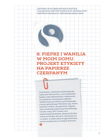 „EDUKACJA GLOBALNA NA PLASTYCE I ZAJĘCIACH ARTYSTYCZNYCH W GIMNAZJUM”, CENTRUM EDUKACJI OBYWATELSKIEJ 2015 8. PIEPRZ I WANILIA W MOIM DOMU. PROJEKT ETYKIETY NA PAPIERZE CZERPANYM Uczniowie i uczennice dowiedzą się, czym jest liternictwo, a ich zadaniem będzie zaprojektowanie i wykonanie na papierze czerpanym etykiety opakowania produktu pochodzącego z kraju globalnego Południa (np. kawa, herbata, kakao, przyprawy). Zajęcia wprowadzają pojęcie sprawiedliwego handlu (ang. fair trade) oraz wyjaśniają młodzieży, skąd pochodzą różne produkty, których używamy na co dzień, a także jaką drogę pokonują, zanim znajdą się w naszych domach. s 41 8. PIEPRZ I WANILIA W MOIM DOMU. PROJEKT ETYKIETY NA PAPIERZE CZERPANYM Zagadnienia: Konsumpcja i produkcja Żywność i rolnictwo Globalny rynek i handel międzynarodowy Czas trwania: 45 minut Pytanie kluczowe: Co to znaczy, że produkty pochodzą ze sprawiedliwego handlu? Cele zajęć: Dowiesz się, czym jest wzornictwo przemysłowe oraz grafika komputerowa. Zaprojektujesz i wykonasz na papierze czerpanym etykietę wybranego produktu pochodzącego z globalnego Południa. Wyjaśnisz pojęcie sprawiedliwego handlu. 5 Wzbogacisz swój warsztat pracy o nowe doświadczenia twórcze. Związek z podstawą programową: Plastyka: I: 1.2, II: 2.1 Zajęcia artystyczne: I: 1.2, II: 2.1, III: 3.2 Zagadnienia plastyczne: Wzornictwo przemysłowe Komponowanie na płaszczyźnie z elementami liternictwa Grafika komputerowa Metody: Rozmowa dydaktyczna poparta pokazem Dyskusja Ćwiczenie praktyczne w obrębie zagadnienia Formy pracy: Praca w parach Praca indywidualna Technika wykonania pracy plastycznej: Rysunkowy projekt graficzny na podłożu papieru czerpanego Opcjonalnie: grafika komputerowa (jeśli pozwalają na to warunki w szkole) Środki dydaktyczne i materiały: Załączniki Mapa świata (ścienna) Karteczki samoprzylepne Opcjonalnie: komputer z dostępem do Internetu, program graficzny lub tekstowy Pisaki, kredki, ołówki, pastele Papier czerpany (wykonany przez młodzież w domu według instrukcji) PRZEBIEG ZAJĘĆ: 0 Wprowadzenie Przed lekcją poproś uczniów i uczennice, aby w domu wykonali papier czerpany, korzystając z podanej instrukcji (załącznik nr 1). 1. ;5 5 5 8 Zapytaj uczniów i uczennice, co najczęściej piją na śniadanie w domu oni i ich rodzice. Wyjaśnij, że wiele produktów, które spożywamy na co dzień (np. kawa, herbata, kakao, różne przyprawy lub owoce), nie pochodzi z Polski, tylko z krajów globalnego Południa. Produkty te pokonują często duże odległości (co niesie za sobą tzw. „ślad węglowy” związany z emisją gazów cieplarnianych w wyniku transportu i magazynowania towarów), a proces ich wytwarzania bywa poddawany krytyce – rolnicy i rolniczki, a także producenci i producentki tych produktów nie zawsze otrzymują godziwe wynagrodzenie za swoją pracę i zdarza się, że pracują w szkodliwych warunkach (np. z powodu wykorzystywanych środków ochrony roślin i pestycydów), przypłacając to swoim zdrowiem. Zapytaj, czy młodzież spotkała się wcześniej z pojęciem sprawiedliwego handlu. Wysłuchaj odpowiedzi i uzupełnij informacje na ten temat. Wyjaśnij, że podczas lekcji zadaniem młodzieży będzie zaprojektowanie i wykonanie na papierze czerpanym (wykonanym wcześniej w domu) etykiety opakowania wybranego produktu pochodzącego z kraju globalnego Południa (np. kawa, herbata, kakao, przyprawy). Sprawiedliwy Handel to międzynarodowy ruch zapoczątkowany w latach 60. XX wieku, który działa na rzecz poprawy sytuacji mieszkańców i mieszkanek krajów globalnego Południa, głównie poprzez poprawę warunków pracy oraz ochronę praw pracowniczych. Firmy współpracujące z krajami globalnego Południa przestrzegające zasad Sprawiedliwego Handlu zobowiązują się m.in. do płacenie uczciwej ceny za usługi lub towary, a także do działania na rzecz zrównoważonego rozwoju; dbają o środowisko naturalne i bezpieczeństwo ludzi. Certyfikat Fairtrade jest przyznawany przez organizację Fairtrade International tym produktom spożywczym, które są wytwarzane w krajach globalnego Południa (m.in. kawa, herbata, kakao, owoce świeże i suszone, przyprawy, ryż) i spełniają ustalone standardy Sprawiedliwego Handlu. 42 8. PIEPRZ I WANILIA W MOIM DOMU. PROJEKT ETYKIETY NA PAPIERZE CZERPANYM Przed zajęciami możesz się także zapoznać z następującymi materiałami CEO dotyczącymi świadomej konsumpcji i sprawiedliwego handlu (a także zaproponować współpracę w tym zakresie nauczycielowi/nauczycielce innego przedmiotu ze swojej szkoły – być może zachęcisz kogoś do poprowadzenia zajęć na ich podstawie?): Edukacja globalna na zajęciach wiedzy o społeczeństwie w gimnazjum, CEO 2015: „Zanim skończysz śniadanie, już zależysz od większości świata”. Edukacja globalna na zajęciach języka polskiego w gimnazjum, CEO 2015: „Chcemy być fair! Sprawiedliwy handel i świadoma konsumpcja. Tworzenie użytkowych form wypowiedzi”. Edukacja globalna na zajęciach historii w gimnazjum, CEO 2015: „Co ma wspólnego ruch spółdzielczy z ekonomią społeczną i sprawiedliwym handlem?”. Edukacja globalna na zajęciach języka angielskiego w gimnazjum, CEO 2015: „Fairtrade – o co chodzi?”. 2. Poproś, aby uczniowie i uczennice zastanowili się, czy wiedzą, skąd pochodzą różne produkty, 6<55 które znajdują się w naszych domach i czy czytają w sklepach ich etykiety. Możesz rozdać młodzieży materiał pomocniczy (załącznik nr 2), w którym podane są przykładowe produkty (m.in. różne przyprawy) oraz informacje o ich kraju pochodzenia. Jeśli przygotowałaś/przygotowałeś wcześniej ścienną mapę świata, możecie wspólnie pozaznaczać na niej karteczkami samoprzylepnymi kraje, z których pochodzą poszczególne produkty. Warto również zwrócić uwagę, z których krajów pochodzą produkty sprawiedliwego handlu (patrz link poniżej)