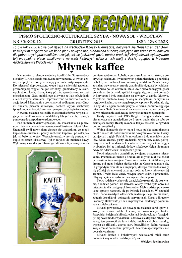 PISMO SPOŁECZNO-KULTURALNE, SZYBA - NOWA SÓL - WROCŁAW NR 35/ROK IX ISSN 1898-262X GRUDZIEŃ 2015 To był rok 1933. Nowa Sól leżąca na wschodzie Rzeszy Niemieckiej nazywała się Neusalz an der Oder. W miejskim magistracie kreślono plany nowych ulic, planowano budowę kolejnych mieszkań komunalnych dla potrzebnych pracowników rozwijającej się żeliwiarni, gdzie oprócz produkcji zbrojeniowej wykonywano też przepiękne piece emaliowane na wzór kaflowych (kilka z nich można dzisiaj oglądać w Muzeum Architektury we Wrocławiu) Młynek kaffee Na szeroko rozplanowanej ulicy Adolf Hitler Strasse (obecnie ulicy T. Kościuszki) budowano nowoczesne, w owym czasie, dwupiętrowe domy w panującym modernistycznym stylu. Do mieszkań doprowadzono wodę i gaz z miejskiej gazowni, przerabiającej węgiel na gaz świetlny, gromadzony w stalowych zbiornikach, i koks, który później sprzedawano na opał mieszkańcom. Gazu miejskiego używano też do oświetlania ulic żeliwnymi latarniami. Doprowadzono do mieszkań kanalizację i prąd. Mieszkania z drewnianymi podłogami, podwójnymi oknami, piecami kaflowymi, dachem krytym dachówką i przydomowymi ogródkami warzywnymi były ciepłe i wygodne. Nowe mieszkania zasiedliły młode małżeństwa, wyposażając je w meble robione w niedalekiej fabryce mebli, i sprzęty potrzebne do gospodarstwa domowego. Pod numerem dziewiętnastym, do mieszkania na pierwszym piętrze wprowadziło się młode małżeństwo - Helga i Johan. Urządzali swój nowy dom ciesząc się wszystkim, co mogli kupić do mieszkania. Sprzęty kuchenne kupowali po kolei, tak jak ich było na to stać. Wreszcie urządziwszy się postanowili kupić też rzecz luksusową. Był to młynek do mielenia kawy. Wykonany z solidnego żeliwnego odlewu, z fajansowym zaso- bnikiem zdobionym kobaltowym rysunkiem wiatraków, z pokrywką i szklanym, kwadratowym pojemniczkiem, z podziałką na boku, na zmieloną kawę, wsuwanym od dołu. Zamocowany został na wewnętrznej stronie drzwi spiżarki, gdzie był widoczny dopiero po ich otwarciu. Mało kto z przychodzących gości go widział, bo drzwi do spiżarki wyglądały, jak drzwi do szafy w korytarzu i były zamykane na tkwiący w zamku kluczyk. Młynkiem mielono kawę paloną w specjalnym naczyniu na węglowej kuchni, co wymagało sporej wprawy. Bo zdarzało się, że zbyt duży ogień potrafił przypalić ziarna, pomimo ciągłego mieszania. Świeża zmielona kawa roztaczała swoje aromaty po całym mieszkaniu zachęcając do wypicia smacznego napoju. Kiedy przyszedł rok 1945 Helga z dwojgiem dzieci pospiesznie została przesiedlona do Bremen zabierając ze sobą co cenniejsze rzeczy. Resztę zakopała, tak jak sąsiedzi, w ogródku pod krzywą śliwką. Wojna skończyła się w maju i nowa polska administracja prędko zasiedliła dobre mieszkania nowymi lokatorami, którzy przyjechali z głębi Polski. W mieszkaniu było niewiele sprzętów. Kilka krzeseł, pusty kredensik, wybite trzy okna, pokręcany dzwonek w drzwiach z otworem na listy i tona węgla w piwnicy. Był też młynek do kawy, którego Helga nie mogła odkręcić z drzwiczek i zakopać w ogórku. Nowi mieszkańcy urządzili po swojemu otrzymane mieszkanie. Pozmieniali meble i firanki, ale młynka nikt nie chciał przenosić w inne miejsce. Trwał na drzwiach i mielił kawę na drobny pył przez kolejne pięćdziesiąt lat. Czasem zdarzało się, że gospodyni zmieliła w nim pieprz, którego resztki dostawały się później do mielonej przez gospodarza kawy, niwecząc jej aromat. Trzeba było wtedy wsypać sporo cukru i przemielić, żeby wyczyścić urządzenie i usunąć resztki pieprzu. Nowa rodzina wychowała dzieci, które rozeszły się po świecie, a rodzice pomarli ze starości. Wtedy trzeba było opróżnić mieszkanie dla następnych lokatorów. Meble gdzieś powywożono, sprzęty rozpełzły się po świecie i sąsiadach. W ostatniej chwili córka zmarłych właścicieli, widząc puste już mieszkanie, zajrzała do spiżarki i zobaczyła stary młynek. Został odkręcony i zabrany. Brakowało już w nim pokrywki i szklanego pojemnika na zmieloną kawę. Młynek powędrował do nowego mieszkania córki i powieszony na ścianie zdobił kuchnię w nowoczesnym bloku. Przewisiał kolejnych kilkadziesiąt lat i dopiero, kiedy "przejadły" się nowomodne wynalazki - udarowe elektryczne młynki do kawy, ten powrócił do łask i dalej mieli na drobną mączkę, wprost do filiżanki, ziarna kawy brazylijskiej, która roztacza swój aromat po kuchni i pokojach. Nie wymagał napraw - nie popsuł się ani razu. Młynek kaffee z kobaltowymi wiatrakami mieli teraz poranne kawy i czeka na dalszy swój los. Wojciech Jachimowicz NR 35/ROK IX GRUDZIEŃ 2015 Tak jak wielu Polaków żyjących poza granicą, często jeżdżę do Polski, aby spędzić czas z moją rodziną czasami aż cztery razy w roku. Nie do pomyślenia, żebym nie umiał rozmawiać z moimi dziadkami. Co brzmi jak niemożliwość, jest jednak smutnym faktem u wielu ludzi polskiego pochodzenia urodzonych za granicą. Z własną rodziną nie potrafią się porozumieć i dlatego często rezygnują z wyjazdu do Polski. Podarowany Język – lekcje języka polskiego w Düsseldorfie To, że ja nauczyłem się języka polskiego, należy do zasług moich rodziców, ponieważ to oni od początku, od mojego urodzenia, rozmawiali ze mną po polsku i nie słuchali tego, co inni o tym sądzili. Była wtedy w Niemczech duża dyskusja o tym, czy dorastanie w dwóch językach zaszkodzi dziecku w jego rozwoju i czy jest to przyczyną problemów w szkole. Niestety, do dzisiaj wiele ludzi nie wie, że nie jest to prawdą. Liczne badania naukowe przeprowadzone w ciągu ostatnich lat wykazują, że wielojęzyczne dzieci sprawniej myślą, są bardziej inteligentne, ponieważ przetwarzają informacje w dwóch językach. A poza tym aż dwie trzecie ludności świata jest dwujęzyczna. To, że umiem pisać i czytać po polsku, jest