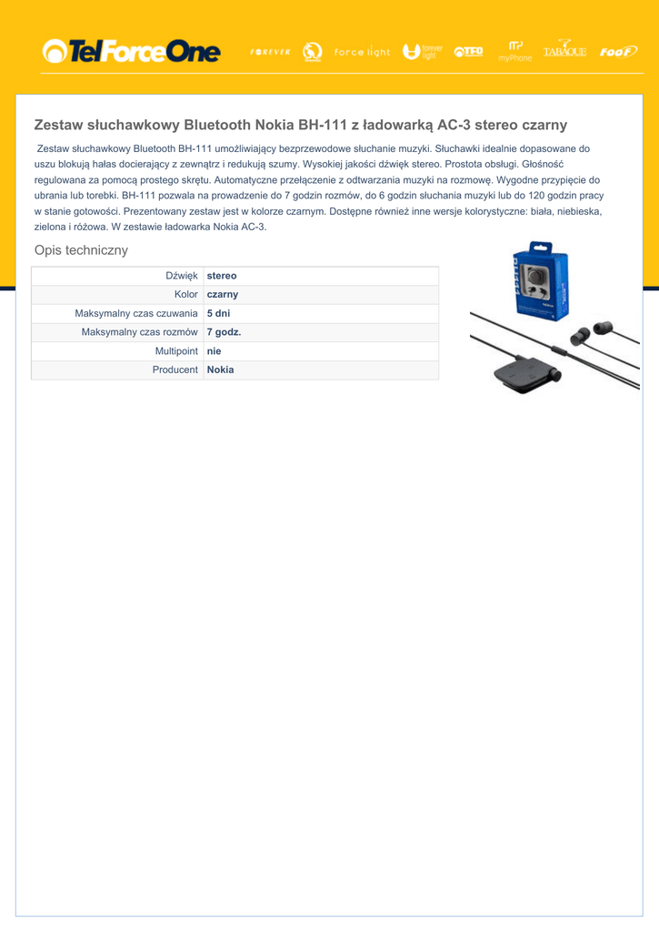 Zestaw słuchawkowy Bluetooth Nokia BH-111 z ładowarką AC-3 stereo czarny Zestaw słuchawkowy Bluetooth BH-111 umożliwiający bezprzewodowe słuchanie muzyki. Słuchawki idealnie dopasowane do uszu blokują hałas docierający z zewnątrz i redukują szumy. Wysokiej jakości dźwięk stereo. Prostota obsługi. Głośność regulowana za pomocą prostego skrętu. Automatyczne przełączenie z odtwarzania muzyki na rozmowę. Wygodne przypięcie do ubrania lub torebki. BH-111 pozwala na prowadzenie do 7 godzin rozmów, do 6 godzin słuchania muzyki lub do 120 godzin pracy w stanie gotowości. Prezentowany zestaw jest w kolorze czarnym. Dostępne również inne wersje kolorystyczne: biała, niebieska, zielona i różowa. W zestawie ładowarka Nokia AC-3. Opis techniczny Dźwięk stereo Kolor czarny Maksymalny czas czuwania 5 dni Maksymalny czas rozmów 7 godz. Multipoint nie Producent Nokia