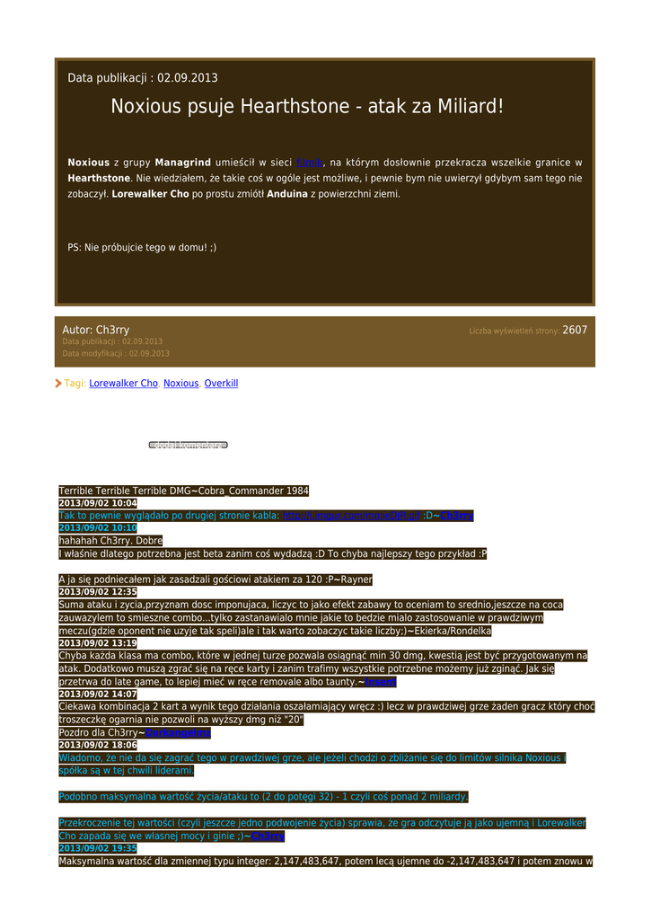 Data publikacji : 02.09.2013 Noxious psuje Hearthstone - atak za Miliard! Noxious z grupy Managrind umieścił w sieci filmik, na którym dosłownie przekracza wszelkie granice w Hearthstone. Nie wiedziałem, że takie coś w ogóle jest możliwe, i pewnie bym nie uwierzył gdybym sam tego nie zobaczył. Lorewalker Cho po prostu zmiótł Anduina z powierzchni ziemi. PS: Nie próbujcie tego w domu! ;) Autor: Ch3rry Liczba wyświetleń strony: 2607 Data publikacji : 02.09.2013 Data modyfikacji : 02.09.2013 Tagi: Lorewalker Cho, Noxious, Overkill Komentarz (8) dodaj komentarz Terrible Terrible Terrible DMG~Cobra_Commander 1984 2013/09/02 10:04 Tak to pewnie wyglądało po drugiej stronie kabla: http://i.imgur.com/mmieDJR.gif :D~Ch3rry 2013/09/02 10:10 hahahah Ch3rry. Dobre I właśnie dlatego potrzebna jest beta zanim coś wydadzą :D To chyba najlepszy tego przykład :P A ja się podniecałem jak zasadzali gościowi atakiem za 120 :P~Rayner 2013/09/02 12:35 Suma ataku i zycia,przyznam dosc imponujaca, liczyc to jako efekt zabawy to oceniam to srednio,jeszcze na coca zauwazylem to smieszne combo...tylko zastanawialo mnie jakie to bedzie mialo zastosowanie w prawdziwym meczu(gdzie oponent nie uzyje tak speli)ale i tak warto zobaczyc takie liczby;)~Ekierka/Rondelka 2013/09/02 13:19 Chyba każda klasa ma combo, które w jednej turze pozwala osiągnąć min 30 dmg, kwestią jest być przygotowanym na atak. Dodatkowo muszą zgrać się na ręce karty i zanim trafimy wszystkie potrzebne możemy już zginąć. Jak się przetrwa do late game, to lepiej mieć w ręce removale albo taunty.~Insent 2013/09/02 14:07 Ciekawa kombinacja 2 kart a wynik tego działania oszałamiający wręcz :) lecz w prawdziwej grze żaden gracz który choć troszeczkę ogarnia nie pozwoli na wyższy dmg niż "20" Pozdro dla Ch3rry~Darkangelmz 2013/09/02 18:06 Wiadomo, że nie da się zagrać tego w prawdziwej grze, ale jeżeli chodzi o zbliżanie się do limitów silnika Noxious i spółka są w tej chwili liderami. Podobno maksymalna wartość życia/ataku to (2 do potęgi 32) - 1 czyli coś ponad 2 miliardy. Przekroczenie tej wartości (czyli jeszcze jedno podwojenie życia) sprawia, że gra odczytuje ją jako ujemną i Lorewalker Cho zapada się we własnej mocy i ginie ;)~Ch3rry 2013/09/02 19:35 Maksymalna wartość dla zmiennej typu integer: 2,147,483,647, potem lecą ujemne do -2,147,483,647 i potem znowu w górę :) Gra bada HP jednostki co akcję, więc przy pierwszym minusie papa :P~SzRaPnEL 2013/09/03 08:03 dodaj komentarz Pozostałe nowości Nowy bohater w Hearthstone - Lady Liadrin Blizzard postanowił zaskoczyć wszystkich udostępniając nowego bohatera do Hearthstone, którego zdobyć można grając w World of Warcraft. Nie macie się jednak co martwić, wystarczy zdobyć jedynie 20 poziom w popularnym MMO, aby Lady Liadrin zajęła miejsce Uthera jako paladyn w grze.Data publikacji: 15.03.20160 Zapowiedź nowości w Hearthstone Jeśli to co dzieje się w Hearthstone zaczynało was powoli nudzić, to mamy dobre informacje. Już wkrótce do gry zostanie wprowadzonych szeerg zmian, które odświeżą rozgrywkę w karczmie.Data publikacji: 02.02.20160 Nadchodzi Zimowa Uczta W zapowiedzi najnowszej aktualizacji pojawiła się wzmianka na temat Zimowej Uczty, która wkrótce ma rozpocząć się w Hearthstone. Dziś Blizzard ujawnia pierwsze niespodzianki związane z tym wydarzeniem.Data publikacji: 09.12.20150 Liga Odkrywców dostępna w aktualizacji 4.0 Najnowsza aktualizacja do Hearthstone wprowadza przygodę Liga Odkrywców, kilka nowych rewersów do kart oraz naprawia niewielką ilość błędów w grze. Więcej informacji znajdziecie w rozwinięciu newsa.Data publikacji: 12.11.20150 BlizzCon 2015 - karty z Ligi Odkrywców Na łamach serwisu HearthPwn pojawiły się wszystkie karty, które będą dostępne w przygodzie Liga Odkrywców - wygląda na to, że będą mogły sporo namieszać w karczmie Hearthstone.Data publikacji: 07.11.20150 Wszystkie nowości