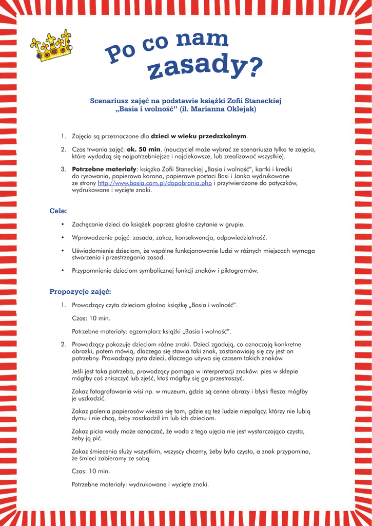 am n o c Po d a y? s a z Scenariusz zajęć na podstawie książki Zofii Staneckiej „Basia i wolność” (il. Marianna Oklejak) 1. Zajęcia są przeznaczone dla dzieci w wieku przedszkolnym. 2. Czas trwania zajęć: ok. 50 min. (nauczyciel może wybrać ze scenariusza tylko te zajęcia, które wydadzą się najpotrzebniejsze i najciekawsze, lub zrealizować wszystkie). 3. Potrzebne materiały: książka Zofii Staneckiej „Basia i wolność”, kartki i kredki do rysowania, papierowa korona, papierowe postaci Basi i Janka wydrukowane ze strony http://www.basia.com.pl/dopobrania.php i przytwierdzone do patyczków, wydrukowane i wycięte znaki. Cele: • Zachęcanie dzieci do książek poprzez głośne czytanie w grupie. • Wprowadzenie pojęć: zasada, zakaz, konsekwencja, odpowiedzialność. • Uświadomienie dzieciom, że wspólne funkcjonowanie ludzi w różnych miejscach wymaga stworzenia i przestrzegania zasad. • Przypomnienie dzieciom symbolicznej funkcji znaków i piktogramów. Propozycje zajęć: 1. Prowadzący czyta dzieciom głośno książkę „Basia i wolność”. Czas: 10 min. Potrzebne materiały: egzemplarz książki „Basia i wolność”. 2. Prowadzący pokazuje dzieciom różne znaki. Dzieci zgadują, co oznaczają konkretne obrazki, potem mówią, dlaczego się stawia taki znak, zastanawiają się czy jest on potrzebny. Prowadzący pyta dzieci, dlaczego używa się czasem takich znaków. Jeśli jest taka potrzeba, prowadzący pomaga w interpretacji znaków: pies w sklepie mógłby coś zniszczyć lub zjeść, ktoś mógłby się go przestraszyć. Zakaz fotografowania wisi np. w muzeum, gdzie są cenne obrazy i błysk flesza mógłby je uszkodzić. Zakaz palenia papierosów wiesza się tam, gdzie są też ludzie niepalący, którzy nie lubią dymu i nie chcą, żeby zaszkodził im lub ich dzieciom. Zakaz picia wody może oznaczać, że woda z tego ujęcia nie jest wystarczająco czysta, żeby ją pić. Zakaz śmiecenia służy wszystkim, wszyscy chcemy, żeby było czysto, a znak przypomina, że śmieci zabieramy ze sobą. Czas: 10 min. Potrzebne materiały: wydrukowane i wycięte znaki. 3. Jakich zasad musimy przestrzegać? Co by się stało, gdybyśmy ich nie przestrzegali? Dzieci siedzą w kręgu i rozmawiają, jakie zasady obowiązują w przedszkolu: np. sprzątanie po sobie zabawek, zasada, że nie wolno nikogo bić, zasada, że mówimy po kolei, a nie wszyscy naraz podczas zajęć itp. Dzieci w grupach 3 – 4 osobowych zastanawiają się, jak pokazać jedną z przedszkolnych zasad obrazkiem. Wspólnie obmyślają i rysują obrazek. Czas: 10 min. Potrzebne materiały: kartki, kredki. 4. Dzieci z powrotem siadają w kręgu. Prowadzący mówi, że król ustala zasady, a poddani muszą się stosować. Jest jednak tak, jak mówił tata Basi: król jest odpowiedzialny za swoich poddanych i nie może działać na ich szkodę. Pani wkłada na głowę koronę z papieru pierwszemu dziecku i prosi, żeby powiedziało, jaką zasadę by ustaliło, gdyby zostało królem w Polsce. Korona krąży, każde dziecko wypowiada jedno „zarządzenie”. Czas: 5 min. Potrzebne materiały: papierowa korona. 5. Prowadzący czyta jeszcze raz fragment (s. 16), w którym tata Basi mówi, że gdyby nie poszedł do pracy, to by go wyrzucili, gdyby kogoś oszukał, to ten ktoś straciłby zaufanie. To się nazywa konsekwencja. Jeśli dorosły złamie zasady, to poniesie konsekwencje. Czy dorosłym wszystko wolno? Dzieci rozmawiają, jakie konsekwencje ponoszą dorośli za łamanie wspólnych dla wszystkich zasad, czyli prawa. Czas: 3 – 4 min. 6. Za pomocą papierowych postaci (http://www.basia.com.pl/dopobrania.php) dzieci przedstawiają scenkę, w której Janek tłumaczy Basi, jak powinna się zachować. Prowadzący jest Basią, która psoci, a dzieci po kolei są Jankiem, który próbuje wytłumaczyć młodszej siostrze, jak powinna się zachować. Przykładowe scenki: Basia chce przejść przez ulicę na czerwonym świetle, Basia wypluwa gumę do żucia na chodnik, Basia psuje zabawki w przedszkolu, Basia krzyczy w lesie, Basia chce wejść z lodami do sklepu itp. Czas: 5 – 10 min. Potrzebne materiały: wycięte i przytwierdzone do patyczków papierowe postaci ze strony http://www.basia.com.pl/dopobrania.php 7. Podsumowanie: zasady są potrzebne i dzieciom i dorosłym. Prowadzący rozmawia z grupą o tym, jak trudno jest mądrze ustalać zasady, tak żeby były one dobre dla wszystkich. Mądry władca nie może wszystkiego zakazać, ale też nie da się wszystkim na wszystko pozwolić. Czas: 2 – 3 min.