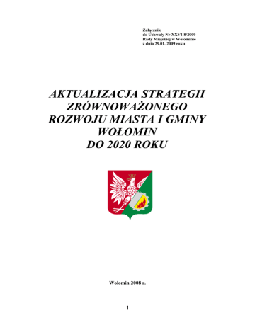 Załącznik do Uchwały Nr XXVI-8/2009 Rady Miejskiej w Wołominie z dnia 29.01. 2009 roku AKTUALIZACJA STRATEGII ZRÓWNOWAŻONEGO ROZWOJU MIASTA I GMINY WOŁOMIN DO 2020 ROKU Wołomin 2008 r. 1 AKTUALIZACJA STRATEGII ZRÓWNOWAŻONEGO ROZWOJU MIASTA I GMINY WOŁOMIN DO 2020 ROKU Spis treści 1. Wprowadzenie ……………………………...……………………………………………………….…….....……… 3. 2. Zasady aktualizacji Strategii ……………………………………………………………………………… 6. 3. Diagnoza stanu rozwoju społeczno-gospodarczego Miasta i Gminy Wołomin oraz badania ankietowe wśród mieszkańców …………………..………. 10. 3.1. Główne czynniki społeczno-gospodarczego rozwoju Miasta i Gminy Wołomin ……………………………………………………………….….………………. 10. 4. 3.2. Ankieta dla Konwentu …………………………………………………………..…….………… 13. 3.3. Ogólna ankieta dla mieszkańców …………………………………………………..…… 14. 3.4. Ankieta dla młodzieży …………………………………………………………………….…….. 19. Misja i cele rozwoju ………………………………………………………..…………………..…….……….. 23. 4.1. Misja i cele strategiczne …………………………...…………………………………………… 23. 4.2. Powiązania z dokumentami nakreślającymi kierunki rozwoju kraju, województwa mazowieckiego i powiatu wołomińskiego …………..... 25. 4.2.1. Zgodność na poziomie krajowym …………………………………………...…… 25. 4.2.2. Zgodność na poziomie regionalnym i lokalnym (województwa i powiatu) ……………………………………………...…………………………………...……….. 36. 4.3. 5. Cele operacyjne i zadania realizacyjne ……………………………………………… 46 Wdrażanie i monitoring Strategii …………………………………………………………………… 74. 2 AKTUALIZACJA STRATEGII ZRÓWNOWAŻONEGO ROZWOJU MIASTA I GMINY WOŁOMIN DO 2020 ROKU Wprowadzenie Szanowni Państwo, Mieszkańcy Miasta i Gminy Wołomin! „STRATEGIA ZRÓWNOWAŻONEGO ROZWOJU MIASTA I GMINY WOŁOMIN DO 2015 ROKU” została przyjęta uchwałą Rady Miasta w 2004 roku. Dokument ten był rezultatem wspólnej pracy grupy konsultantów oraz mieszkańców miasta, członków Rady, instytucji i liderów, którzy uczestniczyli w kolejnych etapach prac nad Strategią. „STRATEGIA ZRÓWNOWAŻONEGO ROZWOJU MIASTA I GMINY WOŁOMIN DO 2015 ROKU” jest niezmiernie ważnym dokumentem dla wołomińskiej społeczności, bowiem określa pożądane kierunki zmian w sferze społecznej, gospodarczej i ekologicznej Gminy w najbliższych kilkunastu latach. Ogólnie biorąc, odpowiada ona na podstawowe pytanie: co powinniśmy zrobić, aby jak najlepiej zaspokajać zbiorowe potrzeby mieszkańców Miasta i Gminy Wołomin? Ustalenia zawarte w Strategii stanowią merytoryczną podstawę do prowadzenia długookresowej i systematycznej polityki rozwoju Miasta i Gminy Wołomin, a także ubiegania się o zewnętrzne środki finansowe, w tym z Unii Europejskiej na współfinansowanie przyjętych celów rozwoju i zadań realizacyjnych. Po przeszło 4 latach zaistniały nowe uwarunkowania i przesłanki dla zaktualizowania „STRATEGII ZRÓWNOWAŻONEGO ROZWOJU MIASTA I GMINY WOŁOMIN DO 2015 ROKU”. Największą zmianę w życiu społeczności lokalnej oraz w pracy urzędów na szczeblu gminnym wprowadziło przystąpienie Polski do Unii Europejskiej. Niezmiernie istotne były także zmiany jakie zaszły w sferze społeczno-gospodarczej Miasta i Gminy Wołomin. Aby zobowiązania i zapisy przyjęte w Strategii mogły być realizowane Władze Wołomina obecnej kadencji podjęły decyzję o konieczności aktualizacji zapisów w Strategii z 2004 roku i o opracowaniu nowego, dodatkowego dokumentu pt: „AKTUALIZACJA 3 AKTUALIZACJA STRATEGII ZRÓWNOWAŻONEGO ROZWOJU MIASTA I GMINY WOŁOMIN DO 2020 ROKU STRATEGII ZRÓWNOWAŻONEGO ROZWOJU MIASTA I GMINY WOŁOMIN DO 2020 ROKU”. Podjęcie prac nad aktualizacją Strategii wynikało z wielu przesłanek, do których należały m.in.: 1. Mocniejsze zaakcentowanie silnych stron Miasta i Gminy Wołomin w celu skuteczniejszego przełożenia potencjału Miasta i Gminy na zamierzenia inwestycyjne; 2. Powiązanie Strategii z nowymi dokumentami strategicznymi dotyczącymi rozwoju województwa i kraju, 3. Powiązanie Strategii z programami operacyjnymi na lata 2007-2013, 4. Analiza absorpcji środków pochodzących z funduszy strukturalnych na działania inwestycyjne w okresie programowania 2007-2013, 5. Dokonanie analizy i oceny wdrażania i realizacji celów przyjętych w Strategii i dostosowanie ich do potrzeb i oczekiwań zgłaszanych przez mieszkańców i potencjalnych inwestorów, Dokonując prac aktualizacyjnych, których efektem jest przedkładany dokument „AKTUALIZACJA STRATEGII ZRÓWNOWAŻONEGO ROZWOJU MIASTA I GMINY WOŁOMIN DO 2020 ROKU”, uwzględniono zasadnicze elementy wpływające na realizacje polityki rozwojowej, jak ocena i weryfikacja szans i słabości rozwojowych Gminy oraz czynników rozwoju ekonomiczno-społecznego. Obecnie, opracowanie pod nazwą „AKTUALIZACJA STRATEGII ZRÓWNOWAŻONEGO ROZWOJU MIASTA I GMINY WOŁOMIN DO 2020 ROKU” stanowi podstawowy dokument programowy i rozwojowy Miasta i Gminy Wołomin. Wraz z dokumentem „STRATEGIA ZRÓWNOWAŻONEGO ROZWOJU MIASTA I GMINY WOŁOMIN DO 2015 ROKU” stanowi pakiet dokumentacji programowej niezbędnej do realizacji polityki rozwoju na poziomie lokalnym oraz wskazania głównych kierunków rozwojowych . Rada Miejska i Burmistrz Miasta dziękują wszystkim Osobom, Organizacjom i Instytucjom, które - poprzez zgłaszanie swoich opinii, uwag i propozycji - w istotny sposób