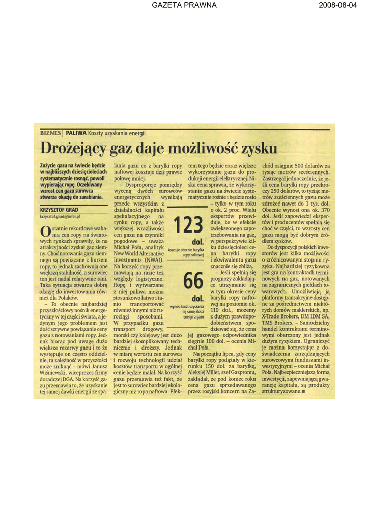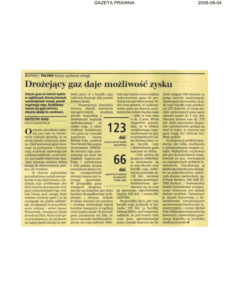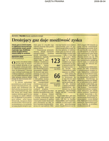 GAZETA PRAWNA 2008-08-04 B I Z N E S | PALIWA Koszty uzyskania energii Drożejący gaz daje możliwość zysku Zużycie gazu na świecie będzie w najbliższych dziesięcioleciach systematycznie rosnąć, powoli wypierając ropę. Oczekiwany wzrost cen gazu surowca stwarza okazję do zarabiania. KRZYSZTOF GRAP [email protected] statnie rekordowe waha nia cen ropy na świato wych rynkach sprawiły, że na atrakcyjności zyskał gaz ziem ny. Choć notowania gazu ziem nego są powiązane z kursem ropy, to jednak zachowują one większą stabilność, a surowiec ten jest nadal relatywnie tani. Taka sytuacja stwarza dobrą okazję do inwestowania rów nież dla Polaków. - To obecnie najbardziej przyszłościowy nośnik energe tyczny w tej części świata, a je dynym jego problemem jest dość sztywne powiązanie ceny gazu z notowaniami ropy. Jed nak biorąc pod uwagę dużo większe rezerwy gazu i to że występuje on często oddziel nie, ta zależność w przyszłości może zniknąć - mówi Janusz Wiśniewski, wiceprezes firmy doradczej DGA. Na korzyść ga zu przemawia to, że uzyskanie tej samej dawki energii ze spa O lania gazu co z baryłki ropy tern tego będzie coraz większe chód osiągnie 500 dolarów za naftowej kosztuje dziś prawie wykorzystanie gazu do pro tysiąc metrów sześciennych. połowę mniej. dukcji energii elektrycznej. Ni Zastrzegał jednocześnie, że je - Dysproporcje pomiędzy ska cena sprawia, że wykorzy śli cena baryłki ropy przekro wyceną dwóch surowców stanie gazu na świecie syste czy 250 dolarów, to tysiąc me energetycznych wynikają matycznie rośnie i będzie rosło trów sześciennych gazu może - tylko w tym roku zdrożeć nawet do 1 tys. dol. przede wszystkim z o ok. 2 proc. Wielu Obecnie wynosi ona ok. 370 działalności kapitału ekspertów przewi dol. Jeśli zapowiedzi eksper spekulacyjnego na duje, że w efekcie tów i producentów spełnią się rynku ropy, a także zwiększonego zapo choć w części, to wzrosty cen większej wrażliwości trzebowania na gaz, gazu mogą być dobrym źró cen gazu na czynniki pogodowe - uważa dol. w perspektywie kil dłem zysków. Do dyspozycji polskich inwe Michał Poła, analityk kosztuje obecnie baryłka ku dziesięcioleci ce na baryłki ropy storów jest kilka możliwości New World Alternative ropy naftowej i ekwiwalentu gazu o zróżnicowanym stopniu ry Investments (NWAI). znacznie się zbliżą. zyka. Najbardziej ryzykowna Na korzyść ropy prze - Jeśli spełnią się jest gra na kontraktach termi mawiają na razie też prognozy zakładają nowych na gaz, notowanych względy logistyczne. ce utrzymanie się na zagranicznych giełdach to Ropę i wytwarzane w tym okresie ceny warowych. Umożliwiają ją z niej paliwa można stosunkowo łatwo i ta dol. baryłki ropy nafto platformy transakcyjne dostęp nio transportować wynosi koszt uzyskania wej na poziomie ok. ne za pośrednictwem niektó 110 dol., możemy rych domów maklerskich, np. również innymi niż ru tej samej ilości z dużym prawdopo X-Trade Brokers, DM IDM SA, rociągi sposobami. energii z gazu dobieństwem spo- TMS Brokers. - Samodzielny W przypadku gazu dziewać się, że cena handel kontraktami termino transport drogowy, morski czy kolejowy jest dużo jej gazowego odpowiednika wymi obarczony jest jednak bardziej skomplikowany tech sięgnie 100 dol. - ocenia Mi dużym ryzykiem. Ograniczyć je można korzystając z do nicznie i droższy. Jednak chał Poła. w miarę wzrostu cen surowca Na początku lipca, gdy ceny świadczenia zarządzających i rozwoju technologii udział baryłki ropy podążały w kie surowcowymi funduszami in kosztów transportu w ogólnej runku 150 dol. za baryłkę, westycyjnymi - ocenia Michał cenie będzie malał. Na korzyść Aleksiej Miller, szef Gazpromu, Poła. Najbezpieczniejszą formą gazu przemawia też fakt, że zakładał, że pod koniec roku inwestycji, zapewniającą gwa jest to surowiec bardziej ekolo cena gazu sprzedawanego rancję kapitału, są produkty giczny niż ropa naftowa. Efek- przez rosyjski koncern na Za- strukturyzowane. • 123 66