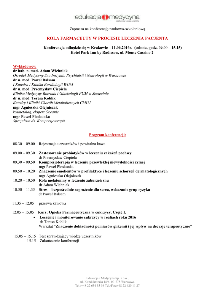 Zaprasza na konferencję naukowo-szkoleniową ROLA FARMACEUTY W PROCESIE LECZENIA PACJENTA Konferencja odbędzie się w Krakowie – 11.06.2016r. (sobota, godz. 09.00 – 15.15) Hotel Park Inn by Radisson, ul. Monte Cassino 2 Wykładowcy: dr hab. n. med. Adam Wichniak Ośrodek Medycyny Snu Instytutu Psychiatrii i Neurologii w Warszawie dr n. med. Paweł Balsam I Katedra i Klinika Kardiologii WUM dr n. med. Przemysław Ciepiela Klinika Medycyny Rozrodu i Ginekologii PUM w Szczecinie dr n. med. Teresa Koblik Katedry i Kliniki Chorób Metabolicznych CMUJ mgr Agnieszka Olejniczak kosmetolog, ekspert Oceanic mgr Paweł Płoskonka Specjalista ds. Kompresjoterapii Program konferencji: 08.30 – 09.00 Rejestracja uczestników i powitalna kawa 09.00 – 09.30 Zastosowanie probiotyków w leczeniu zakażeń pochwy dr Przemysław Ciepiela 09.30 – 09.50 Kompresjoterapia w leczeniu przewlekłej niewydolności żylnej mgr Paweł Płoskonka 09.50 – 10.20 Znaczenie emolientów w profilaktyce i leczeniu schorzeń dermatologicznych mgr Agnieszka Olejniczak 10.20 – 10.50 Rola melatoniny w leczeniu zaburzeń snu dr Adam Wichniak 10.50 – 11.35 Stres – bezpośrednie zagrożenie dla serca, wskazanie grup ryzyka dr Paweł Balsam 11.35 – 12.05 przerwa kawowa 12.05 – 15.05 Kurs: Opieka Farmaceutyczna w cukrzycy. Część I. Leczenie i monitorowanie cukrzycy w realiach roku 2016 dr Teresa Koblik Warsztat ”Znaczenie dokładności pomiarów glikemii i jej wpływ na decyzje terapeutyczne” 15.05 – 15.15 Test sprawdzający wiedzę uczestników 15.15 Zakończenie konferencji Edukacja i Medycyna Sp. z o.o., ul. Konduktorska 18/6 00-775 Warszawa Tel.:+48 22 654 55 98 Tel./Fax:+48 22 620 11 27 Udział w konferencji naukowo-szkoleniowej jest nieodpłatny Kurs: „Opieka farmaceutyczna w cukrzycy. Część I” zostanie zakończony testem sprawdzającym wiedzę uczestników, którego pomyślne zaliczenie umożliwi uzyskanie 4 punktów edukacyjnych „twardych“ w ramach szkoleń ciągłych Za uczestnictwo w pozostałych wykładach przewidziane są 4 punkty edukacyjne „miękkie” w ramach szkoleń ciągłych farmaceutów, wpisywane na podstawie listy obecności. Warunkiem uczestnictwa w szkoleniu jest przesłanie zgłoszenia do biura organizacyjnego: pocztą: Edukacja i Medycyna ul. Konduktorska 18/6 00-775, Warszawa faksem: 22 620 11 27 lub online: www.edukacjaimedycyna.com Ilość miejsc ograniczona Edukacja i Medycyna Sp. z o.o., ul. Konduktorska 18/6 00-775 Warszawa Tel.:+48 22 654 55 98 Tel./Fax:+48 22 620 11 27