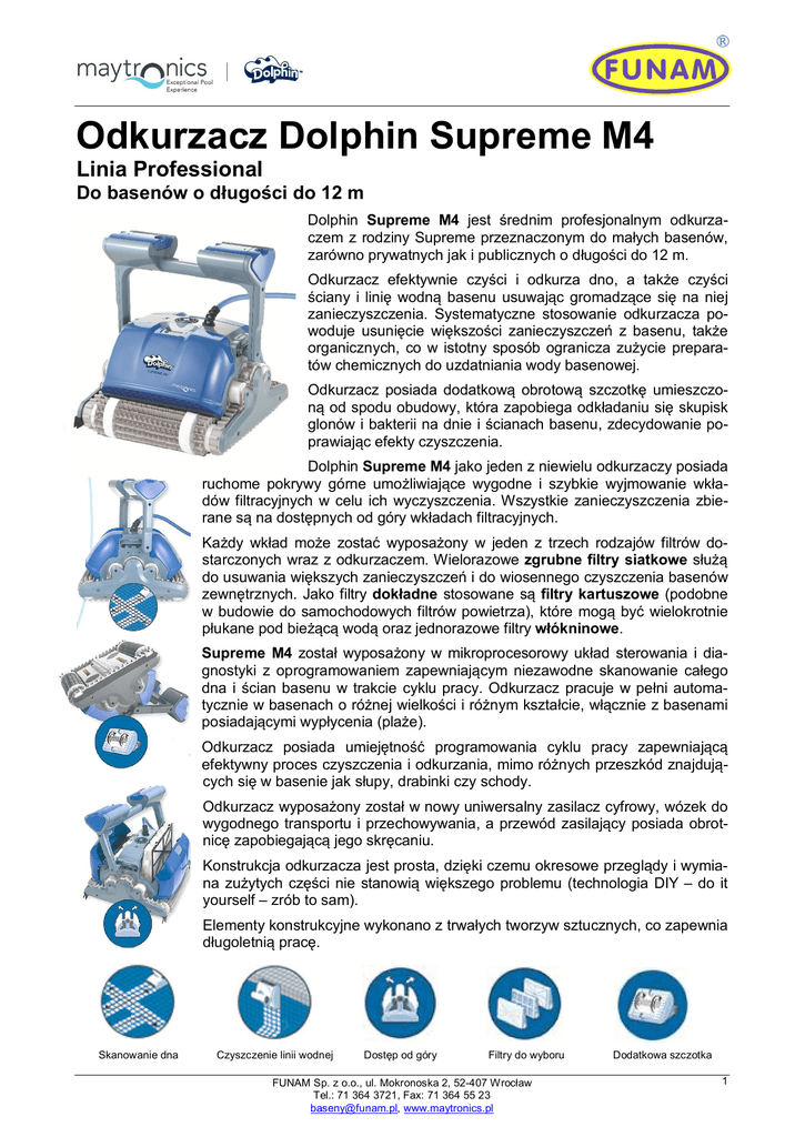 Odkurzacz Dolphin Supreme M4 Linia Professional Do basenów o długości do 12 m Dolphin Supreme M4 jest średnim profesjonalnym odkurzaczem z rodziny Supreme przeznaczonym do małych basenów, zarówno prywatnych jak i publicznych o długości do 12 m. Odkurzacz efektywnie czyści i odkurza dno, a także czyści ściany i linię wodną basenu usuwając gromadzące się na niej zanieczyszczenia. Systematyczne stosowanie odkurzacza powoduje usunięcie większości zanieczyszczeń z basenu, także organicznych, co w istotny sposób ogranicza zużycie preparatów chemicznych do uzdatniania wody basenowej. Odkurzacz posiada dodatkową obrotową szczotkę umieszczoną od spodu obudowy, która zapobiega odkładaniu się skupisk glonów i bakterii na dnie i ścianach basenu, zdecydowanie poprawiając efekty czyszczenia. Dolphin Supreme M4 jako jeden z niewielu odkurzaczy posiada ruchome pokrywy górne umożliwiające wygodne i szybkie wyjmowanie wkładów filtracyjnych w celu ich wyczyszczenia. Wszystkie zanieczyszczenia zbierane są na dostępnych od góry wkładach filtracyjnych. Każdy wkład może zostać wyposażony w jeden z trzech rodzajów filtrów dostarczonych wraz z odkurzaczem. Wielorazowe zgrubne filtry siatkowe służą do usuwania większych zanieczyszczeń i do wiosennego czyszczenia basenów zewnętrznych. Jako filtry dokładne stosowane są filtry kartuszowe (podobne w budowie do samochodowych filtrów powietrza), które mogą być wielokrotnie płukane pod bieżącą wodą oraz jednorazowe filtry włókninowe. Supreme M4 został wyposażony w mikroprocesorowy układ sterowania i diagnostyki z oprogramowaniem zapewniającym niezawodne skanowanie całego dna i ścian basenu w trakcie cyklu pracy. Odkurzacz pracuje w pełni automatycznie w basenach o różnej wielkości i różnym kształcie, włącznie z basenami posiadającymi wypłycenia (plaże). Odkurzacz posiada umiejętność programowania cyklu pracy zapewniającą efektywny proces czyszczenia i odkurzania, mimo różnych przeszkód znajdujących się w basenie jak słupy, drabinki czy schody. Odkurzacz wyposażony został w nowy uniwersalny zasilacz cyfrowy, wózek do wygodnego transportu i przechowywania, a przewód zasilający posiada obrotnicę zapobiegającą jego skręcaniu. Konstrukcja odkurzacza jest prosta, dzięki czemu okresowe przeglądy i wymiana zużytych części nie stanowią większego problemu (technologia DIY – do it yourself – zrób to sam). Elementy konstrukcyjne wykonano z trwałych tworzyw sztucznych, co zapewnia długoletnią pracę. Skanowanie dna Czyszczenie linii wodnej Dostęp od góry Filtry do wyboru FUNAM Sp. z o.o., ul. Mokronoska 2, 52-407 Wrocław Tel.: 71 364 3721, Fax: 71 364 55 23 [email protected], www.maytronics.pl Dodatkowa szczotka 1 Cechy odkurzacza Dolphin Supreme M4 Doskonała skuteczność czyszczenia i odkurzania dna, ścian i linii wodnej basenu. Cykl pracy (czyszczenia) trwa tylko 2,5 godziny, po czym następuje automatyczne wyłączenie odkurzacza. Zespół napędowy posiada zabezpieczenie przed przeciążeniem. Wyposażony w nowy uniwersalny zasilacz cyfrowy. Dwa rodzaje filtrów do wyboru: wielorazowe zgrubne siatkowe oraz wielorazowe dokładne kartuszowe. Dodatkowa aktywna szczotka od dołu odkurzacza zapobiega odkładaniu się glonów i bakterii na dnie i ścianach basenu. Nowa udoskonalona konstrukcja zaworów upustowych wody zapobiega wydostawaniu się zgromadzonych we wnętrzu odkurzacza zanieczyszczeń, a po wyjęciu z basenu zapewnia szybkie usunięcie zgromadzonej we wnętrzu wody. Przewód zasilający o długości 18 m posiada obrotnicę zapobiegającą jego skręcaniu. Technologia DIY – prosta konstrukcja ułatwia możliwość wykonywania przeglądów i wymianę zużytych części. Wyposażony jest w wózek do wygodnego transportu i przechowywania odkurzacza. Standardowo wyposażony w szczotki CB (Combi Brush) przeznaczone do basenów pokrytych różnymi rodzajami ceramiki i mozaiki, basenów wyłożonych folią PVC, jak również wykonanych z żywic poliestrowych i stali nierdzewnej. Gwarancja – 3 lata. Dane techniczne Cykl pracy (czyszczenia) Długość przewodu zasilającego Obrotnica Dokładność filtrowania Szczotki Wydajność pompy Napięcie zasilające zespół napędowy Pobór mocy zespołu napędowego Zasilacz Napięcie zasilania pierwotne Napięcie zasilania wtórne Stopień ochrony zasilacza Wózek Masa (bez przewodu) 2,5 godziny 18 m tak - zabezpieczenie przed skręcaniem przewodu 50 µm dla filtrów kartuszowych oraz 100 µm dla filtrów zgrubnych siatkowych CB, jako opcja szczotki WB 17 m3/godz 24 VDC 100 W uniwersalny cyfrowy 100 – 250 VAC poniżej 30 VDC IP 54 tak 10 kg Wersje odkurzaczy Kod 99991013 – Dolphin Supreme M4 ze szczotkami CB. Kod 99991012 – Dolphin Supreme M4 ze szczotkami WB. Opakowanie Każda wersja odkurzacza dostarczana jest w kartonie zawierającym: odkurzacz, zasilacz, wózek, instrukcję obsługi. FUNAM Sp. z o.o., ul. Mokronoska 2, 52-407 Wrocław Tel.: 71 364 3721, Fax: 71 364 55 23 [email protected], www.maytronics.pl 2