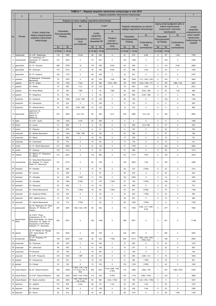 1 2 TABELA 1 – Wyjazdy zespołów ratownictwa medycznego w roku 2015 Wyjazdy zespołów ratownictwa medycznego 4 5 Wyjazdy do stanu nagłego zagrożenia zdrowotnego 3 w tym: 4c Lp. Powiat Liczba, rodzaj oraz miejsce stacjonowania zespołów ratownictwa medycznego Obywatele Rzeczypospolitej Polskiej Cudzoziemcy (kraj pochodzenia) 4a 4b Liczba pacjentów urazowych obywatele RP 4d 4e 7 6 Wyjazdy niezwiązane ze stanem nagłego zagrożenia zdrowotnego 4f Pacjenci urazowi cudzoziemcy (kraj pochodzenia) 5a 5b 5c Cudzoziemcy (kraj pochodzenia) 0-18 lat > 18 lat 1 białobrzeski 1S, 0,5P - Białobrzegi 114 1863 15-UA 39 225 4 41 573 4-UA 0 87 1-UA 1725 2 ciechanowski 1S - Ciechanów; 1P Ciechanów; 1P - Gołymin Ośrodek 147 2442 0 75 507 0 102 1428 0 0 149 0 3159 3 garwoliński 1S, 1P - Garwolin 288 2799 10 118 595 9-UA 64 808 0 2 114 4-UA 2958 4 garwoliński 1P - Gończyce 110 1214 4 45 243 4-UA 24 396 1-UA 0 40 0 1245 5 gostyniński 1S, 1P - Gostynin 125 1770 0 48 380 0 32 541 0 0 77 0 2167 6 grodziski 1P-Milanówek, 1S-Grodzisk Mazowiecki 76 1676 0 28 204 1-UA 291 3338 1-LT, 1-DE, 1-CN 0 142 0 3654 7 grójecki 1S; 1P - Grójec 43 1742 7-UA 37 486 3-UA, 1-RU 48 1979 2-UA, 1-RU, 1-TJ 0 147 1-BG, 1-UA 4381 8 grójecki 1S - Warka 19 825 1-LV 16 218 0 19 943 1-UA 0 69 0 2031 9 grójecki 1S - Nowe Miasto 27 383 1-BG 5 33 1-BG 55 823 2-UA, 1-DE 0 83 1-UA 828 10 grójecki 1P - Mogielnica 19 354 0 3 36 0 68 956 2-UA, 1-SB 0 0 0 984 11 kozienicki 1S - Kozienice 49 1029 2-UA, 1-RO 13 124 0 36 739 0 1 102 0 1194 12 kozienicki 1P - Głowaczów 91 912 0 11 158 0 9 191 0 0 0 0 925 13 kozienicki 1P - Świerże Górne 40 851 2-UA, 1-DE 15 152 0 12 213 0 0 0 0 890 14 legionowski Legionowo 1S, Jabłonna 1P, Zegrze 1P, Serock 1S, 274 4000 5-LV, UA 60 365 2-LV 423 4895 3-LV, UA 0 184 0 5593 15 lipski 1S, 0,5P - Lipsko 100 1932 2-UA 25 288 0 0 0 0 0 6 0 1556 16 łosicki 1S - Łosice 73 866 2 2 38 0 13 288 2-LV,1-BL 2 37 0 938 17 łosicki 1P - Platerów 31 679 1 0 21 0 6 187 0 0 23 0 705 18 makowski 1S - Maków Mazowiecki 43 1040 1-DE; 1-SE 12 154 0 20 392 0 0 67 0 166 19 makowski 1P - Różan 20 662 0 10 98 0 17 238 0 0 15 0 95 20 makowski 1P - Krasnosielc 30 774 0 10 92 0 17 178 0 0 10 0 101 21 miński 1S, 1P - Mińsk Mazowiecki 311 3682 0 21 136 0 71 1279 0 1 162 0 3984 22 miński 1P - Kałuszyn 105 1414 0 6 50 0 31 488 0 0 48 0 1513 23 mławski 1S - Mława; 1P - Strzegowo; 1P - Mława 173 2231 0 119 680 0 107 1731 1-KP 2 153 0 3278 24 nowodworski 1S - Nowy Dwór Mazowiecki; 1S - Nasielsk; 1P - Kazuń Polski; 1P - Zakroczym 151 2710 0 92 749 0 154 2504 1-UA 0 182 0 4396 25 ostrołęcki 1P - Kadzidło 44 656 0 13 97 0 49 737 2-TDU 0 20 0 1014 26 ostrołęcki 1P - Czerwin 21 496 0 8 97 0 36 530 0 0 22 0 842 27 ostrołęcki 1P - Ostrołęka 33 528 1-TDU 11 105 0 123 2502 0 0 19 0 1881 28 ostrołęcki 1S - Ostrołęka 93 1064 2-TDU 31 157 1-TDU 57 753 2-TDU 1 108 0 1338 29 ostrołęcki 1S - Myszyniec 32 480 0 15 78 0 49 695 0 0 32 0 701 30 ostrowski 1S - Ostrów Mazowiecka 40 512 1-TDU 16 65 1-TDU 53 941 6-TDU 1 78 0 1198 31 ostrowski 1S - Szulborze Wielkie 22 343 0 7 35 0 34 530 1-TDU 0 34 0 593 32 ostrowski 0,5P - Małkinia Górna 13 273 0 7 33 0 38 551 0 0 10 0 648 33 ostrowski 1P - Ostrów Mazowiecka 25 713 1-TDU 7 95 0 89 1509 3-TDU 1 8 0 1769 34 piaseczyński 1S, 1P - Piaseczno; 1P - Góra Kalwaria; 1P - Mroków; 1P Tarczyn 287 3927 1-SE, 1-UA, 1-BY 80 522 0 712 7463 2-DE, 1-LT, 1-RO, 9-UA 0 277 0 7602 płocki/miasto 35 Płock 1S, 0,35 P - PłockŁukasiewicza; 1S, 1P Płock–Stare Miasto; 1S - PłockPodolszyce; 1S - Gąbin; 1S Wyszogród; 0,15 Pw PłockKolejowa; 1P - Staroźreby 422 6741 0 162 1168 0 389 5971 0 3 441 0 11188 214 3040 0 106 720 0 184 2551 0 1 240 0 4454 36 płoński 1S, 1P - Płońsk; 1S - Raciąż; 0,5P - Nowe Miasto; 1P Glinojeck 1S, 1P - Pruszków; 1P Otrębusy 0-18 lat > 18 lat Obywatele Rzeczypospolitej Polskiej 0-18 lat > 18 lat Zgony przed podjęciem albo w trakcie wykonywania Liczba medycznych czynności pacjentów ratunkowych przewiezionych przez zespół 6c Obywatele ratownictwa Rzeczypospolit medycznego do ej Polskiej Cudzoziemcy szpitala (kraj 6a 6b pochodzenia) 0-18 lat > 18 lat 138 2035 1-UA 26 224 1-TDU 638 6712 1-BG, 1-DE, 1-RO, 3-RU, 3-UA 1 196 0 6004 38 przasnyski 1S - Przasnysz 95 1207 0 44 404 0 37 583 0 8 45 0 1375 39 przasnyski 1P - Jednorożec 48 593 0 21 194 0 16 231 0 0 22 0 620 40 przasnyski 1 P-Chorzele 60 745 0 16 247 0 4 106 0 0 7 0 725 41 przysuski 1S, 0,5P - Przysucha 134 1424 1-BR 36 214 0 87 940 2-DE, 1-LV 1 75 0 1663 42 pułtuski 1P - Pokrzywnica 35 537 0 19 103 0 31 383 1-TDU 0 19 0 661 43 pułtuski 1S - Pułtusk 35 742 0 15 120 0 103 1185 2-TDU 1 54 0 1342 44 miasto Radom 2S, 2P - Radom-Centrum 909 12645 11-BG, 1-YE, 1-UA, 1-IT, 4-UA,1-DF, 8TDU 259 2047 4-UA, 3-BG, 1-DE, 2 TDU 173 3999 3-BG, 1-TR 1 434 1-BG,1-TDU 13021 45 miasto Radom 1S; 0,5P - Radom-Potkanów 328 3409 2-BG, 1-UK, 2-TDU 115 522 2-TDU 107 1718 3-BG, 1-TDU 1 123 0 3895 46 miasto Radom 1P - Radom-Józefów 232 3265 1-DE, 1-BG, 4-UA, 1-TR, 5-TDU 93 562 2-UA, 1-TDU 49 746 1-UA, 1-RU, 1-TDU 0 0 0 3347 47 radomski 1S - Jedlińsk 107 878 2-UA 28 131 1-UA 24 497 1-UA 1 63 0 1010 48 radomski 1S - Zakrzew 104 924 0 41 139 0 53 539 1-UA 11 52 0 1083 49 radomski 1S - Pionki 53 613 0 16 96 0 60 1101 0 0 59 1-RU 1129 37 pruszkowski 50 radomski 1P - Jedlnia Letnisko 110 1411 0 32 238 0 31 539 1-BG, 1-BE, 1-UA 0 51 radomski 1P - Skaryszew 52 radomski 1S - Iłża 53 radomski 72 704 14-BG,1-TDU 21 150 2-BG 31 373 3-BG, 1-UA, 1-TDU 31 1427 0 7 845 0 24 582 0 1P - Wierzbica 122 1466 0 47 243 0 17 358 54 siedlecki 1P - Dąbrówka Ług 121 958 0 5 36 0 21 55 siedlecki 1P - Zbuczyn 63 817 1 3 32 1-BY 11 56 siedlecki 1P - Hołubla 50 808 0 3 24 0 57 miasto Siedlce 1S, 1P - Siedlce ul. Świrskiego 38 383 3596 3 28 144 58 miasto Siedlce 1S - Siedlce ul. Składowa 7G 159 1394 1 8 59 sierpecki 1S, 1P - Sierpc 123 2089 0 49 60 sochaczewski 3P, 1S, 1P - Sochaczew; 1P Iłów; 0,5P - Paprotnia 138 2643 1-GH, 1-LT, 3-UA 5