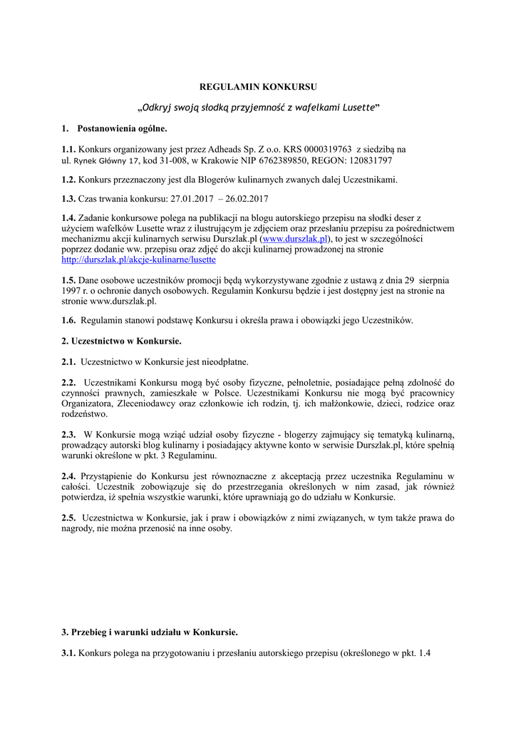 REGULAMIN KONKURSU „Odkryj swoją słodką przyjemność z wafelkami Lusette” 1. Postanowienia ogólne. 1.1. Konkurs organizowany jest przez Adheads Sp. Z o.o. KRS 0000319763 z siedzibą na ul. Rynek Główny 17, kod 31-008, w Krakowie NIP 6762389850, REGON: 120831797 1.2. Konkurs przeznaczony jest dla Blogerów kulinarnych zwanych dalej Uczestnikami. 1.3. Czas trwania konkursu: 27.01.2017 – 26.02.2017 1.4. Zadanie konkursowe polega na publikacji na blogu autorskiego przepisu na słodki deser z użyciem wafelków Lusette wraz z ilustrującym je zdjęciem oraz przesłaniu przepisu za pośrednictwem mechanizmu akcji kulinarnych serwisu Durszlak.pl (www.durszlak.pl), to jest w szczególności poprzez dodanie ww. przepisu oraz zdjęć do akcji kulinarnej prowadzonej na stronie http://durszlak.pl/akcje-kulinarne/lusette 1.5. Dane osobowe uczestników promocji będą wykorzystywane zgodnie z ustawą z dnia 29 sierpnia 1997 r. o ochronie danych osobowych. Regulamin Konkursu będzie i jest dostępny jest na stronie na stronie www.durszlak.pl. 1.6. Regulamin stanowi podstawę Konkursu i określa prawa i obowiązki jego Uczestników. 2. Uczestnictwo w Konkursie. 2.1. Uczestnictwo w Konkursie jest nieodpłatne. 2.2. Uczestnikami Konkursu mogą być osoby fizyczne, pełnoletnie, posiadające pełną zdolność do czynności prawnych, zamieszkałe w Polsce. Uczestnikami Konkursu nie mogą być pracownicy Organizatora, Zleceniodawcy oraz członkowie ich rodzin, tj. ich małżonkowie, dzieci, rodzice oraz rodzeństwo. 2.3. W Konkursie mogą wziąć udział osoby fizyczne - blogerzy zajmujący się tematyką kulinarną, prowadzący autorski blog kulinarny i posiadający aktywne konto w serwisie Durszlak.pl, które spełnią warunki określone w pkt. 3 Regulaminu. 2.4. Przystąpienie do Konkursu jest równoznaczne z akceptacją przez uczestnika Regulaminu w całości. Uczestnik zobowiązuje się do przestrzegania określonych w nim zasad, jak również potwierdza, iż spełnia wszystkie warunki, które uprawniają go do udziału w Konkursie. 2.5. Uczestnictwa w Konkursie, jak i praw i obowiązków z nimi związanych, w tym także prawa do nagrody, nie można przenosić na inne osoby. 3. Przebieg i warunki udziału w Konkursie. 3.1. Konkurs polega na przygotowaniu i przesłaniu autorskiego przepisu (określonego w pkt. 1.4 Regulaminu) na słodki deser wraz z ilustrującym je zdjęciem według zasad zamieszczonych na stronie http://durszlak.pl/akcje-kulinarne/lusette 3.2. Aby zgłosić przepis należy: 3.2.1. przygotować przepis na deser z użyciem wafelków Lusette, 3.2.2. umieścić w liście składników nazwę wafelka. We wpisie powinien się znaleźć link do http://lusette.pl/ 3.2.3. zrobić zdjęcie dania, 3.2.4. dodać konkursowy baner na stronę bloga , 3.2.5. opublikować przepis wraz ze zdjęciem w formie wpisu na prowadzonym przez Uczestnika blogu 3.2.6. zgłosić wpis z daniem konkursowym oraz wraz ze stosownym zdjęciem do Konkursu za pośrednictwem strony: http://durszlak.pl/akcje-kulinarne/lusette Jeden Uczestnik może zgłosić maksymalnie 3 przepisy do akcji konkursowej. 3.2.7. W przepisie oraz na zdjęciach zgłoszonych do konkursu nie mogą być lokowane produkty żadnych innych marek. 3.3. Poprzez zgłoszenie przepisu do Konkursu w sposób wyżej określony, Uczestnik Konkursu oświadcza, że treść i forma każdej z zamieszczonych wypowiedzi konkursowych nie narusza przepisów prawa, ani prawem chronionych dóbr osób trzecich, a uczestnik Konkursu jest w pełni uprawniony do zgłoszenia każdej z wypowiedzi konkursowych. 3.4. Z tytułu złożonego powyżej oświadczenia Uczestnik przyjmuje na siebie pełną odpowiedzialność prawną. W przypadku jakichkolwiek roszczeń ze strony osób trzecich Uczestnik, po zawiadomieniu go przez Organizatora, nie uchyli się od niezwłocznego przystąpienia do wyjaśnienia sprawy oraz wystąpi przeciwko takim roszczeniom na własny koszt i ryzyko, a nadto zaspokoi wszelkie uzasadnione roszczenia, a w razie ich zasądzenia od Organizatora, regresowo zwróci całość pokrytych roszczeń oraz wszelkie związane z tym wydatki i opłaty, włączając w to koszty procesu i obsługi prawnej, a także naprawi wszelkie inne szkody wynikające z wyżej opisanych roszczeń osób trzecich. 3.5. Uczestnicy konkursu wyrażają zgodę na korzystanie przez Organizatora konkursu i Zleceniodawcę z autorskich praw majątkowych do zgłoszonego przepisu a także wszelkich Utworów będących składnikami Zgłoszenia (w szczególności takich jak zdjęcia), w sytuacji gdy ich przepisy zostaną nagrodzone lub wyróżnione, bez ograniczeń terytorialnych i czasowych na następujących polach eksploatacji: 3.5.1. wprowadzanie do pamięci komputera, publiczne wykonanie albo publiczne odtwarzanie, publikacja w Internecie na następujących stronach: www.lusette.pl oraz profilach społecznościowych marki Lusette, a także na stronie www.durszlak.pl. 3.5.2. publikowanie, publiczne odtwarzanie i przedrukowywanie na materiałach promocyjnoinformacyjnych IDC Polonia Sp. z o. o., wykorzystywanych w ramach komunikacji wewnętrznej i zewnętrznej. 3.6. Powyższa zgoda określona w pkt. 3.5. jest równoznaczna z przekazaniem praw autorskich w zakresie jak wyżej przez Uczestnika, w zamian za otrzymaną nagrodę w konkursie. Dodatkowo, Uczestnicy wyrażają zgodę na użycie ich wizerunków w zakresie wskazanym powyżej w wypadku przyznania im nagród określonych w pkt. 4.3.1. , 4.3.2. i 4.3.3. 4. Zasady wyłaniania zwycięzców w konkursie, skład Jury oraz Nagrody. 4.1. Finalistów Konkursu ze wskazaniem nagrodzonych przepisów wybiera Jury Konkursowe. 4.2. Ocenie w konkursie podlegać będą: kreatywne i ciekawe przepisy na deser. 4.3. Zwycięzca będzie wyłoniony na podstawie niezależnej, kolegialnej decyzji Jury, wydanej nie później niż 14 dni po dacie zakończenia konkursu. Decyzja zostanie ogłoszona w ww. przewidzianym terminie za pośrednictwem strony www.dur