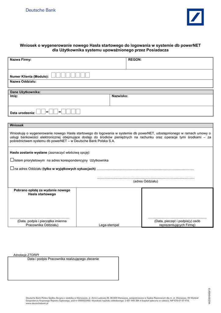 Deutsche Bank Wniosek o wygenerowanie nowego Hasła startowego do logowania w systemie db powerNET dla Użytkownika systemu upoważnionego przez Posiadacza Nazwa Firmy: REGON: Numer Klienta (Modulo): Nazwa Oddziału: Dane Użytkownika: Imię: Data urodzenia: Nazwisko: -- Wniosek Wnioskuję o wygenerowanie nowego Hasła startowego do logowania w systemie db powerNET, udostępnionego w ramach umowy o usługi bankowości elektronicznej obejmujące dostęp do środków pieniężnych na rachunku oraz operacje tymi środkami – za pośrednictwem systemu db powerNET – w Deutsche Bank Polska S.A. Hasło zostanie wysłane (zaznaczyć właściwą opcję): □listem priorytetowym na adres korespondencyjny Użytkownika □na adres Oddziału (tylko w wyjątkowych sytuacjach) ......................................................................................................... ......................................................................................................... (adres Oddziału) Pobrano opłatę za wydanie nowego Hasła startowego ................................................................ (Data, podpis i pieczątka imienna Pracownika Oddziału) Lega-stempel ............................................................... (Data, pieczęć i podpis(y) osób reprezentujących Firmę) Adnotacje ZTORiPI Deutsche Bank Polska Spółka Akcyjna z siedzibą w Warszawie, al. Armii Ludowej 26, 00-609 Warszawa, zarejestrowana w Sądzie Rejonowym dla m. st. Warszawy, XII Wydział Gospodarczy Krajowego Rejestru Sądowego, pod nr 0000022493. Wysokość kapitału zakładowego: 2 651 449 384 zł (kapitał opłacony w całości), NIP 676-01-07-416. www.deutschebank.pl WZ/2010/03/13 Data i podpis Pracownika realizującego zlecenie