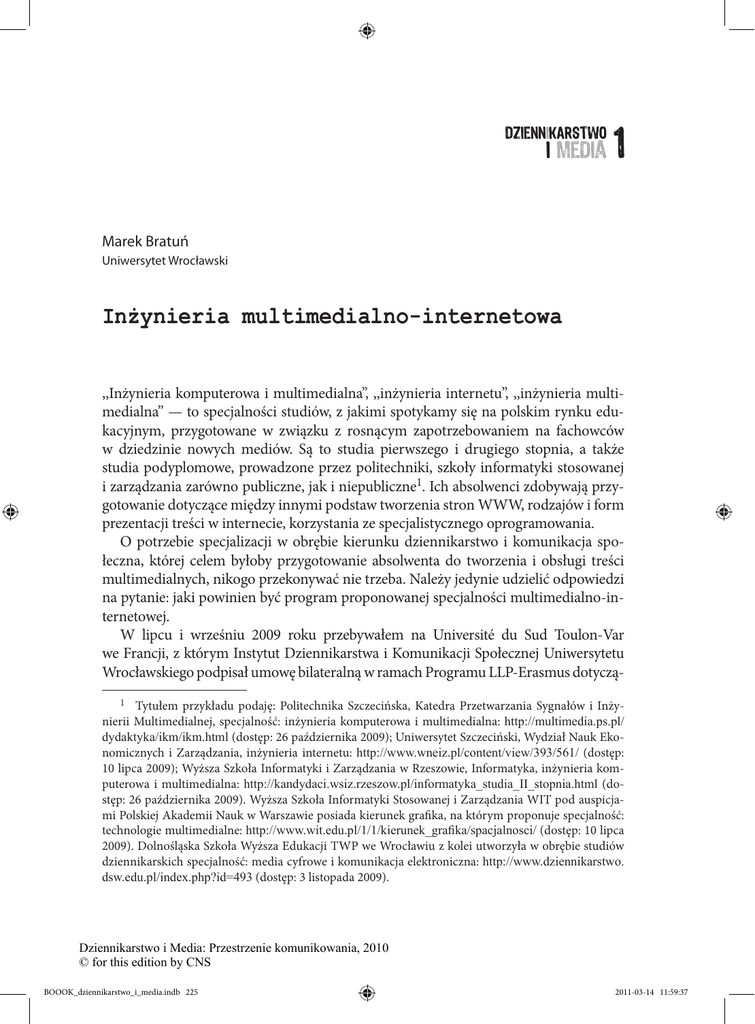 Marek Bratuń Uniwersytet Wrocławski Inżynieria multimedialno-internetowa ,,Inżynieria komputerowa i multimedialna”, ,,inżynieria internetu”, ,,inżynieria multimedialna” — to specjalności studiów, z jakimi spotykamy się na polskim rynku edukacyjnym, przygotowane w związku z rosnącym zapotrzebowaniem na fachowców w dziedzinie nowych mediów. Są to studia pierwszego i drugiego stopnia, a także studia podyplomowe, prowadzone przez politechniki, szkoły informatyki stosowanej i zarządzania zarówno publiczne, jak i niepubliczne1. Ich absolwenci zdobywają przygotowanie dotyczące między innymi podstaw tworzenia stron www, rodzajów i form prezentacji treści w internecie, korzystania ze specjalistycznego oprogramowania. O potrzebie specjalizacji w obrębie kierunku dziennikarstwo i komunikacja społeczna, której celem byłoby przygotowanie absolwenta do tworzenia i obsługi treści multimedialnych, nikogo przekonywać nie trzeba. Należy jedynie udzielić odpowiedzi na pytanie: jaki powinien być program proponowanej specjalności multimedialno-internetowej. W lipcu i wrześniu 2009 roku przebywałem na Université du Sud Toulon-Var we Francji, z którym Instytut Dziennikarstwa i Komunikacji Społecznej Uniwersytetu Wrocławskiego podpisał umowę bilateralną w ramach Programu LLP-Erasmus dotyczą1 Tytułem przykładu podaję: Politechnika Szczecińska, Katedra Przetwarzania Sygnałów i Inżynierii Multimedialnej, specjalność: inżynieria komputerowa i multimedialna: http://multimedia.ps.pl/ dydaktyka/ikm/ikm.html (dostęp: 26 października 2009); Uniwersytet Szczeciński, Wydział Nauk Ekonomicznych i Zarządzania, inżynieria internetu: http://www.wneiz.pl/content/view/393/561/ (dostęp: 10 lipca 2009); Wyższa Szkoła Informatyki i Zarządzania w Rzeszowie, Informatyka, inżynieria komputerowa i multimedialna: http://kandydaci.wsiz.rzeszow.pl/informatyka_studia_II_stopnia.html (dostęp: 26 października 2009). Wyższa Szkoła Informatyki Stosowanej i Zarządzania WIT pod auspicjami Polskiej Akademii Nauk w Warszawie posiada kierunek grafika, na którym proponuje specjalność: technologie multimedialne: http://www.wit.edu.pl/1/1/kierunek_grafika/spacjalnosci/ (dostęp: 10 lipca 2009). Dolnośląska Szkoła Wyższa Edukacji TWP we Wrocławiu z kolei utworzyła w obrębie studiów dziennikarskich specjalność: media cyfrowe i komunikacja elektroniczna: http://www.dziennikarstwo. dsw.edu.pl/index.php?id=493 (dostęp: 3 listopada 2009). Dziennikarstwo i Media: Przestrzenie komunikowania, 2010 © for this edition by CNS BOOOK_dziennikarstwo_i_media.indb 225 2011-03-14 11:59:37 226 Marek Bratuń cą wymiany studentów i pracowników naukowych. Naszym partnerem został tamtejszy Institut Ingémédia — Ingénierie de l’Internet et du Multimédia (Instytut Ingémédia — Inżynieria Internetu i Multimediów). Dzięki poczynionym na miejscu obserwacjom, licznym rozmowom przeprowadzonym zarówno z tamtejszymi wykładowcami, jak i studentami oraz otrzymanym od dyrekcji wspomnianego instytutu materiałom chciałbym podzielić się informacjami dotyczącymi koncepcji i organizacji studiów w ramach specjalności Inżynieria Internetu i Multimediów na Uniwersytecie w Toulonie2. Zacznijmy od licencjatu. Na tym poziomie studiów mamy trzy specjalności: pierwsza to praktyczne multimedia, internet, choreografia i teatr; druga to konwergencja internetowa, audiowizualna i cyfrowa; trzecia to nowe technologie dźwięku. Pierwsza z wymienionych specjalności pozwala muzykom, tancerzom i aktorom na pogłębienie ich artystycznego doświadczenia, dostarcza im niezbędnej wiedzy dotyczącej twórczości w wymiarze cyfrowym. Druga adresowana jest nie tylko do muzyków, lecz także — a może nawet przede wszystkim — do przyszłych specjalistów pracujących w studiach nagrań, reżyserów przedstawień muzycznych, tanecznych i teatralnych, organizatorów produkcji audiowizualnej, telewizyjnej i radiowej. Trzecia z wymienionych specjalności ma za zadanie stworzenie pomostu między profesjami z obszaru audiowizualnego i internetowego, przy czym idzie tutaj o podwójny wymiar nabywanych kompetencji: zarówno o te, które wiążą się z szeroko pojętą kulturą, jak i te, które odwołują się do nowoczesnych technologii. Warto podkreślić, że realizacja wszystkich wymienionych na poziomie licencjatu specjalności dokonuje się zgodnie z podejściem wielodyscyplinarnym. Nie jest to zatem edukacja prowadzona w sposób wąskospecjalistyczny (technologiczno-informatyczny), lecz także uwzględniająca bogaty plan kulturowy. Dwa ważne elementy francuskiego procesu edukacji, na które należy zwrócić uwagę, to dwunastotygodniowy staż, który rozpoczyna się z początkiem stycznia3, oraz projekt grupowy, do którego realizacji przystosowane są wszystkie prowadzone na uczelni francuskiej zajęcia. Na poziomie dwuletnich studiów magisterskich uzupełniających mamy następujące specjalności: e-redactionnel, której zadaniem jest kształcenie specjalistów w dziedzinie e-publikacji; inżynieria mediów, która ma kształcić fachowców w sektorze nowych technologii multimedialnych; inteligencja ekonomiczno-terytorialna — ma na celu kształcenie specjalistów zajmujących się gromadzeniem i rozpowszechnianiem informacji; produkcja cyfrowa i integracja — kształci specjalistów zajmujących się cyfryzacją mediów; narzędzia społeczno-techniczne informacji i komunikacji — specjalność ta kształci fachowców zajmujących się analizą fenomenów kultury, komunikacji wizualnej, interkulturowej, informacji, technologii informacji i komunikacji w sensie szerokim, a także mediów. 2 Wszystkich zainteresowanych odsyłam do strony internetowej Instytutu: http://www.ingemedia. net/ (dostęp: 3 maja 2009). 3 Na Uniwersytecie w Toulonie rok akademicki rozpoczyna się 7 września. Dziennikarstwo i Media: Przestrzenie komunikowania, 2010 © for this edition by CNS BOOOK_dzien