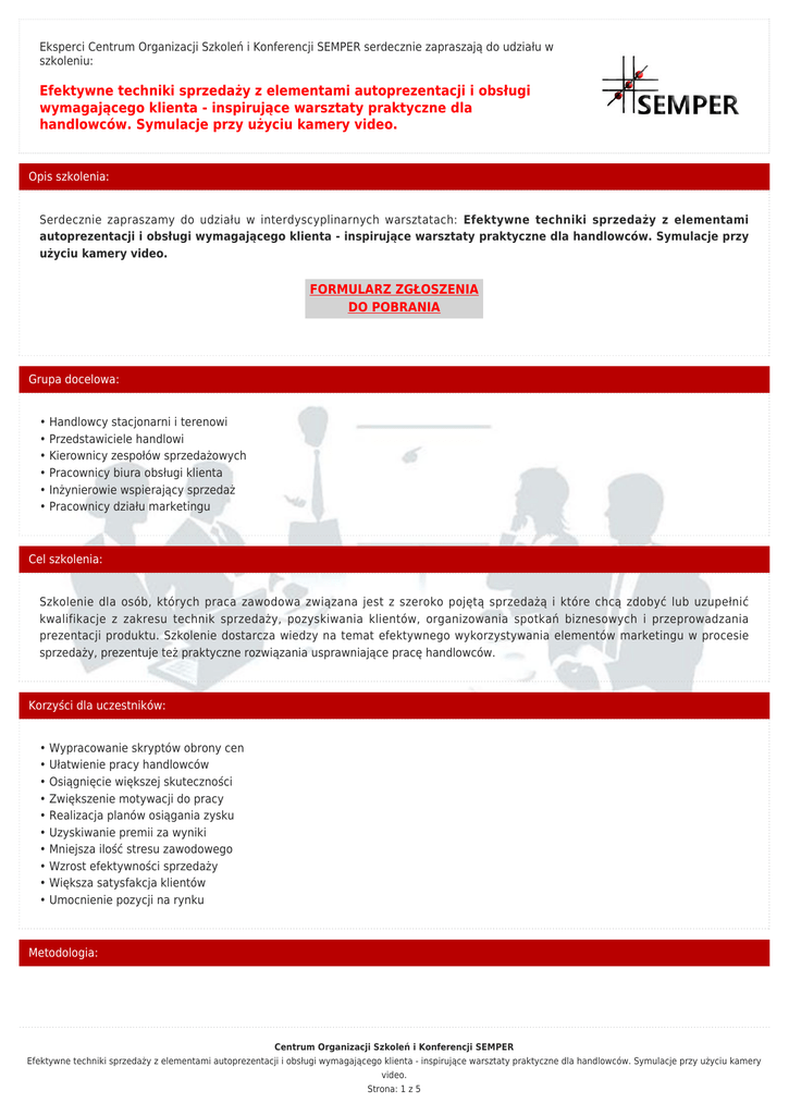 Eksperci Centrum Organizacji Szkoleń i Konferencji SEMPER serdecznie zapraszają do udziału w szkoleniu: Efektywne techniki sprzedaży z elementami autoprezentacji i obsługi wymagającego klienta - inspirujące warsztaty praktyczne dla handlowców. Symulacje przy użyciu kamery video. Opis szkolenia: Serdecznie zapraszamy do udziału w interdyscyplinarnych warsztatach: Efektywne techniki sprzedaży z elementami autoprezentacji i obsługi wymagającego klienta - inspirujące warsztaty praktyczne dla handlowców. Symulacje przy użyciu kamery video. FORMULARZ ZGŁOSZENIA DO POBRANIA Grupa docelowa: • Handlowcy stacjonarni i terenowi • Przedstawiciele handlowi • Kierownicy zespołów sprzedażowych • Pracownicy biura obsługi klienta • Inżynierowie wspierający sprzedaż • Pracownicy działu marketingu Cel szkolenia: Szkolenie dla osób, których praca zawodowa związana jest z szeroko pojętą sprzedażą i które chcą zdobyć lub uzupełnić kwalifikacje z zakresu technik sprzedaży, pozyskiwania klientów, organizowania spotkań biznesowych i przeprowadzania prezentacji produktu. Szkolenie dostarcza wiedzy na temat efektywnego wykorzystywania elementów marketingu w procesie sprzedaży, prezentuje też praktyczne rozwiązania usprawniające pracę handlowców. Korzyści dla uczestników: • Wypracowanie skryptów obrony cen • Ułatwienie pracy handlowców • Osiągnięcie większej skuteczności • Zwiększenie motywacji do pracy • Realizacja planów osiągania zysku • Uzyskiwanie premii za wyniki • Mniejsza ilość stresu zawodowego • Wzrost efektywności sprzedaży • Większa satysfakcja klientów • Umocnienie pozycji na rynku Metodologia: Centrum Organizacji Szkoleń i Konferencji SEMPER Efektywne techniki sprzedaży z elementami autoprezentacji i obsługi wymagającego klienta - inspirujące warsztaty praktyczne dla handlowców. Symulacje przy użyciu kamery video. Strona: 1 z 5 Jako pierwsza instytucja szkoleniowa w Polsce dbamy o to aby również szkolenia otwarte były dopasowane do oczekiwań oraz stylu pracy uczestników! Indywidualizacja szkolenia - dzięki udziałowi w takim szkoleniu uczestnicy osiągają oczekiwany przez pracodawcę poziom kompetencji i umiejętności. Zajęcia są prowadzone metodą warsztatową opartą na aktywizacji uczestników szkolenia poprzez pracę w małych grupach, dyskusje na forum grupy oraz ćwiczenia, studia przypadków, scenki rodzajowe, pracę indywidualną, symulacje i mini- wykłady z omówieniem przykładów z życia i prezentacją multimedialną. Przedmiotem zajęć są realne trudności uwzględniające specyfikę danej branży oraz potrzeby i możliwości osób biorących udział w warsztatach. Uczestnicy uczą się poprzez doświadczenie – ćwiczą różne sytuacje, mają możliwość konsultacji indywidualnych. Nauka poprzez kreatywność, elastyczność i osobiste doświadczenia jest najskuteczniejszą formą zdobywania nowych umiejętności. SZKOLENIE REALIZOWANE PRZY UŻYCIU KAMERY VIDEO Szczególnie ciekawe i pozwalające spojrzeć na siebie z innej perspektywy będą zajęcia z użyciem kamery, podczas których każdy z uczestników szkolenia będzie mógł zostać poddany konstruktywnej ocenie. Program szkolenia: Wprowadzenie w tematykę profesjonalnej sprzedaży Sprzedaż - zakres oraz istota zjawiska. Definicja profesjonalnej sprzedaży. Sprzedawca - profesjonalista: cechy, wiedza, umiejętności. Klient: sposób myślenia i podejmowania decyzji oraz oczekiwania wobec sprzedawcy. Sprzedawanie jako proces- struktura procesu sprzedaży. Stary i nowy model procesu sprzedaży. 5 kroków/etapów procesu sprzedaży. Etap I: Nawiązywanie kontaktu i budowanie właściwych relacji z klientem. Pierwsze wrażenie oraz sztuka świadomej autoprezentacji sprzedawcy. Elementy prawidłowego powitania i nawiązywania kontaktu. Techniki budowania właściwych relacji z klientem tzw. szybkie zaprzyjaźnianie się: kontakt wzrokowy, body focus, obdarzanie uwagą, aktywne słuchanie, odzwierciedlanie zachowań oraz tzw. dostrajanie się do klienta w sferze komunikacji werbalnej i niewerbalnej; ABC mowy ciała sprzedawcy. Dopasowanie zachowań i działań sprzedawcy do: - typu osobowości klienta - preferowanych systemów reprezentacji językowej - zestawu metaprogramów. Etap II: Analiza potrzeb oraz bieżącej sytuacji klienta. Zbieranie informacji o kliencie przed i w trakcie spotkania. Pytania stosowane w procesie sprzedaży; rodzaje pytań oraz techniki ich zadawania. Odkrywanie rzeczywistych potrzeb klienta. Identyfikacja potencjalnych obszarów problemowych oraz określanie ich znaczenia dla klienta; generowanie poczucia dysonansu pomiędzy sytuacją obecną a pożądaną z punktu widzenia sprzedawcy. Etap III: Prezentacja firmy oraz jej oferty handlowej. Cele i efekty udanej prezentacji handlowej. Zasady konstruowania prezentacji handlowej oraz dopasowanie jej do odbiorcy/odbiorców. Centrum Organizacji Szkoleń i Konferencji SEMPER Efektywne techniki sprzedaży z elementami autoprezentacji i obsługi wymagającego klienta - inspirujące warsztaty praktyczne dla handlowców. Symulacje przy użyciu kamery video. Strona: 2 z 5 Schemat prezentacji handlowej. Metody zwiększające stopień zapamiętywania prezentacji: układ materiału, wartość poszczególnych grup informacji, magiczne słowa, zasada zaangażowania klienta oraz zjawisko indukcji zmysłów; psychologiczny efekt pierwszeństwa oraz świeżości. Język i styl prezentacji /m.in. cechy a korzyści, język korzyści/. Kolejność prezentowania poszczególnych elementów oferty handlowej oraz zasady tzw. sprzedaży asortymentowej. Przygotowywanie wspólnej modelowej prezentacji pt.: Kilka słów o mojej firmie oraz krótkich prezentacji wybranych produktów lub usług. Etap IV: Obiekcje zgłaszane przez klienta podczas rozmowy handlowej oraz metody radzenia sobie z nimi stosowane przez sprzedawcę. Definicja obiekcji oraz najczęstsze przyczyny 