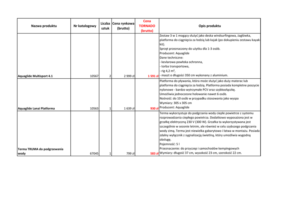 Nazwa produktu Nr katalogowy Liczba Cena rynkowa sztuk (brutto) Aquaglide Multisport 4.1 10567 2 2 999 zł Aquaglide Lanai Platforma 10563 1 1 639 zł Terma TRUMA do podgrzewania wody 67045 1 799 zł Cena TORNADO (brutto) Opis produktu Zestaw 3 w 1 mogący służyć jako deska windsurfingowa, żaglówka, platforma do ciągnięcia za łodzią lub kajak (po dokupieniu zestawu kayakkit). Sprzęt przeznaczony do użytku dla 1-3 osób. Producent: Aquaglide Dane techniczne: - kevlarowa powłoka ochronna, - torba transportowa, - rig 4,2 m², 1 591 zł - maszt o długości 350 cm wykonany z aluminium. Platforma do pływania, która może służyć jako duży materac lub platforma do ciągnięcia za łodzią. Platforma posiada kompletne poszycie nylonowe - bardzo wytrzymałe PCV oraz szybkozłączkę. Umożliwia jednoczesne holowanie nawet 6 osób. Nośność: do 10 osób w przypadku stosowania jako wyspa Wymiary: 305 x 305 cm 930 zł Producent: Aquaglide Terma wykorzystuje do podgrzania wody ciepłe powietrze z systemu rozprowadzania ciepłego powietrza. Dodatkowo wyposażona jest w grzałkę elektryczną 230 V (300 W). Grzałka ta wykorzystywana jest szczególnie w sezonie letnim, ale również w celu szybszego podgrzania wody zimą. Terma jest niewielka gabarytowo i łatwa w montażu. Posiada zdalny wyłącznik z sygnalizacją świetlną, który umożliwia wygodną obsługę. Pojemność: 5 l Przeznaczenie: do przyczep i samochodów kempingowych 583 zł Wymiary: długość 37 cm, wysokość 23 cm, szerokość 22 cm. Bagażnik rowerowy Caravan XL A PRO Aquaglide Lanai Softpack Fiamma Safe Door 02093A91 1 1 085 zł 10564 1 506 zł Bagażnik na 2 rowery. Bagażnik montowany jest na dyszlu przyczepy kempingowej. Producent: Fiamma Dane techniczne: waga: ok. 9 kg maksymalna ładowność: 50 kg 537 zł wymiary: 128 x 52,5 x 100 cm Oparcie/poduszka do platformy Aquaglide Lanai, zawierająca termiczną kieszeń na napoje. 418 zł Producent: Aquaglide 214/096 1 599 zł Zestaw blokad drzwiowych Fiamma Safe Door - 3 szt. Wymiary każdej z 354 zł blokad: 15 x 9 x 5 cm Stół turystyczny składany Uwe 116x69x54/78cm z aluminiowymi nogami 910540 2 231 zł 214 zł Stół Uwe Toaleta BIPOT 34 66019 1 299 zł 660051 1 266 zł Toaleta turystyczna Portapotti 165 Przenośna toaleta z odpornym na zarysowania zbiornikiem. Mały rozmiar. Bardzo stabilna, łatwa w obsłudze. Objętość zbiornika: 15l 204 zł woda świeża i 13l- ścieki. Toaleta turystyczna Portapotti 165. Toaleta jest bardzo praktyczna i wygodna w eksploatacji. Można ją stosować w przyczepach 251 zł kempingowych, altanach, kioskach. Aquaglide kajak kit-krzesełko Zestaw kajak-kit do pontonu multisport. Umożliwia używanie pontonu Multisport jako kajaka. W skład zestawu wchodzi krzesełko oraz wiosła. 10568 1 260 zł Toaleta BIPOT 30 66021 1 301 zł 91399 2 185 zł 92245 1 240 zł Zabezpieczenie Alko Safety AKS 1300 Szafka kuchenna Frida 199 zł Przenośna toaleta z odpornym na zarysowania zbiornikiem. Mały rozmiar. Bardzo stabilna, łatwa w obsłudze. Objętość zbiornika: 10l 194 zł woda świeża i 11l - ścieki. Zabezpieczenie zaczepu Alko Safety do zaczepów typu AKS 1300 180 zł Wymiary szafki po rozłożeniu: 60x52 cm; wysokość: 98 cm; waga: 5,4 kg 168 zł Namiot 2 osobowy Weekend 2 90586 1 209 zł 94251 1 169 zł 75313 1 329 zł 148 zł 61146 1 290 zł 910535 3 156 zł 133 zł Pojemność zbiornika 35l Stół turystyczny składany Ulf o wymiarach: 115x70 cm, wyposazony w 123 zł stalowe nogi. Materac quickbed Reduktor 30mbar z manometrem Zbiornik na wodę Aqua Mobil 35 L Namiot typu iglo dla 2 osób. Wymiary 220 x 185 cm. Wysokość (max) 105 cm. 2 wewnętrzne kieszenie. Wodoodporność 2000 mm słupa wody. Materiały: tropik: Poliester 185T, pokryty PU, ognioodporny, klejone szwy. Namiot wewnętrzny: oddychający poliester 185T, nieprzezroczysta moskitiera. Podłoga: PE 12 g / mkw. Opakowanie 65 x 16 cm. Waga 165 zł około 2,6 kg Materac quickbed o wymiarach: 188x137x19 mm. Idealny do użycia w namiocie. Miękki, antypoślizgowy metariał welurowy oraz struktura komór powietrznych zapewniają komfortowy sen i trwałość materaca. 156 zł Reduktor 30mbar mocowany bezpośrednio na butlę, wydajność 1,5kg/h Stół Ulf Zestaw piknikowy składany 91030 1 163 zł 61138 1 215 zł Zbiornik na wodę Taxi 25L Zestaw piknikowy Lite 4-osobowy składany do praktycznej walizki, 114 zł konstrukcja aluminiowa. Pojemność zbiornika 25L. Zbiornik wyposażony jest w koła i rączkę 111 zł ułatwiającą jego transport. Zbiornik na wodę Taxi 23L 61153 4 189 zł 110 zł Zestaw garnków aluminiowych 8 części. W skłąd zestawu wchodzą: 1 garnek średnicy 23 cm, 1 patelnia średnicy 23 cm, 2 rondle średnicy 19 i 21,5 cm, 2 pokrywki średnicy 19 i 23 cm, 107 zł 2 uchwyty. Stół turystyczny składany Bjorn o wymiarach 80x60 102 zł Stabilna i ekonomiczna gazowa lampa kempingowa z plastikową obudową i osłoną ze szkła. Wyposażona w uchwyt do noszenia. Moc: 80 W płynna regulacja. Czas pracy: 5-8 godzin na kartuszu C206 Campingaz Zestaw garnków aluminiowych 8 części Stół Bjorn 80x60 Pojemność zbiornika 23L. Zbiornik wyposażony w koła i rączkę ułatwiającą jego transport 92301 1 187 zł 910534 1 125 zł 76201 2 119 zł Lampa gazowa LUMO 206L 97 zł Lampa gazowa LUMOSTAR C270 PZ Lampa gazowa LUMOSTAR C270 PZ 76222 1 178 zł Fotel Tobago składany 92029 3 114 zł 83050 7 119 zł 83069 2 122 zł 83061 2 99 zł 92302 1 114 zł 91739 10 102 zł 1 129 zł Lampa jarzeniowa Lumo 3 12V 16W Lampa oświetlenia przedsionka 230V max 40W Lampa oświetlenia przedsionka 12V20W Zestaw garnków aluminiowych 6 części Zestaw obiadowy Melamina Navypin Kamizelka ratunkowa Zenith Sport 30-40 kg Youth 94 zł Fotel składany Tobago. Wygodny, miękki z podłokietnikami. Stalowa rama 16 x 1,2 mm. Z torbą transportową. 81 zł Materiał: 100 % poliester Lampa jarzeniowa Lumo 3 12V 16W 80 zł Lampa oświetlenia przedsionka 230V max 40W 80 zł Lampa 