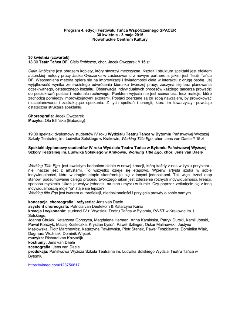 Program 4. edycji Festiwalu Tańca Współczesnego SPACER 30 kwietnia - 3 maja 2015 Nowohuckie Centrum Kultury 30 kwietnia (czwartek) 18:30 Teatr Tańca DF, Ciało limbiczne, chor. Jacek Owczarek // 15 zł Ciało limbiczne jest obrazem kobiety, który stworzył mężczyzna. Kształt i struktura spektakl jest efektem autorskiej metody pracy Jacka Owczarka w zastosowaniu z nowym partnerem, jakim jest Teatr Tańca DF. Wspomniana metoda opiera się na improwizacji i świadomości ciała w interakcji z drugą osobą. Jej wyjątkowość wynika ze swoistego odwrócenia kierunku twórczej pracy, zaczyna się bez planowania oczekiwanego, ostatecznego kształtu. Obserwacja indywidualnych procesów każdego tancerza prowadzi do poszukiwań postaci i materiału ruchowego. Punktem wyjścia nie jest scenariusz, lecz reakcje, które zachodzą pomiędzy improwizującymi aktorami. Postaci zderzane są ze sobą nawzajem, by prowokować niezaplanowane i zaskakujące spotkania. Z tych spotkań i energii, która im towarzyszy, powstaje ostateczna struktura spektaklu. Choreografia: Jacek Owczarek Muzyka: Ola BIlińska (Babadag) 19:30 spektakl dyplomowy studentów IV roku Wydziału Teatru Tańca w Bytomiu Państwowej Wyższej Szkoły Teatralnej im. Ludwika Solskiego w Krakowie, Working Title Ego, chor. Jens van Daele // 15 zł Spektakl dyplomowy studentów IV roku Wydziału Teatru Tańca w Bytomiu Państwowej Wyższej Szkoły Teatralnej im. Ludwika Solskiego w Krakowie, Working Title Ego, chor. Jens van Daele Working Title Ego jest swoistym badaniem siebie w nowej kreacji, którą każdy z nas w życiu przybiera nie inaczej jest z artystami. To wszystko dzieje się etapowo. Wpierw artysta szuka w sobie indywidualności, która w drugim etapie skonfrontuje się z innymi jednostkami. Tak więc, trzeci etap stanowi podsumowanie całego procesu twórczego jakim jest zderzenie różnych indywidualności, kreacji, sposobu myślenia. Ukazuje wpływ jednostki na stan umysłu w tłumie. Czy poprzez zetknięcie się z inną indywidualnością moje "ja" staje się lepsze? Working title Ego jest tworem autorefleksji, niedoskonałości i przyjęcia prawdy o sobie samym. koncepcja, choreografia i reżyseria: Jens van Daele asystent choreografa: Patricia van Deutekom & Katarzyna Kania kreacja i wykonanie: studenci IV r. Wydziału Teatru Tańca w Bytomiu, PWST w Krakowie im. L. Solskiego: Joanna Chułek, Katarzyna Gorczyca, Magdalena Herman, Anna Kamińska, Patryk Durski, Kamil Joński, Paweł Korczyk, Maciej Kosteczka, Krystian Łysoń, Paweł Szlinger, Oskar Malinowski, Justyna Masłowska, Piotr Marchewicz, Katarzyna Pawłowska, Piotr Stanek, Paweł Tyszkiewicz, Dominika Wiak, Dagmara Woźniak, Dominik Więcek muzyka: Richard van Kruysdijk kostiumy: Jens van Daele scenografia: Jens van Daele produkcja: Państwowa Wyższa Szkoła Teatralna im. Ludwika Solskiego Wydział Teatru Tańca w Bytomiu https://vimeo.com/123756617 1 maja (piątek) 19:00 Teatr Tańca Zawirowania, Out in the line up, chor. Nadar Rosano // 15 zł Teatr Tańca Zawirowania, Out in the line up, chor. Nadar Rosano Punktem wyjścia do spektaklu Out in the line up była potrzeba powrotu do pierwotnego, wewnętrznego źródła i bycie lojalnym wobec niego. Dopiero potem możliwe jest poszukiwanie nowych miejsc i nowego języka ciała. Ideą jest, aby kreowany ruch był pierwotny i bezkształtny, by nie miał czystej i uporządkowanej formy, przez co może wydawać się mniej piękny, mniej oczywisty i mniej wydajny. Zanim ukształtuje się forma, gdzieś w przestrzeni pojawia się potencjał. Możliwości, które leżą w zasięgu są niejasne i nieznane. Wiemy jednak, że w pewnym momencie ujawnią się (w różnym stopniu). Co takiego jest w pierwotnym, jeszcze nieznanym, ale świeżym i pełnym potencjału i możliwości odczuwaniu nowo narodzonego dziecka? Czy możemy powrócić do miejsca gdzie czujemy się ograniczeni, gdzie czujemy, że nasz byt i potencjał jest hamowany? A jeśli w pełni nauczymy się akceptować te ograniczenia, to czy możemy pozwolić na to, aby coś z nich powstało? Czy ograniczenie jako potrzeba restrykcyjnej i represyjnej siły jest źródłem cierpienia, lub czy możemy użyć naszych ograniczeń jako siły kreatywnej, która prowadzi nas i określa nasze znaczenie? Czy możemy powrócić do naszych wczesnych lat, odnaleźć te ograniczenia, a potem wybrać je ponownie jako dorośli? Jaka jest cielesna różnica między odczuwaniem w młodości i w późniejszym życiu? Badanie skupia się na różnych wrażeniach i emocjonalnych reakcjach pochodzących z tych ograniczeń, nawet jeśli będzie to prowadzić do nadmiernej stymulacji, apatii, chaosu, spokoju i wielu innych doświadczeń. Będziemy stawiać pytania o indywidualną tożsamość w obrębie relacji międzyludzkich, o rozwój tożsamości, która nie jest jeszcze w pełni uformowana, ale funkcjonuje w bardzo określonej strukturze, o stabilność, równowagę i siłę. Będziemy zanurzać się w czyjeś działania i opory oraz redefiniować okoliczności powstałe w nich. Jakie są cielesne i emocjonalne konsekwencje tego fizycznego badania? Pomysł i choreografia: Nadar Rosano Tancerze: Karolina Kroczak, Bartek Figurski, Szymon Osiński Muzyka: Arvo Part, Har-El Prussky Konsultacja: Włodzimierz Kaczkowski Czas trwania: 40 min Premiera: 25.06.2014 NADAR ROSANO (Izrael) Jego prace prezentowane były w wielu krajach, m.in. w Hiszpanii, na Litwie, Cyprze, w Korei, Portugalii, Niemczech, Polsce, Holandii, Bułgarii Serbii, Rumunii, Szwajcarii. Obecnie mieszka i tworzy w Tel Awiwie (Izrael). Laureat wielu nagród dla tancerzy i choreografów, a wśród nich: drugiej nagrody podczas XXI Międzynarodowego Konkursu Choreograficznego w Hanoverze (Niemcy) oraz podczas Międzynarodowego Konkursu Tańca w Dusseldorfie (Niemcy). Otrzymał wyróżnienie w Międzynarodowym Festiwalu Miniatur Choreograficznych w Belgradzie, był także finalistą konkursu „No Ballet”. Jako peda