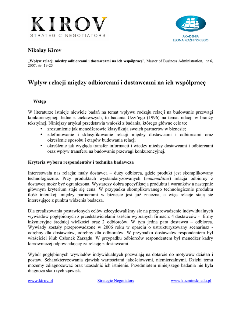 Nikolay Kirov „Wpływ relacji miedzy odbiorcami i dostawcami na ich współpracę”, Master of Business Administration, nr 6, 2007, str. 19-25 Wpływ relacji między odbiorcami i dostawcami na ich współpracę Wstęp W literaturze istnieje niewiele badań na temat wpływu rodzaju relacji na budowanie przewagi konkurencyjnej. Jedne z ciekawszych, to badania Uzzi’ego (1996) na temat relacji w branży tekstylnej. Niniejszy artykuł przedstawia wnioski z badania, którego główne cele to: • zrozumienie jak menedżerowie klasyfikują swoich partnerów w biznesie; • zdefiniowanie i sklasyfikowanie relacji między dostawcami i odbiorcami oraz określenie sposobu i etapów budowania relacji • określenie jak wygląda transfer informacji i wiedzy między dostawcami i odbiorcami oraz wpływ transferu na budowanie przewagi konkurencyjnej. Kryteria wyboru respondentów i technika badawcza Interesowała nas relacja: mały dostawca – duży odbiorca, gdzie produkt jest skomplikowany technologicznie. Przy produktach wystandaryzowanych (commodities) relacja odbiorcy z dostawcą może być ograniczona. Wystarczy dobra specyfikacja produktu i warunków a następnie głównym kryterium staje się cena. W przypadku skomplikowanego technologicznie produktu ilość interakcji między partnerami w biznesie jest już znaczna, a więc relacje stają się interesujące z punktu widzenia badacza. Dla zrealizowania postawionych celów zdecydowaliśmy się na przeprowadzenie indywidualnych wywiadów pogłębionych z przedstawicielami sześciu wybranych firmach: 4 dostawców - firmy inżynieryjne średniej wielkości oraz 2 odbiorców. W tym jedna para dostawca – odbiorca. Wywiady zostały przeprowadzone w 2006 roku w oparciu o ustrukturyzowany scenariusz odrębny dla dostawców, odrębny dla odbiorców. W przypadku dostawców respondentem był właściciel i/lub Członek Zarządu. W przypadku odbiorców respondentem był menedżer kadry kierowniczej odpowiadający za relację z dostawcami. Wybór pogłębionych wywiadów indywidualnych pozwalają na dotarcie do motywów działań i postaw. Scharakteryzowania zjawisk wartościami jakościowymi, niemierzalnymi. Dzięki temu możemy zdiagnozować oraz uzasadnić ich istnienie. Przedmiotem niniejszego badania nie była diagnoza skali tych zjawisk. www.kirov.pl Strategic Negotiators www.kozminski.edu.pl Wyniki analiz Relacja – definicja respondenta Podstawową trudnością, na jaką napotkali respondenci przy próbie scharakteryzowania relacji, była sama definicja relacji. Najczęściej intuicyjnie wiązano ją z charakterem związku, jaki istnieje między własną firmą a dostawcą/odbiorcą ¡ Relacje formalne ¡ Relacje nieformalne. Z wywiadów wynika, że relacja formalna może być odbierana jako oficjalna lub nieoficjalna. Ten podział jest wynikiem subiektywnego odczucia wynikającego z miejsca gdzie rozmowa jest prowadzona jak i tonu głosu lub samej wypowiedzi. Respondenci określali relacje również poprzez definicję roli firmy w procesie handlowym ¡ odbiorca ¡ dostawca ¡ kooperant Charakterystyka relacji związanych z rolą firmy w procesie handlowym Zgodnie z założeniami badania, rozmowy prowadzono w firmach określanymi jako dostawcy bądź odbiorcy danych produktów/usług. We wszystkich wywiadach respondenci podkreślali, że nie można patrzeć na relacje przez pryzmat „ja dostawca”, „ja odbiorca”. Realnie każda z firm pełniła w procesie dualną rolę – jest w jakiejś skali zarówno dostawcą, jak i odbiorcą. Będąc ogniwem w łańcuchu wzajemnych relacji firmy wyraźniej widzą swoje relacje z klientem (odbiorcą), niż swoje jako klienta z dostawcami. Można zauważyć, że ważniejsza i bardziej zauważalna dla menedżerów jest rola jaką pełnią ich firmy jako dostawcy. Warto w tym miejscu podkreślić, że termin „klient’ jest w zasadzie utożsamiany z odbiorcą produktów, bądź usług. Nie zajmowałem się relacjami z klientami wewnętrznymi organizacji. www.kirov.pl Strategic Negotiators www.kozminski.edu.pl Silniejszy kierunek zabiegania o dobrą relacje jest od dostawcy do odbiorcy. Źródło: opracowanie własne Charakterystyka relacji związanych z charakterem związku między dostawcą a odbiorcą Według respondentów, formalne relacje między odbiorcami a dostawcami stanowią podstawową i akceptowaną przez obie strony formę współpracy. Zasady tych relacji wyznaczają ogólnie wymagania savoir vivre’u. Utrzymywaniu formalnych relacji sprzyja brak wzajemnych doświadczeń i współpracy między stronami (lub niewystarczający zakres kompetencji między pracownikami stron). Niektóre firmy nigdy nie wychodzą poza granice formalnych relacji. Menedżerowie podkreślali, że z jednej strony związane jest to z dążeniem do zachowania transparentności współpracy – firmy chcą się zabezpieczać przed posądzeniem o czerpanie korzyści materialnych w zamian za preferencyjne traktowanie dostawców. Z drugiej strony to obrona przed wykorzystywaniem relacji nieformalnych w biznesie, które mogą szkodzić firmie (np. prośby o niekończącą się prolongatę płatności). Nigdy nie przechodzę z dostawcą na „ty”! Możemy się znać wiele lat i być w bardzo zażyłych relacjach. Ale jest to dostawca! Formalna relacja jest bezpieczniejsza. Odbiorca 1 www.kirov.pl Strategic Negotiators www.kozminski.edu.pl Dla innych, nieformalne relacje stanowią naturalną konsekwencję długofalowej współpracy między stronami. To dowód zaufania stron. Z jednym dostawcą się współpracuje na zasadzie, że na telefon i niemalże na gębę, prawda? Bo sobie wierzymy, bo się jakoś tam znamy i dogadujemy. No, a z niektórymi dostawcami muszą być bardzo formalne rzeczy, bo dwaj kontrahenci się np. nie znają, albo nie ufają sobie, albo zakres pracy jest na tyle wysoki, że wymaga sformalizowania. Lub też osoby współpracujące z obu stron nie mają wystarczającego poziomu autoryzacji. Odbio