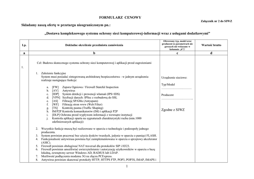 FORMULARZ CENOWY Załącznik nr 2 do SIWZ Składamy naszą ofertę w przetargu nieograniczonym pn.: „Dostawa kompleksowego systemu ochrony sieci komputerowej-informacji wraz z usługami dodatkowymi” Lp. Dokładne określenie przedmiotu zamówienia Oferowany typ, model oraz producent (o parametrach nie gorszych niż wskazane w kolumnie „b”)* a b c Cel: Budowa skutecznego systemu ochrony sieci komputerowej i aplikacji przed zagrożeniami 1. 1. Założenie funkcyjne System musi posiadać zintegrowaną architekturę bezpieczeństwa - w jednym urządzeniu realizuje następujące funkcje: a. b. c. d. e. f. g. h. i. j. 2. 3. 4. 5. 6. 7. 8. [FW] Zapora Ogniowa / Firewall Stateful Inspection [AV] Antywirus [IDP] System detekcji i prewencji włamań (IPS+IDS) [VPN] Szyfracji danych: IPSec z rozbudową do SSL [AS] Filtrację SPAMu (Antyspam) [WF] Filtrację stron www (Web Filter) [TS] Kontrolę pasma (Traffic Shaping) IM/P2P Kontrola komunikatorów (IM) i aplikacji P2P [DLP] Ochrona przed wypływem informacji z wewnątrz instytucji Kontrola aplikacji oparta na sygnaturach charakterystyki ruchu (min.1000 zdefiniowanych aplikacji) Wszystkie funkcje muszą być realizowane w oparciu o technologie i podzespoły jednego producenta. System powinien pracować bez użycia dysków twardych, jedynie w oparciu o pamięci FLASH. Funkcjonalność antywirusa powinna być zaimplementowana w oparciu o sprzętowy akcelerator (ASIC). Firewall powinien obsługiwać NAT traversal dla protokołów SIP i H323. Firewall powinien umożliwiać uwierzytelnienie i autoryzację użytkowników w oparciu o bazę lokalną, zewnętrzny serwer Windows AD, RADIUS lub LDAP. Możliwość podłączenia modemu 3G na złączu PCExpress. Antywirus powinien skanować protokoły HTTP, HTTPS FTP, POP3, POP3S, IMAP, IMAPS i 1 Urządzenie sieciowe: Typ/Model ………………………… Producent ………………………….. Zgodne z SIWZ Wartość brutto d 9. 10. 11. 12. 13. 14. 15. 16. 17. 18. 19. 20. 21. 22. 23. 24. 25. 26. 27. SMTP, SMTPS, IM, NNTP Antywirus powinien móc transferować częściowo przeskanowany plik do klienta w celu zapobieżenia przekroczeniu dopuszczalnego czasu oczekiwania (timeout) Antywirus powinien skanować zarówno na bazie sygnatur jak i heurystycznie Urządzenie powinno obsługiwać NAT Traversal dla VPN Producent powinien móc dostarczyć klienta VPN dla systemu Windows 2000 / XP / XP 64 Bit / Vista / Vista 64 Bit / Seven / Seven 64Bit / Server / Server 64 Bit / Mobile / Symbian, własnej produkcji wyposażonego dodatkowo w moduł firewall wraz z filtrem antywirusowym, antyspamowym oraz filtracji kategorii treści WWW. Urządzenie powinno móc być klientem usług dynamicznego DNS’u. Zawarty moduł antyspamowy powinien pracować w obrębie protokołów SMTP, POP3 i IMAP. Antyspam powinien bazować na wielu czynnikach, takich jak: a. sprawdzenie zdefiniowanych przez administratora adresów IP przez które przechodził mail, b. sprawdzenie zdefiniowanych przez administratora adresów pocztowych, c. RBL, ORDBL d. Sprawdzenie treści pod kątem zadanych przez administratora słów kluczowych. Oprócz powyższego mechanizm antyspamowy powinien umożliwiać skorzystanie z zewnętrznej, wieloczynnikowej bazy spamu. Moduł filtracji stron www powinien mieć możliwość filtracji: a. na bazie białej i czarnej listy URL, b. w oparciu o zawarte w stronie słowa kluczowe z możliwością określania wag, c. javy, cookies i ActiveX Oprócz powyższego moduł filtracji powinien umożliwiać kategoryzację w oparciu o gotową bazę przynajmniej 54 mln już skategoryzowanych stron www, pogrupowanych w 77 kategorii, 6 klas treści oraz umożliwiać kategoryzację ręczną. Wszystkie moduły programowe i funkcje powinny pochodzić od jednego producenta. Urządzenie powinno dawać możliwość ustawienia trybu pracy jako router warstwy trzeciej lub jako bridge warstwy drugiej. Urządzenie powinno wspierać konfigurację wysokiej dostępności w klastrach do 32 nodów zarówno w trybie Active-Active jak i Active-Standby w obu trybach (p. 19) Urządzenie powinno wspierać routing statyczny i dynamiczny w oparciu o protokoły RIP, OSPF, BGP4, PIM Urządzenie powinno wspierać policy routing w oparciu o adres źródła, porty, interface wejściowy Urządzenie powinno wspierać różne poziomy i domeny uprawnień dla administratorów Dla urządzenia powinno być dostępne zewnętrzne sprzętowe urządzenie logujące pochodzące od tego samego producenta Dla urządzenia powinna być dostępna zewnętrzna sprzętowa platforma centralnego zarządzania pochodząca od tego samego producenta System powinien umożliwiać aktualizację oprogramowania oraz zapisywanie i odtwarzanie konfiguracji z dowolnej pamięci USB. 2 28. Założenia dodatkowe – serwis, szkolenia, wdrożenie i gwarancja: a. gwarancja 12 miesięcy z możliwością rozszerzenia gwarancji o kolejne lata w ramach corocznego zakupu subskrypcji, b. subskrypcje oprogramowania i serwisu na okres: 12 miesięcy; c. serwis logistyczny na terenie Polski z dostawą urządzenia zastępczego na drugi dzień roboczy od chwili zgłoszenia awarii – 7x24; d. Wykonawca musi zagwarantować wsparcie techniczne z usunięciem usterki konfiguracyjnej do 3 h od momentu zgłoszenia; e. Wykonawca musi posiadać system pomocy typu: HELPDESK; f. Wykonawca zamontuje urządzenie, przeprowadzi wdrożenie, konfigurację oraz szkolenie w języku polskim na poziomie profesjonalnym w siedzibie Zamawiającego z zakresu obsługi i konfiguracji systemu. g. Autoryzowane szkolenie z kompleksowej ochrony sieci z wykorzystywaniem oferowanego urządzenia w siedzibie Wykonawcy. System powinien ponadto spełniać następujące minimalne parametry techniczne: 1. Minimalna liczba niezależnych portów Ethernet 10/100 powinna wynosić sześć (6) 2. Minimalna liczba niezależnych portów Ethernet 10/100/1000 powinna wynosić dwa (2) 3. Minimalna przepustowość Firewall-a powinna wynosić 350,00 Mbps