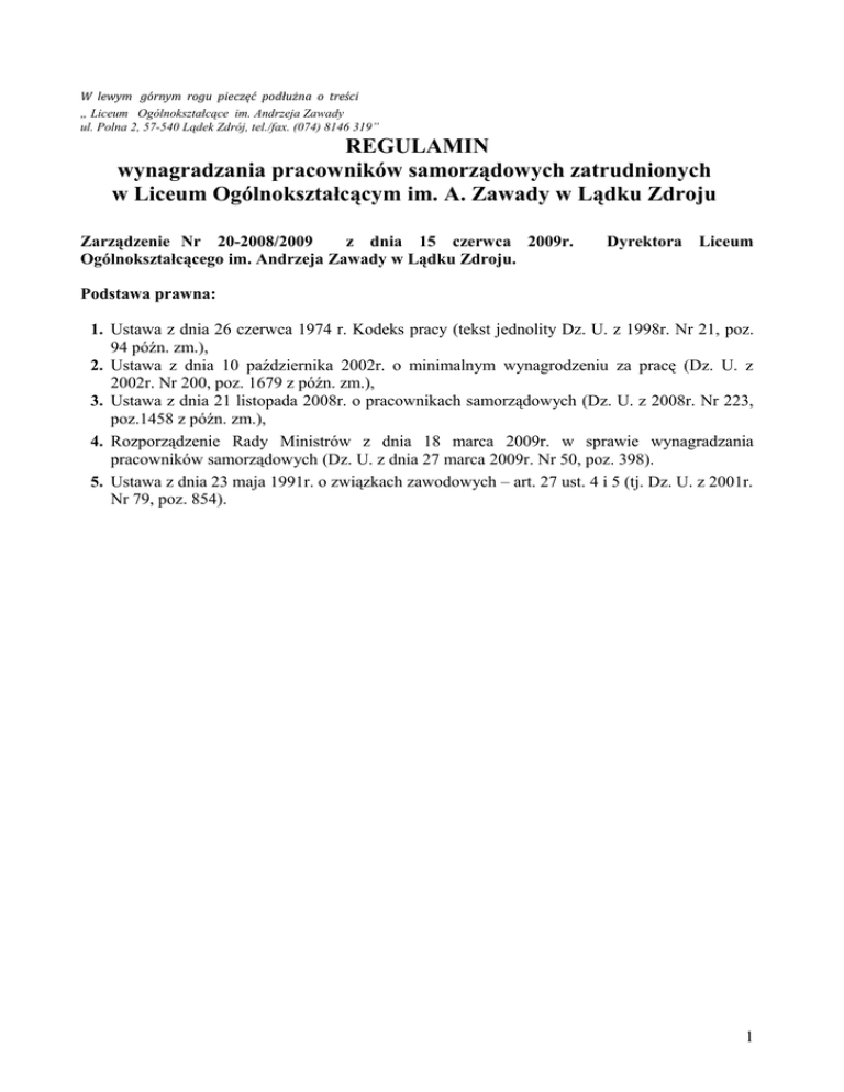 W lewym górnym rogu pieczęć podłużna o treści „ Liceum Ogólnokształcące im. Andrzeja Zawady ul. Polna 2, 57-540 Lądek Zdrój, tel./fax. (074) 8146 319” REGULAMIN wynagradzania pracowników samorządowych zatrudnionych w Liceum Ogólnokształcącym im. A. Zawady w Lądku Zdroju Zarządzenie Nr 20-2008/2009 z dnia 15 czerwca 2009r. Ogólnokształcącego im. Andrzeja Zawady w Lądku Zdroju. Dyrektora Liceum Podstawa prawna: 1. Ustawa z dnia 26 czerwca 1974 r. Kodeks pracy (tekst jednolity Dz. U. z 1998r. Nr 21, poz. 94 późn. zm.), 2. Ustawa z dnia 10 października 2002r. o minimalnym wynagrodzeniu za pracę (Dz. U. z 2002r. Nr 200, poz. 1679 z późn. zm.), 3. Ustawa z dnia 21 listopada 2008r. o pracownikach samorządowych (Dz. U. z 2008r. Nr 223, poz.1458 z późn. zm.), 4. Rozporządzenie Rady Ministrów z dnia 18 marca 2009r. w sprawie wynagradzania pracowników samorządowych (Dz. U. z dnia 27 marca 2009r. Nr 50, poz. 398). 5. Ustawa z dnia 23 maja 1991r. o związkach zawodowych – art. 27 ust. 4 i 5 (tj. Dz. U. z 2001r. Nr 79, poz. 854). 1 SPIS TREŚCI ROZDZIAŁ I Przepisy ogólne...........................................................................str. 3 - 4 ROZDZIAŁ II Ochrona wynagrodzenia za pracę............................................str. 4 ROZDZIAŁ III Pieniężne świadczenia związane z pracą .................................str. 4 - 6 ROZDZIAŁ IV Wynagrodzenie zasadnicze.......................................................str. 6 ROZDZIAŁ V Dodatki płacowe obligatoryjne ...............................................str. 7 - 9 ROZDZIAŁ VI Fakultatywne świadczenia związane z pracą .........................str.10-12 ROZDZIAŁ VII Wynagrodzenia za czas niewykonywania pracy.....................str.12 ROZDZIAŁ VIII Sposoby i terminy wypłaty świadczeń pieniężnych ................str.12-13 ROZDZIAŁ IX Postanowienia końcowe.............................................................str.13 2 ROZDZIAŁ I Przepisy ogólne §1 1. Regulamin wynagradzania pracowników samorządowych zatrudnionych w Liceum Ogólnokształcącym im. Andrzeja Zawady w Lądku Zdroju, zwany dalej Regulaminem, określa: 1) wykaz stanowisk, w tym stanowisk kierowniczych urzędniczych, pomocniczych i obsługi w Liceum Ogólnokształcącym im. A. Zawady w Lądku Zdroju, 2) minimalne wymagania kwalifikacyjne niezbędne do wykonywania pracy na poszczególnych stanowiskach; 3) minimalny poziom wynagrodzenia zasadniczego dla pracowników nie będących nauczycielami zatrudnionymi w szkole 4) maksymalny poziom wynagrodzenia zasadniczego; 5) warunki przyznawania oraz warunki i sposób wypłacania premii i nagród innych niż nagroda jubileuszowa; 6) zasady naliczania nagród jubileuszowych; 7) zasady i sposób przyznawania dodatków funkcyjnych. §2 1. Ilekroć w regulaminie jest mowa o: 1) dyrektorze – należy przez to rozumieć Dyrektora Liceum Ogólnokształcącego im. A. Zawady w Lądku Zdroju; 2) pracowniku samorządowym – należy przez to rozumieć pracownika zatrudnionego na podstawie umowy o pracę w szkole na stanowiskach innych niż pedagogiczne; 3) szkole – należy przez to rozumieć Liceum Ogólnokształcące im. Andrzeja Zawady w Lądku Zdroju 4) rozporządzeniu płacowym – należy przez to rozumieć Rozporządzenie Rady Ministrów z dnia 18 marca 2009r. (Dz. U. Nr 50, poz. 398); 5) zakładowej organizacji zawodowej – należy przez to rozumieć związek zawodowy lub jednostkę organizacyjną związku zawodowego działające w szkole, którym przysługują uprawnienia zakładowej organizacji związkowej; 6) wynagrodzeniu – rozumie się przez to wypłaty na rzecz pracowników z tytułu wykonywanej pracy, z wyłączeniem świadczeń z ubezpieczenia społecznego, świadczeń z tytułu diet, odszkodowań i innych tytułów nie zaliczanych do wynagrodzeń; 7) najniższym wynagrodzeniu zasadniczym – należy przez to rozumieć najniższe wynagrodzenie zasadnicze w I kategorii zaszeregowania określone w zał. nr 1, część B do Rozporządzenia Rady Ministrów z dnia 18 marca 2009r. (Dz. U. Nr 50, poz. 398), tj. kwotę 1100 zł (słownie: jeden tysiąc sto złotych); 8) ustawie – należy przez to rozumieć ustawę z dnia 21 listopada 2008r. o pracownikach samorządowych (Dz. U. z 2008r., Nr 223, poz. 1458); 3 9) ustawa o ochronie danych osobowych – należy przez to rozumieć ustawę z dnia 29 sierpnia 1997r. o ochronie danych osobowych (Dz. U. Nr 133, poz. 883). §3 1. Przed dopuszczeniem do pracy pracownik zostaje zapoznany z Regulaminem wynagradzania przez bezpośredniego przełożonego. Oświadczenie o zapoznaniu się z Regulaminem włącza się do akt osobowych. ROZDZIAŁ II Ochrona wynagrodzenia za pracę §4 1. Pracownik nie może zrzec się prawa do wynagrodzenia, ani przenieść tego prawa na inną osobę. 2. Sposób wypłaty wynagrodzenia musi być zorganizowany w sposób zabezpieczający przestrzeganie przepisów ustawy o ochronie danych osobowych. 3. Z wynagrodzenia za pracę – po odliczeniu składek na ubezpieczenia społeczne oraz zaliczki na podatek dochodowy od osób fizycznych, podlegają potrąceniu tylko następujące należności: 1) sumy egzekwowane na mocy tytułów wykonawczych na zaspokojenie świadczeń alimentacyjnych; 2) sumy egzekwowane na mocy tytułów wykonawczych na pokrycie należności innych niż świadczenia alimentacyjne; 3) zaliczki pieniężne udzielane pracownikowi; 4) kary pieniężne przewidziane w art. 108 ustawy – Kodeks pracy. 4. Potrącenia mogą być dokonywane w następujących granicach: 1) w razie egzekucji świadczeń alimentacyjnych – do wysokości 3/5 wynagrodzenia; 2) w razie egzekucji innych należności lub potrącenia zaliczek pieniężnych – do ½ wynagrodzenia. 5. Nagrody z zakładowego funduszu nagród, dodatkowe wynagrodzenie roczne podlegają egzekucji na zaspokojenie świadczeń alimentacyjnych do pełnej wysokości. 6. Z wynagrodzenia za pracę odlicza się w pełnej wysokości kwoty