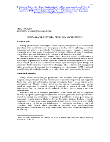 221 I. Staniec, A. Zakrzewska – Bielawska, Zarządzanie ryzykiem -moda czy konieczność? [w:] D. Zarzecki (red.),Zarządzanie finansami. Zarządzanie ryzykiem i kreowanie wartości, Zeszyt Naukowy nr 455 Uniwersytetu Szczecińskiego, Prace Instytutu Ekonomiki i Organizacji Przedsiębiorstw nr 50, Szczecin 2007, s. 221- 227. IWONA STANIEC AGNIESZKA ZAKRZEWSKA-BIELAWSKA ZARZĄDZANIE RYZYKIEM MODA CZY KONIECZNOŚĆ1 Wprowadzenie Procesy globalizacyjne zachodzące z coraz większą intensywnością we współczesnej gospodarce oraz rozszerzenie Unii Europejskiej w istotny sposób wpływają na warunki funkcjonowania państw i gospodarek. Wynikające stąd zmiany otoczenia biznesowego wymuszają stosowanie przez przedsiębiorstwa bardziej efektywnych metod zarządzania zapewniających sprostaniu konkurencji a tym samym ich dalszemu rozwojowi. Ekonomiści nie mogą pozostać obojętni wobec rosnących potrzeb przedsiębiorstw w obliczu tak ogromnych zmian. Pojawia się więc konieczność wprowadzenia nowych modeli biznesowych poprzedzonych wieloma analizami, badaniami i konfrontacjami wielu czasami bardzo różnych opinii, w celu ukształtowania obiektywnych, naukowych sądów. Jedną z nich jest ostatnio bardzo silnie lansowana w Polsce koncepcja ERM (enterprise risk management). Celem prezentowanych rozważań jest stwierdzenie, czy wprowadzenie ERM w polskich przedsiębiorstwach jest koniecznością, czy wynika tylko z mody stosowania tej koncepcji. Zarządzanie ryzykiem Jedną z funkcji zarządzania jest planowanie, czyli określenie celów, jakie firma chce osiągnąć, strategii i taktyki działania, a także czasu, w jakim te cele powinny być osiągnięte. Zatem planowanie jest instrumentem rozwoju nowoczesnej firmy i swego rodzaju polisą ubezpieczeniową. Chroni bowiem przed podejmowaniem nieuzasadnionego ryzyka, umożliwia przetrwanie w trudnych czasach i ekspansję w lepszych okresach. Określa postępowanie firmy w pewnym okresie, pokazuje jej słabe i mocne strony w otoczeniu gospodarczym. Przyszłości nie da się dokładnie przewidzieć, zatem istotne jest aby w zarządzaniu pojawiły się aspekty ograniczające niepewności, umożliwiające ocenę prawdopodobieństwa przyszłych zdarzeń oraz rozpoznanie występujących problemów, a także pozwalające na zmniejszenie ryzyka podjęcia błędnych decyzji. Naprzeciw takiemu działaniu wychodzi zarządzanie ryzykiem, które polega na przyjęciu strategii rozwoju i stworzeniu przewodnika z informacjami o tym, jak ma ona funkcjonować przy zaistnieniu określonych sytuacji lub czynników. Pełni funkcję planu operacyjnego, narzędzia pracy przedstawiającego perspektywiczne i odcinkowe cele firmy z określeniem zadań, oraz środków niezbędnych do ich realizacji. 1 Praca naukowa finansowana ze środków na naukę w latach 2006-2008 jako projekt badawczy MNiSW N115 042 31/1777. 222 I. Staniec, A. Zakrzewska – Bielawska, Zarządzanie ryzykiem -moda czy konieczność? [w:] D. Zarzecki (red.),Zarządzanie finansami. Zarządzanie ryzykiem i kreowanie wartości, Zeszyt Naukowy nr 455 Uniwersytetu Szczecińskiego, Prace Instytutu Ekonomiki i Organizacji Przedsiębiorstw nr 50, Szczecin 2007, s. 221- 227. Szczegółowe rozpoznanie charakteru, zakresu i wielkości potencjalnego ryzyka pozwala na podjęcie w odpowiednim czasie czynności zapobiegawczych pozwalających ograniczyć ryzyko do poziomu pożądanego tj. neutralizacji niektórych rodzajów ryzyka, bądź minimalizacji jego skutków. Pozwala też na podejmowanie ryzyka w dopuszczalnych granicach. Celem zarządzania ryzykiem w przedsiębiorstwach jest m.in.: 2 • wskazanie źródeł ryzyka (ustalenie możliwych obszarów występowania ryzyka i jego rodzajów), • pomiar ryzyka, • wypracowanie odpowiednich strategii, które miałyby na celu zabezpieczenie przed niektórymi rodzajami ryzyka. W zarządzaniu ryzykiem ważne jest, aby dobrana koncepcja była odpowiednia do danych warunków. Bardzo ważnym elementem jest ustalenie odpowiedzialności menedżerów za kierowanie danymi obszarami przedsiębiorstwa. Centralnym elementem zarządzania strategicznego każdego przedsiębiorstwa powinien być proces zarządzania ryzykiem, w ramach którego organizacja w sposób metodyczny rozwiązuje problemy z nim związane. Należy robić to w taki sposób, aby ta działalność – zarówno w poszczególnych dziedzinach jak i traktowana jako całość – przynosiła trwałe korzyści. Celem zarządzania ryzykiem jest zapewnienie maksymalnych trwałych korzyści we wszelkich dziedzinach działalności przedsiębiorstwa, zaś przedmiotem prawidłowego zarządzania ryzykiem jest jego identyfikacja a także podejmowanie względem niego właściwych działań. Uwzględnia się tutaj zrozumienie potencjalnych pozytywnych i negatywnych skutków oddziaływania wszelkich czynników, które mogą mieć wpływ na przedsiębiorstwo, a także działania na rzecz zwiększenia prawdopodobieństwa sukcesu oraz zmniejszenia prawdopodobieństwa porażki i niepewności co do osiągnięcia przez przedsiębiorstwo zakładanych celów. Zarządzanie ryzykiem3 powinno być procesem ciągłym i stale udoskonalanym, który obejmuje zarówno strategię organizacji jak i procedury wdrażania tej strategii. Dodatkowo wszelkie kwestie związane z zagrożeniami dla działalności przedsiębiorstwa, jakie miały miejsce w przeszłości, występują obecnie i – w największym stopniu – mogą wystąpić w przyszłości, powinno być rozwiązywane w sposób metodyczny. Oczywiście podstawowym elementem zarządzania ryzykiem jest zabezpieczenie przed jego skutkami. W związku z tym jednostka gospodarcza może przyjmować dwojakiego rodzaju postawy:4 • aktywną, która polega na podejmowaniu działań, których celem jest wyeliminowanie lub ograniczenie straty, która mogłaby powstać w wyniku przeprowadzonych transakcji, • pasywną, czyli bierne ponoszenie ryzyka, przejawiająca się w braku podejmowania pr