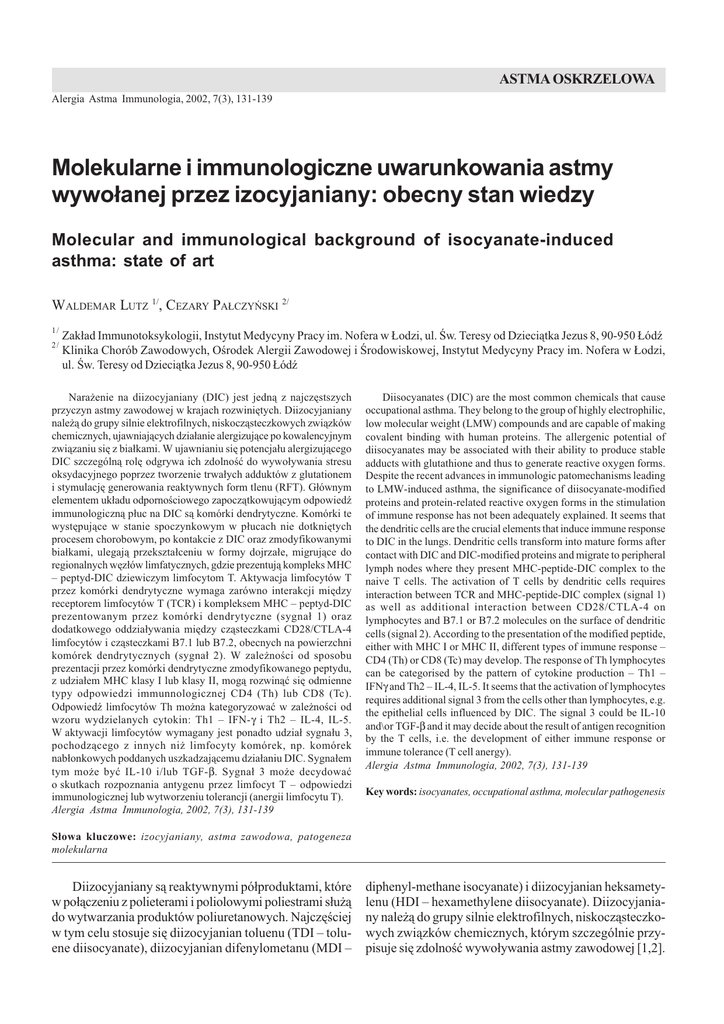 Lutz W., Pa³czyñski C. Molekularne i immunologiczne uwarunkowania astmy wywo³anej przez izocyjaniany ... 131 ASTMA OSKRZELOWA Alergia Astma Immunologia, 2002, 7(3), 131-139 Molekularne i immunologiczne uwarunkowania astmy wywo³anej przez izocyjaniany: obecny stan wiedzy Molecular and immunological background of isocyanate-induced asthma: state of art WALDEMAR LUTZ 1/, CEZARY PA£CZYÑSKI 2/ 1/ 2/ Zak³ad Immunotoksykologii, Instytut Medycyny Pracy im. Nofera w £odzi, ul. w. Teresy od Dzieci¹tka Jezus 8, 90-950 £ód Klinika Chorób Zawodowych, Orodek Alergii Zawodowej i rodowiskowej, Instytut Medycyny Pracy im. Nofera w £odzi, ul. w. Teresy od Dzieci¹tka Jezus 8, 90-950 £ód Nara¿enie na diizocyjaniany (DIC) jest jedn¹ z najczêstszych przyczyn astmy zawodowej w krajach rozwiniêtych. Diizocyjaniany nale¿¹ do grupy silnie elektrofilnych, niskocz¹steczkowych zwi¹zków chemicznych, ujawniaj¹cych dzia³anie alergizuj¹ce po kowalencyjnym zwi¹zaniu siê z bia³kami. W ujawnianiu siê potencja³u alergizuj¹cego DIC szczególn¹ rolê odgrywa ich zdolnoæ do wywo³ywania stresu oksydacyjnego poprzez tworzenie trwa³ych adduktów z glutationem i stymulacjê generowania reaktywnych form tlenu (RFT). G³ównym elementem uk³adu odpornociowego zapocz¹tkowuj¹cym odpowied immunologiczn¹ p³uc na DIC s¹ komórki dendrytyczne. Komórki te wystêpuj¹ce w stanie spoczynkowym w p³ucach nie dotkniêtych procesem chorobowym, po kontakcie z DIC oraz zmodyfikowanymi bia³kami, ulegaj¹ przekszta³ceniu w formy dojrza³e, migruj¹ce do regionalnych wêz³ów limfatycznych, gdzie prezentuj¹ kompleks MHC peptyd-DIC dziewiczym limfocytom T. Aktywacja limfocytów T przez komórki dendrytyczne wymaga zarówno interakcji miêdzy receptorem limfocytów T (TCR) i kompleksem MHC peptyd-DIC prezentowanym przez komórki dendrytyczne (sygna³ 1) oraz dodatkowego oddzia³ywania miêdzy cz¹steczkami CD28/CTLA-4 limfocytów i cz¹steczkami B7.1 lub B7.2, obecnych na powierzchni komórek dendrytycznych (sygna³ 2). W zale¿noci od sposobu prezentacji przez komórki dendrytyczne zmodyfikowanego peptydu, z udzia³em MHC klasy I lub klasy II, mog¹ rozwin¹æ siê odmienne typy odpowiedzi immunnologicznej CD4 (Th) lub CD8 (Tc). Odpowied limfocytów Th mo¿na kategoryzowaæ w zale¿noci od wzoru wydzielanych cytokin: Th1 IFN-γ i Th2 IL-4, IL-5. W aktywacji limfocytów wymagany jest ponadto udzia³ sygna³u 3, pochodz¹cego z innych ni¿ limfocyty komórek, np. komórek nab³onkowych poddanych uszkadzaj¹cemu dzia³aniu DIC. Sygna³em tym mo¿e byæ IL-10 i/lub TGF-β. Sygna³ 3 mo¿e decydowaæ o skutkach rozpoznania antygenu przez limfocyt T odpowiedzi immunologicznej lub wytworzeniu tolerancji (anergii limfocytu T). Alergia Astma Immunologia, 2002, 7(3), 131-139 Diisocyanates (DIC) are the most common chemicals that cause occupational asthma. They belong to the group of highly electrophilic, low molecular weight (LMW) compounds and are capable of making covalent binding with human proteins. The allergenic potential of diisocyanates may be associated with their ability to produce stable adducts with glutathione and thus to generate reactive oxygen forms. Despite the recent advances in immunologic patomechanisms leading to LMW-induced asthma, the significance of diisocyanate-modified proteins and protein-related reactive oxygen forms in the stimulation of immune response has not been adequately explained. It seems that the dendritic cells are the crucial elements that induce immune response to DIC in the lungs. Dendritic cells transform into mature forms after contact with DIC and DIC-modified proteins and migrate to peripheral lymph nodes where they present MHC-peptide-DIC complex to the naive T cells. The activation of T cells by dendritic cells requires interaction between TCR and MHC-peptide-DIC complex (signal 1) as well as additional interaction between CD28/CTLA-4 on lymphocytes and B7.1 or B7.2 molecules on the surface of dendritic cells (signal 2). According to the presentation of the modified peptide, either with MHC I or MHC II, different types of immune response CD4 (Th) or CD8 (Tc) may develop. The response of Th lymphocytes can be categorised by the pattern of cytokine production Th1 IFNγ and Th2 IL-4, IL-5. It seems that the activation of lymphocytes requires additional signal 3 from the cells other than lymphocytes, e.g. the epithelial cells influenced by DIC. The signal 3 could be IL-10 and\or TGF-β and it may decide about the result of antigen recognition by the T cells, i.e. the development of either immune response or immune tolerance (T cell anergy). Alergia Astma Immunologia, 2002, 7(3), 131-139 Key words: isocyanates, occupational asthma, molecular pathogenesis S³owa kluczowe: izocyjaniany, astma zawodowa, patogeneza molekularna Diizocyjaniany s¹ reaktywnymi pó³produktami, które w po³¹czeniu z polieterami i poliolowymi poliestrami s³u¿¹ do wytwarzania produktów poliuretanowych. Najczêciej w tym celu stosuje siê diizocyjanian toluenu (TDI toluene diisocyanate), diizocyjanian difenylometanu (MDI diphenyl-methane isocyanate) i diizocyjanian heksametylenu (HDI hexamethylene diisocyanate). Diizocyjaniany nale¿¹ do grupy silnie elektrofilnych, niskocz¹steczkowych zwi¹zków chemicznych, którym szczególnie przypisuje siê zdolnoæ wywo³ywania astmy zawodowej [1,2]. 132 Alergia Astma Immunologia, 2002, 7(3), 131-139 S¹ powszechnie wykorzystywane w przemys³ach samochodowym (produkcja elementów z tworzyw sztucznych, lakierowanie), budowlanym (materia³y uszczelniaj¹ce) i odlewniczym (g³ównie stali). Bardzo istotnym, tak¿e pozazawodowym ród³em nara¿enia na te zwi¹zki s¹ lakiery w aerozolach. W USA roczne zu¿ycie diizocyjanianów przekracza 2 miliony ton, a liczebnoæ populacji zawodowo eksponowanej ocenia siê na ok. 200 000 osób [3]. Nara¿enie na diizocyjaniany jest jedn¹ z najczêstszych przyczyn astmy zawodowej w krajach rozwiniêtych, w tym tak¿e w 