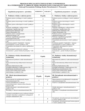 PROGRAM SPECJALISTYCZNEGO KURSU ZAWODOWEGO DLA POŚREDNIKÓW W OBROCIE NIERUCHOMOŚCIAMI I ZARZĄDCÓW NIERUCHOMOŚCI Federacji Porozumienie Polskiego Rynku Nieruchomości w Warszawie Zagadnienia programowe - pośrednicy POŚREDNICY I. Podstawy wiedzy z zakresu prawa 16 godz. Podstawy prawa cywilnego w teorii i praktyce (2h) Podstawy prawa rzeczowego w teorii i praktyce (2h) Podstawy prawa zobowiązań w teorii i praktyce (2h) Wybrane zagadnienia z zakresu prawa rodzinnego i spadkowego (1h) Ochrona praw lokatorów (1h) Najem okazjonalny (1h) Podstawy prawa i postępowania administracyjnego (1h) Wybrane zagadnienia gospodarki nieruchomościami (4h) Gospodarka przestrzenna w teorii i praktyce (1h) Ewidencja gruntów i budynków - kataster nieruchomości w teorii i praktyce (1h) Gospodarka mieszkaniowa i prawo spółdzielcze (1h) Ochrona danych osobowych, ochrona konsumenta i „pranie brudnych pieniędzy” (1h) Wprowadzenie do problematyki obrotu nieruchomościami (1h) Umowa pośrednictwa w obrocie nieruchomościami i niedozwolone klauzule umowne (2h) Źródła informacji o nieruchomościach w praktyce (1h) Procedury w obrocie nieruchomościami (2h) Podstawy prawa cywilnego w teorii i praktyce (2h) Podstawy prawa rzeczowego w teorii i praktyce (2h) Podstawy prawa zobowiązań w teorii i praktyce (2h) Wybrane zagadnienia z zakresu prawa rodzinnego i spadkowego (1h) Ochrona praw lokatorów (1h) Najem okazjonalny (1h) Podstawy prawa i postępowania administracyjnego (1h) Wybrane zagadnienia gospodarki nieruchomościami (4h) Gospodarka przestrzenna w teorii i praktyce (1h) Ewidencja gruntów i budynków - kataster nieruchomości w teorii i praktyce (1h) Gospodarka mieszkaniowa i prawo spółdzielcze (1h) Ochrona danych osobowych, ochrona konsumenta i „pranie brudnych pieniędzy” (1h) 1 1 1 1 1 1 4 1 1 1 1 II. Podstawy wiedzy ekonomicznej i technicznej 8 godz. Ekonomiczne podstawy rynku nieruchomości (1h) Ocena ekonomicznej efektywności inwestycji (2h) Podstawy budownictwa (2h) Przegląd technologii w budownictwie (1h) Eksploatacja nieruchomości (1h) Ocena stanu technicznego obiektu budowlanego w praktyce (1h) Zagadnienia programowe - zarządcy I. Podstawy wiedzy z zakresu prawa 2 II. Podstawy wiedzy ekonomicznej i technicznej III. Obrót nieruchomościami w praktyce ZARZĄDCY Ekonomiczne podstawy rynku nieruchomości (1h) Ocena ekonomicznej efektywności inwestycji (2h) Podstawy budownictwa (2h) Przegląd technologii w budownictwie (1h) Eksploatacja nieruchomości (1h) Ocena stanu technicznego obiektu budowlanego w praktyce (1h) 1 2 2 1 1 1 18 godz. 18 godz. 1 1 2 1 III. Zarządzanie nieruchomościami w praktyce Wprowadzenie do problematyki zarządzania nieruchomościami (1h) Umowa o zarządzanie nieruchomościami (1h) Źródła informacji o nieruchomościach w praktyce (1h) Procedury w zarządzaniu nieruchomościami (2h) 1 2 Czynności pośrednictwa przy realizacji różnych rodzajów transakcji z poznaniem wymaganych rodzajów dokumentów (5h) 5 - --- --- - 4 --- - 2 Zarządzanie nieruchomościami mieszkalnymi w teorii i praktyce (4h) Zarządzanie nieruchomościami komercyjnymi w teorii i praktyce (2h) PROGRAM SPECJALISTYCZNEGO KURSU ZAWODOWEGO DLA POŚREDNIKÓW W OBROCIE NIERUCHOMOŚCIAMI I ZARZĄDCÓW NIERUCHOMOŚCI Federacji Porozumienie Polskiego Rynku Nieruchomości w Warszawie Zagadnienia - pośrednicy POŚREDNICY ZARZĄDCY Zagadnienia - zarządcy Praktyczne aspekty posługiwania się programami komputerowymi oraz korzystania z portali i wyszukiwarek nieruchomościowych. Systemy wielokrotnego oferowania MLS (2h) 2 - --- ---- - 2 2 - Ćwiczenia z zakresu fotografii obiektów budowlanych. Obróbka zdjęć (2h) Podatki i opłaty związane z nieruchomościami oraz zabezpieczenia finansowe i prawne w obrocie nieruchomościami (1h) Notariusz w obrocie nieruchomościami (1h) --Współpraca z bankami i instytucjami finansowymi (1h) --- 1 1 - - 1 1 - - 3 Planowanie przeglądów technicznych i remontów oraz prowadzenie książki obiektu (2h) --Podatki i opłaty związane z nieruchomościami oraz zabezpieczenia finansowe i prawne w obrocie nieruchomościami (1h) Obsługa rachunkowo-księgowa. Programy księgowe dla zarządców (1h) --Plan zarządzania nieruchomością w teorii i praktyce (3h) IV. Rynek nieruchomości w praktyce 6 godz. IV. Rynek nieruchomości w praktyce Doradztwo na rynku nieruchomości (2h) Podstawy marketingu i prezentacji nieruchomości (3h) Praktyczne aspekty badania lokalnego rynku nieruchomości – (1h) 2 Doradztwo na rynku nieruchomości (2h) Podstawy marketingu i prezentacji nieruchomości (3h) Praktyczne aspekty badania lokalnego rynku nieruchomości – (1h) Razem POŚREDNICY 3 1 48 godz. 48 godz. Razem ZARZĄDCY