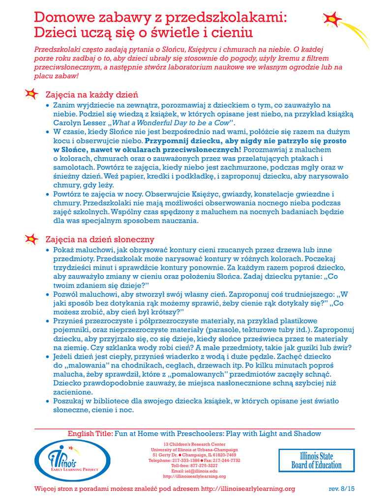 Domowe zabawy z przedszkolakami: Dzieci uczą się o świetle i cieniu Przedszkolaki często zadają pytania o Słońcu, Księżycu i chmurach na niebie. O każdej porze roku zadbaj o to, aby dzieci ubrały się stosownie do pogody, użyły kremu z filtrem przeciwsłonecznym, a następnie stwórz laboratorium naukowe we własnym ogrodzie lub na placu zabaw! Zajęcia na każdy dzień Zanim wyjdziecie na zewnątrz, porozmawiaj z dzieckiem o tym, co zauważyło na niebie. Podziel się wiedzą z książek, w których opisane jest niebo, na przykład książką Carolyn Lesser „What a Wonderful Day to be a Cow”. W czasie, kiedy Słońce nie jest bezpośrednio nad wami, połóżcie się razem na dużym kocu i obserwujcie niebo. Przypomnij dziecku, aby nigdy nie patrzyło się prosto w Słońce, nawet w okularach przeciwsłonecznych! Porozmawiaj z maluchem o kolorach, chmurach oraz o zauważonych przez was przelatujących ptakach i samolotach. Powtórz te zajęcia, kiedy niebo jest zachmurzone, podczas mgły oraz w śnieżny dzień. Weź papier, kredki i podkładkę, i zaproponuj dziecku, aby narysowało chmury, gdy leży. Powtórz te zajęcia w nocy. Obserwujcie Księżyc, gwiazdy, konstelacje gwiezdne i chmury. Przedszkolaki nie mają możliwości obserwowania nocnego nieba podczas zajęć szkolnych. Wspólny czas spędzony z maluchem na nocnych badaniach będzie dla was specjalnym sposobem nauczania. Zajęcia na dzień słoneczny Pokaż maluchowi, jak obrysować kontury cieni rzucanych przez drzewa lub inne przedmioty. Przedszkolak może narysować kontury w różnych kolorach. Poczekaj trzydzieści minut i sprawdźcie kontury ponownie. Za każdym razem poproś dziecko, aby zauważyło zmiany w cieniu oraz położeniu Słońca. Zadaj dziecku pytanie: „Co twoim zdaniem się dzieje?” Pozwól maluchowi, aby stworzył swój własny cień. Zaproponuj coś trudniejszego: „W jaki sposób bez dotykania rąk możemy sprawić, żeby cienie rąk dotykały się?” „Co możesz zrobić, aby cień był krótszy?” Przynieś przezroczyste i półprzezroczyste materiały, na przykład plastikowe pojemniki, oraz nieprzezroczyste materiały (parasole, tekturowe tuby itd.). Zaproponuj dziecku, aby przyjrzało się, co się dzieje, kiedy słońce prześwieca przez te materiały na ziemię. Czy szklanka wody robi cień? A małe przedmioty, takie jak guziki lub żwir? Jeżeli dzień jest ciepły, przynieś wiaderko z wodą i duże pędzle. Zachęć dziecko do „malowania” na chodnikach, cegłach, drzewach itp. Po kilku minutach poproś malucha, żeby sprawdził, które z „pomalowanych” przedmiotów zaczęły schnąć. Dziecko prawdopodobnie zauważy, że miejsca nasłonecznione schną szybciej niż zacienione. Poszukaj w bibliotece dla swojego dziecka książek, w których opisane jest światło słoneczne, cienie i noc. English Title: Fun at Home with Preschoolers: Play with Light and Shadow Early Learning Project 13 Children’s Research Center University of Illinois at Urbana-Champaign 51 Gerty Dr.Champaign, IL 61820-7469 Telephone: 217-333-1386Fax: 217-244-7732 Toll-free: 877-275-3227 Email: [email protected] http://illinoisearlylearning.org Illinois State Board of Education Więcej stron z poradami możesz znaleźć pod adresem http://illinoisearlylearning.org rev. 8/15