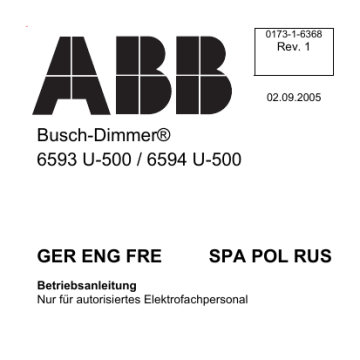 sel 0173-1-6368 Rev. 1 02.09.2005 Busch-Dimmer® 6593 U-500 / 6594 U-500 Pos: 1 /7x7/Sprache der Doku/Sprache der Doku 7x7 g-e-f-d-e-pl-rus @ 0\mod220_1.doc @ 1163 GER ENG FRE SPA POL RUS Pos: 2 /7x7/Art der Doku/Betriebsanleitung 7x7 @ 0\mod56_1.doc @ 1123 Betriebsanleitung Nur für autorisiertes Elektrofachpersonal Pos: 3 /Fuer alle Dokumente/Seitenwechsel @ 0\mod53_1.doc @ 1171 Pos: 4 /7x7/Inhaltsverzeichnis/Inhaltsverzeichnis @ 0\mod240_1.doc @ 1859 GER.................................................. 3 ENG................................................ 35 FRE ................................................ 67 SPA ................................................ 99 POL .............................................. 135 RUS.............................................. 170 Pos: 5 /Fuer alle Dokumente/Seitenwechsel @ 0\mod53_1.doc @ 1171 Wichtige Hinweise GER 3 Pos: 6 /7x7/Inhalt/6593/6593-xxx_ger @ 8\mod_1240833484625_1.doc @ 41082 1 Wichtige Hinweise GER Arbeiten am 230 V Netz dürfen nur von Fachpersonal ausgeführt werden! Vor Montage, Demontage Netzspannung freischalten! Durch Nichtbeachtung von Installations- und Bedienungs-hinweisen können Brand und andere Gefahren entstehen! Die Dimmer werden in eine UP-Dose nach DIN 49073-1 eingebaut. Universal-Zentraldimmer und Leistungsbaustein erwärmen sich bei Betrieb, da ein Teil der Anschlussleistung als Verlustleistung in Wärme umgesetzt wird. Steigt während des Betriebes die Umgebungstemperatur über 35 °C, muss die Anschlussleistung entsprechend dem Diagramm (Fig. 1) vermindert werden. Bei 50 °C Umgebungstemperatur fällt die zulässige Leistung auf 57% ; bei 60 °C auf 28%. Wichtige Hinweise GER 4 Der Anschluss der Dimmer kann je nach Anwendung entsprechend den Anschlussbildern Fig. 2 und Fig. 3 erfolgen. Konventionelle Transformatoren Beim Betrieb von konventionellen Transformatoren muss jeder Trafo nach Herstellerangaben primärseitig abgesichert werden. Es sind nur Sicherheitstransformatoren nach DIN VDE 0551 zu verwenden. Das Schalten der Last über einen seriellen Schaltkontakt ist nicht zulässig, da beim Wiedereinschalten Überströme und Überspannungen auftreten können, die eventuell zu einer Zerstörung des Dimmers führen. Der sekundärseitige Leerlauf von konventionellen Transformatoren ist weder bei Inbetriebnahme noch im Betrieb erlaubt. Betreiben Sie konventionelle Transformatoren immer mit der Trafonennlast. Um über den gesamten Stellbereich von Hell bis Dunkel die gleiche Helligkeit der Halogenlampen zu erreichen, Wichtige Hinweise GER 5 sollten Transformatoren mit gleicher Sekundärspannung und gleicher Leistung verwendet werden. Tasterbetrieb Bei Tasterbetrieb müssen die Phase der Nebenstelle und die Phase der Versorgungsspannung gleich sein. Bei Tasternebenstellen darf die Beleuchtungsglimmlampe nicht kontaktparallel angeschlossen werden (Taster mit NAnschluss verwenden). Bei der Leitungsverlegung ist genügend Abstand zwischen Steuer- und Lastleitungen einzuhalten (min. 5 cm). - Die maximale Leitungslänge der Taster Nebenstelle beträgt 100 m. - Eine Änderung der Leitungsführung bei vorhandenen Wechsel- und Kreuzschaltungen ist nicht erforderlich. Wichtige Hinweise GER 6 Funkentstörung Eine neuartige elektronische Funkentstörung ersetzt die bisher übliche Funkentstördrossel. Deshalb ist dieser Dimmer „geräuscharm“. Die Datenleitungen S und G sind als interne Verbindungsleitungen zu sehen und möglichst kurz zu verlegen (siehe Technische Daten). Leistungserweiterung Bei Betrieb mit dem Leistungsbaustein 6594U-xxx (siehe Fig. 3) müssen die gesteuerten Ausgänge verbunden werden, um alle Schutzfunktionen des Dimmersystems zu gewährleisten. Funktionen 2 GER Funktionen Universal-Zentraldimmer – Funktion - Phasenanschnitt/-abschnitt (lastabhängig) - Betriebsartenwahl über Stellrad Dunkelstart-Funktion Betriebsart Über das Stellrad sind folgende Funktionen wählbar: 1 Memory ein, Soft Ein / Aus inaktiv (Grundfunktion) 2 Memory ein, Soft Ein / Aus aktiv* 3 Memory aus, Soft Ein / Aus aktiv* 4 Memory ein, Soft Ein inaktiv, Soft Aus aktiv 5 Memory ein, Soft Ein aktiv, Soft Aus inaktiv* * nicht in Verbindung mit Busch-Wächter® Sensoren 7 Funktionen GER Leistungserweiterung - über Leistungsbaustein 6594U-xxx Schutzfunktionen - Einschaltstrombegrenzung durch Softstart Elektronischer Überlast- Übertemperaturschutz Elektronischer Kurzschlussschutz Temperatursicherung Lasten - Glühlampen 230 V-Halogenlampen Niedervolt-Halogenlampen über Busch-ElektronikTransformatoren Niedervolt-Halogenlampen über konventionelle Transformatoren Konventionelle Transformatoren und BuschElektronik-Transformatoren dürfen nicht zusammen gedimmt werden. Alle anderen Lastkombinationen sind zulässig. 8 Funktionen GER Berechnung der Nennleistung Verwenden Sie bitte folgende Formel: Nennleistung = Transformatorverluste* + Leuchtmittelleistung * bei elektronischen Trafos 5% der Trafonennleistung * bei konventionellen Trafos 20% der Trafonennleistung 9 Technische Daten 3 GER 10 Technische Daten Nennspannung: Nennstrom: Nennleistung: Mindestlast: Leistungserweiterun g: Tastereingang: Max. Leitungslänge: 6593U-xxx: 230 V ~ ±10%, 50 Hz 6594U-xxx: 230 V ~ ±10%, 50 Hz 6593U-xxx: 1,83 A (UniversalZentraldimmer) 6594U-xxx: 1,37 A (Leistungsbaustein) 6593U-xxx: 420 W/VA 6594U-xxx: 315 W/ VA (abhängig von der Umgebungstemperatur (siehe Fig. 1) 6593U-xxx: 60 W/ VA 6594U-xxx: 400 W /VA max. 1 Leistungsbaustein 6594Uxxx 230 V ~ ±10%, 50 Hz 100 m Technische Daten Max. Gesamtleitungslänge zwischen den Steuerausgängen (S-S, G-G): Schutzart: Umgebungstemperaturbereich: GER von Gerät zu Gerät max. 30 cm IP 20 0 bis +35 °C 11 Derating 4 GER Derating Fig. 1 12 Anschluss 5 GER Anschluss Busch-Universal-Zentraldimmer mit Tasterbetrieb Fig. 2 6593U-xxx Der N-Anschluss ist nur in Sonderfällen (z. B. Geräuschentwicklung im ausgeschalteten Zustand erforderlich! Er hat keinen Einfluss auf Geräusche des angeschlossenen Transformato
